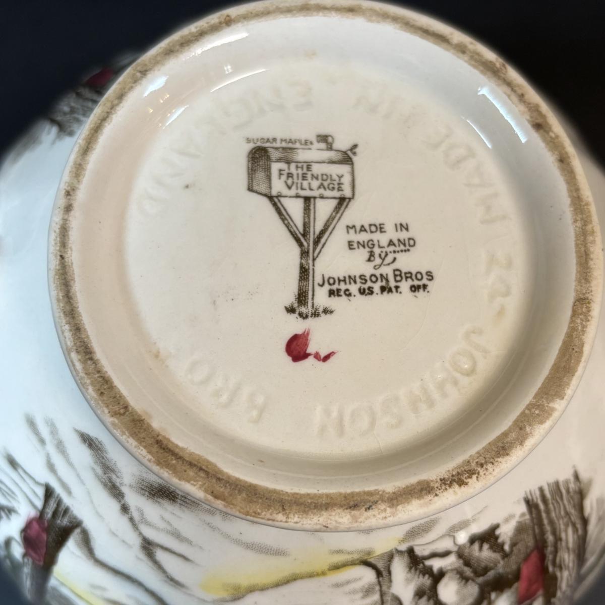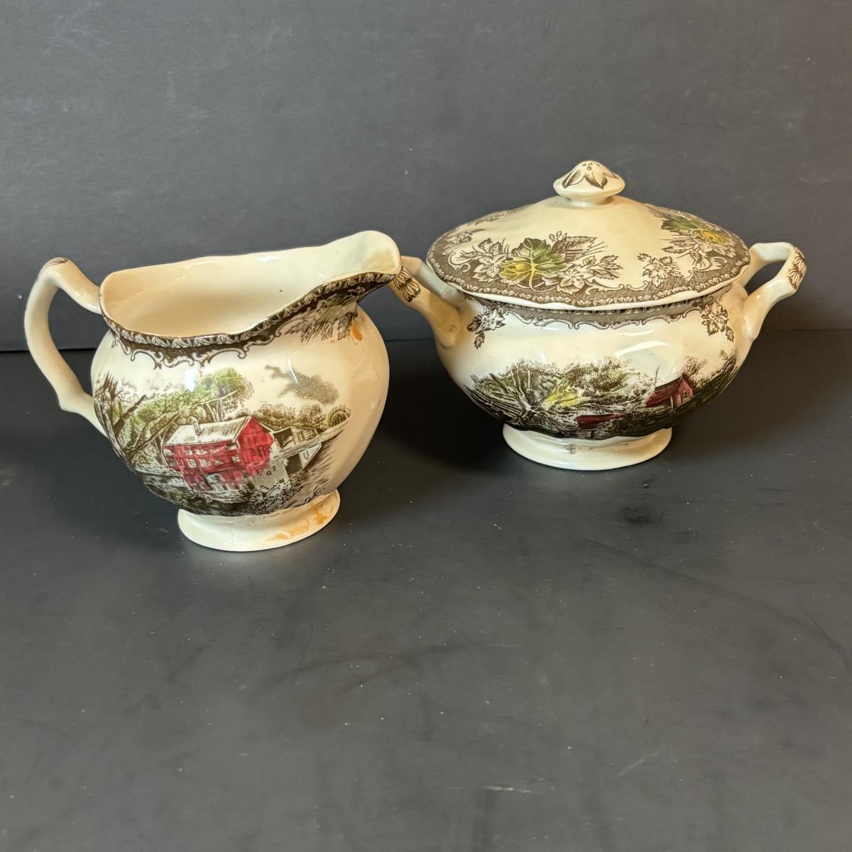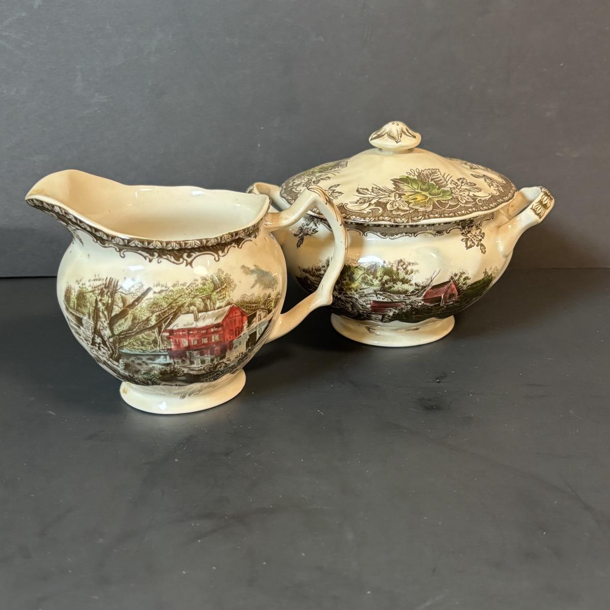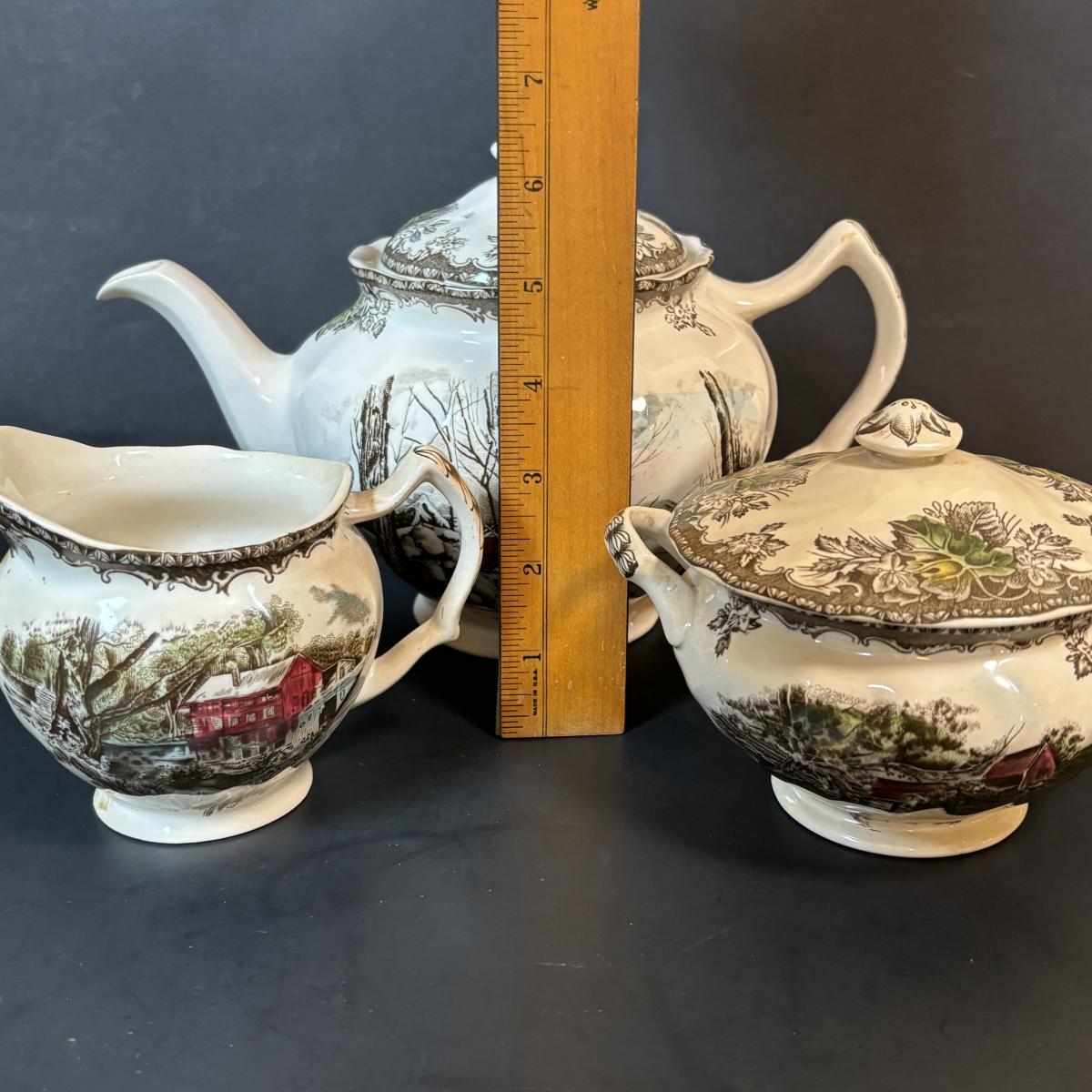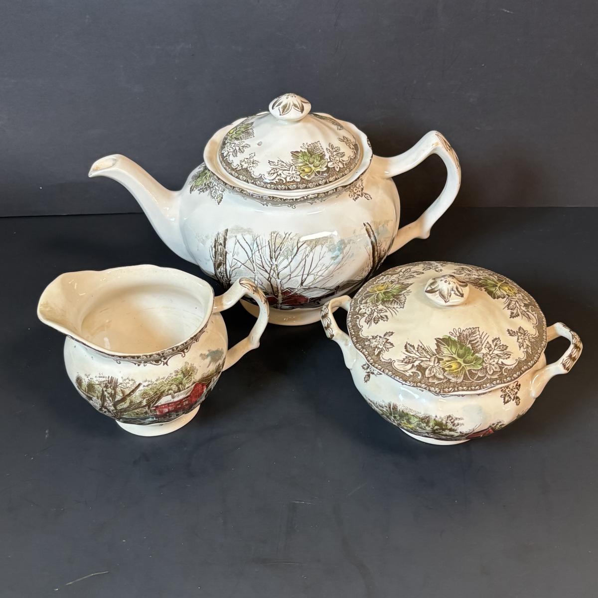 LOT 85: Johnson Bros. of England Ironstone Tea Pot, Sugar Bowl & Creamer Dishware: The Friendly Village Collection