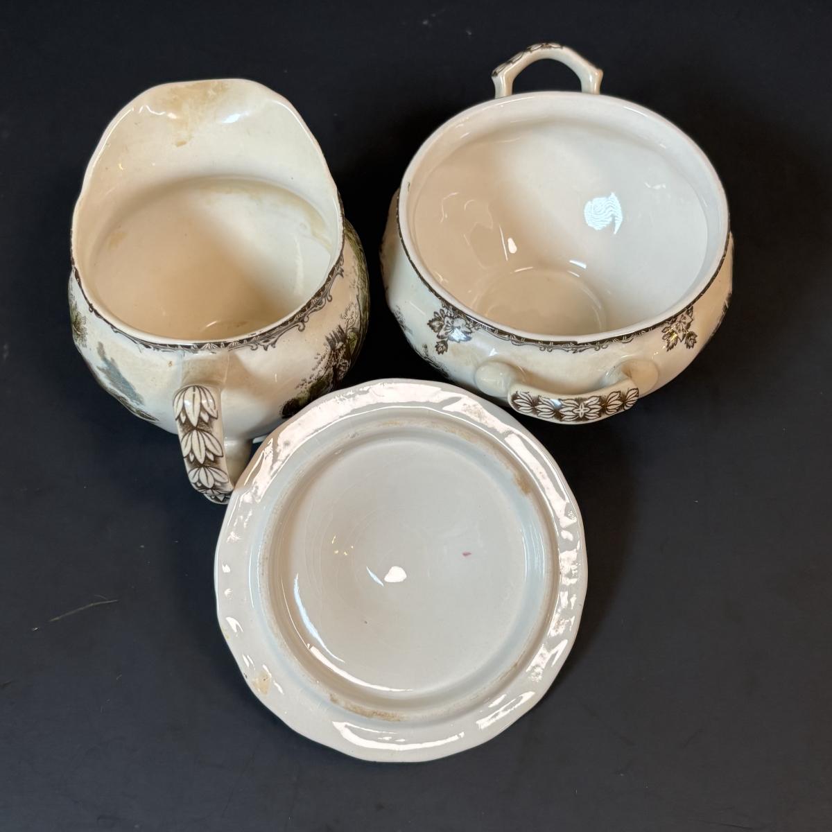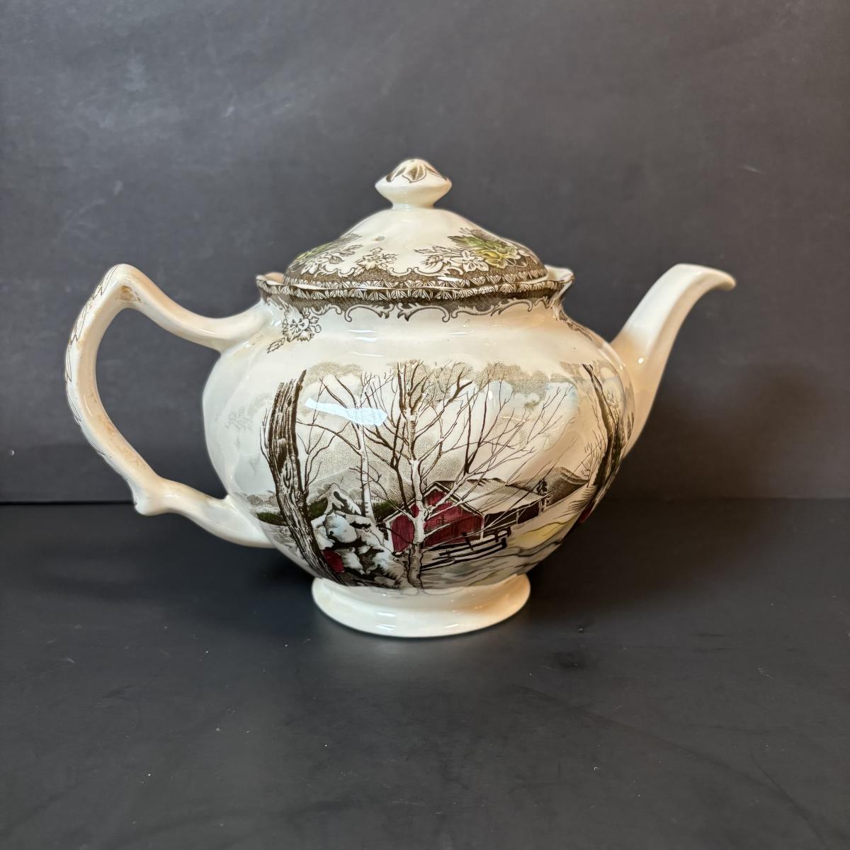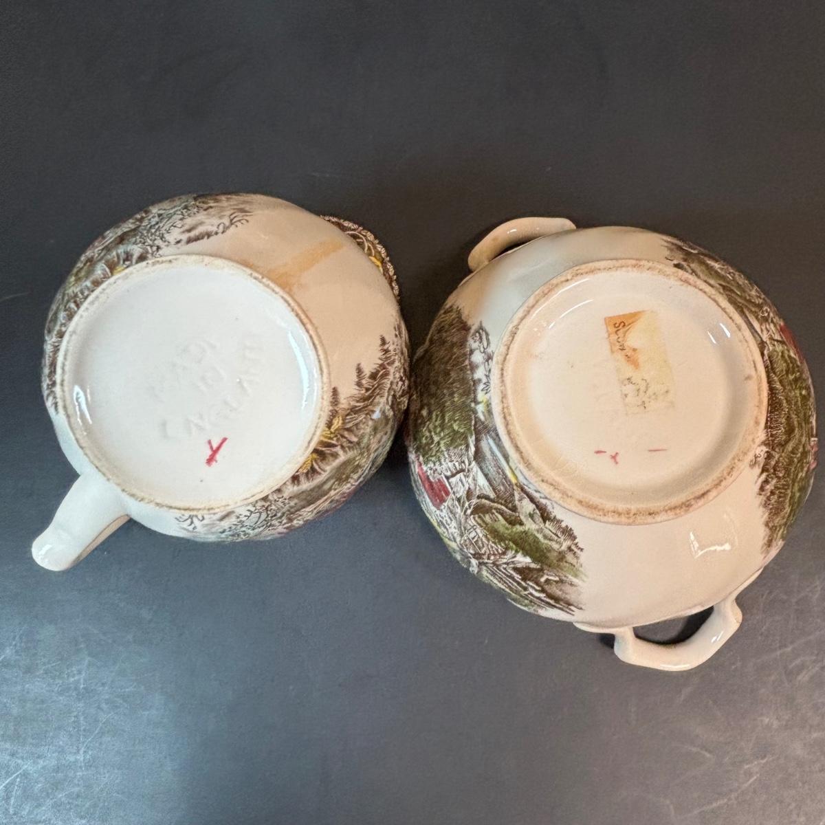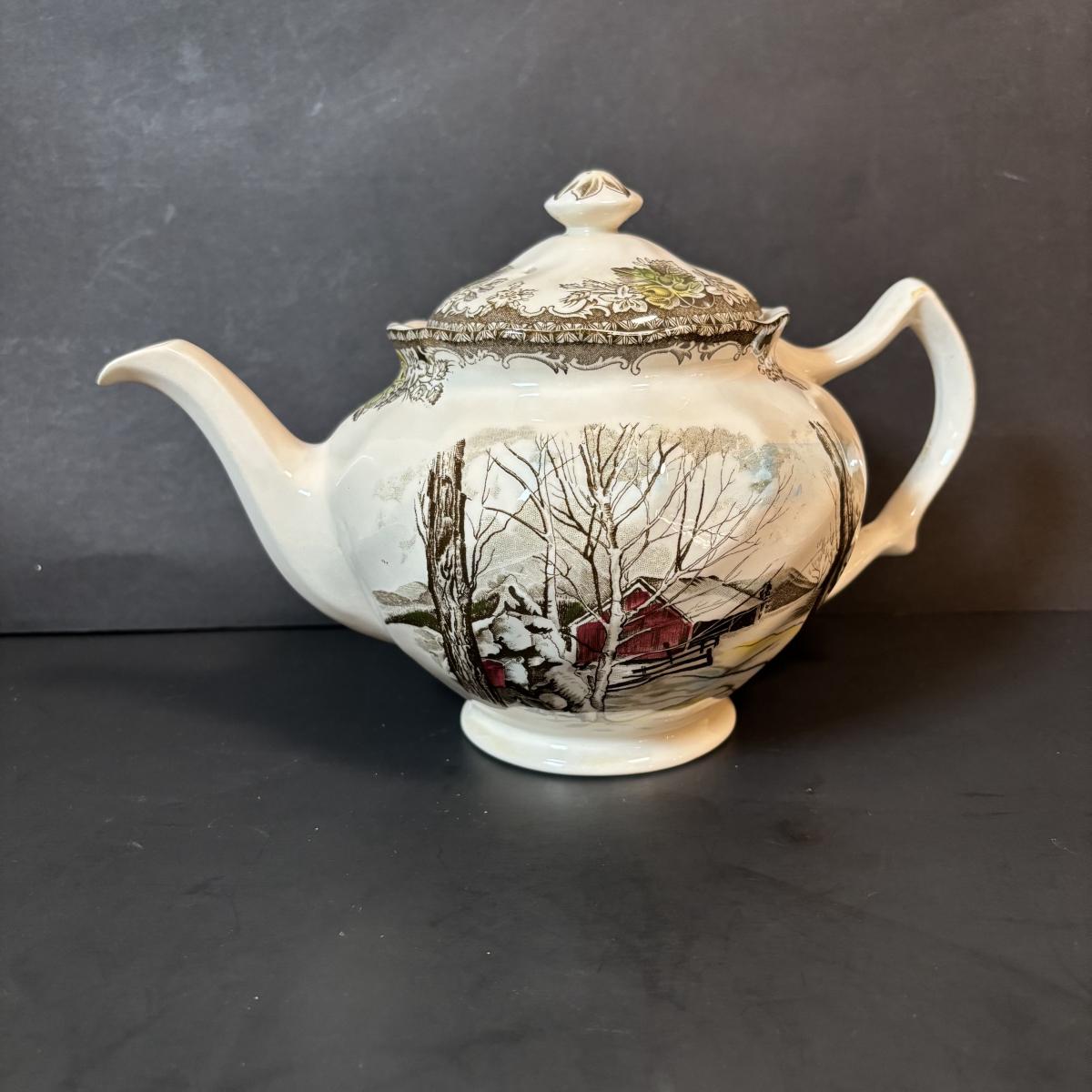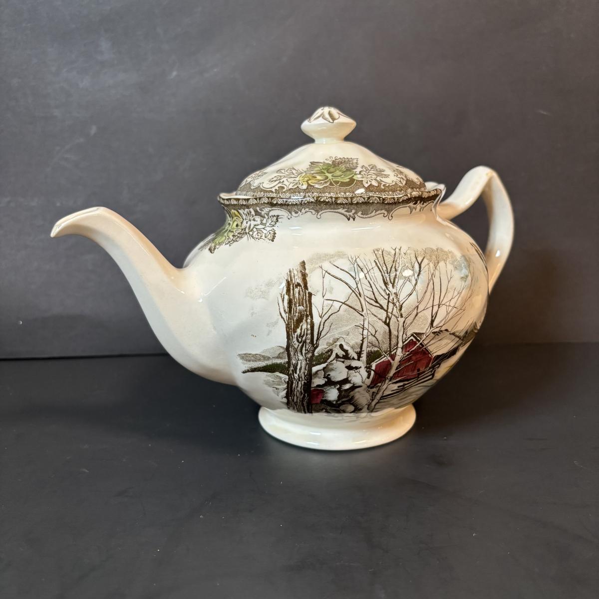 LOT 85: Johnson Bros. of England Ironstone Tea Pot, Sugar Bowl & Creamer Dishware: The Friendly Village Collection
