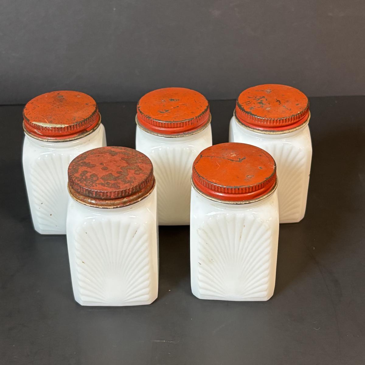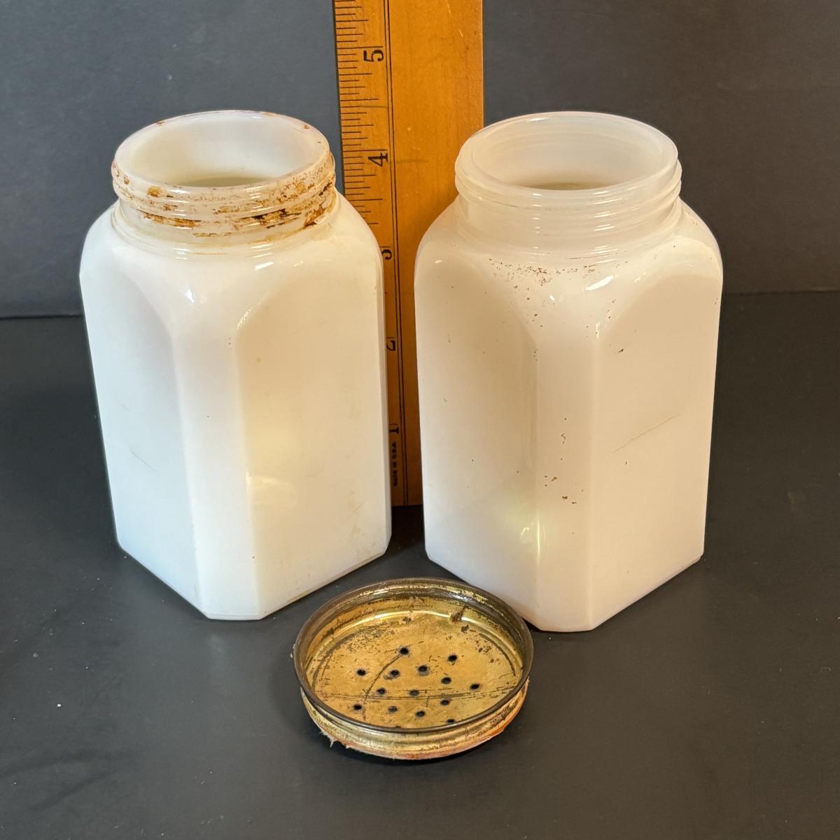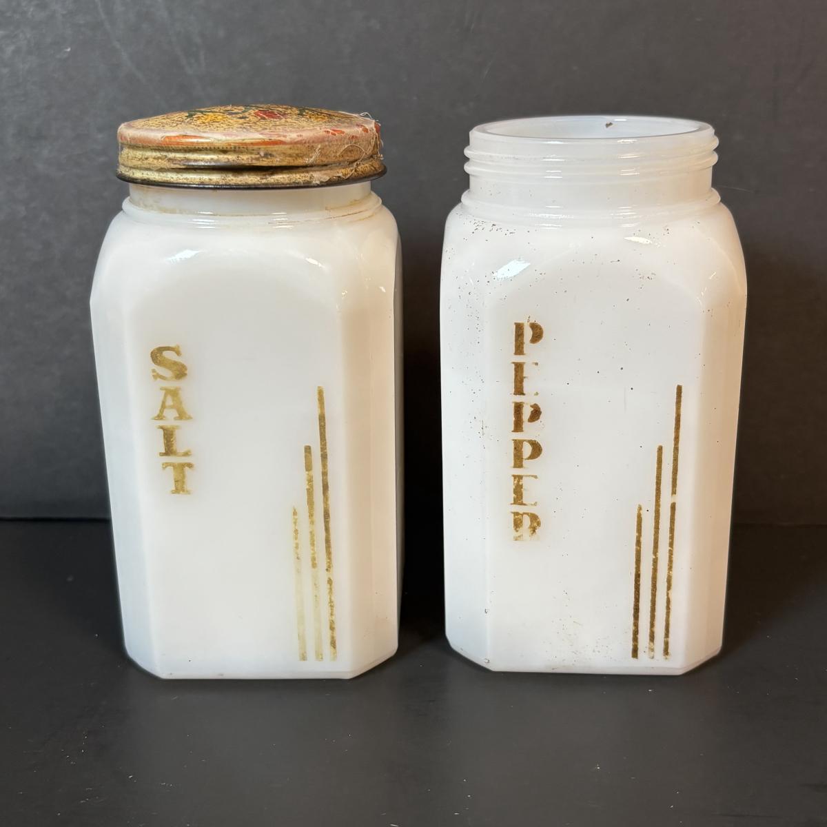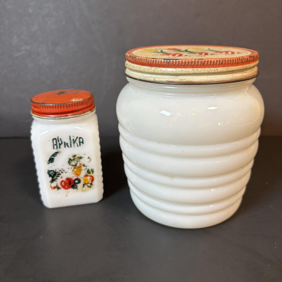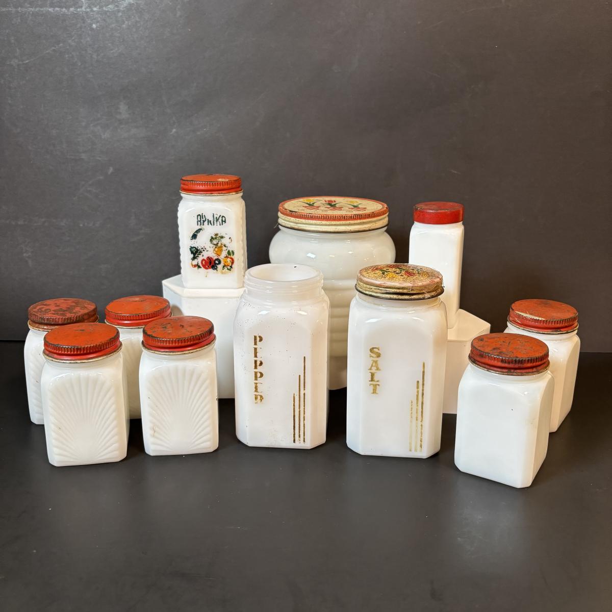 LOT 87: Vintage Milk Glass Salt/Pepper Shakers, Spice Jars and Beehive Grease Jar