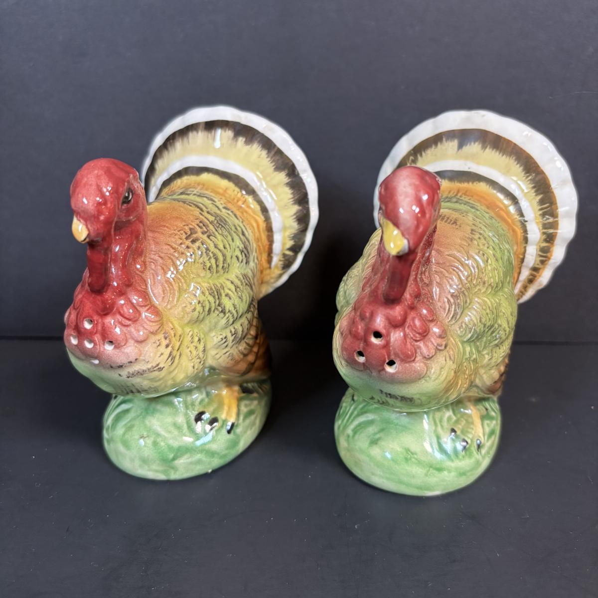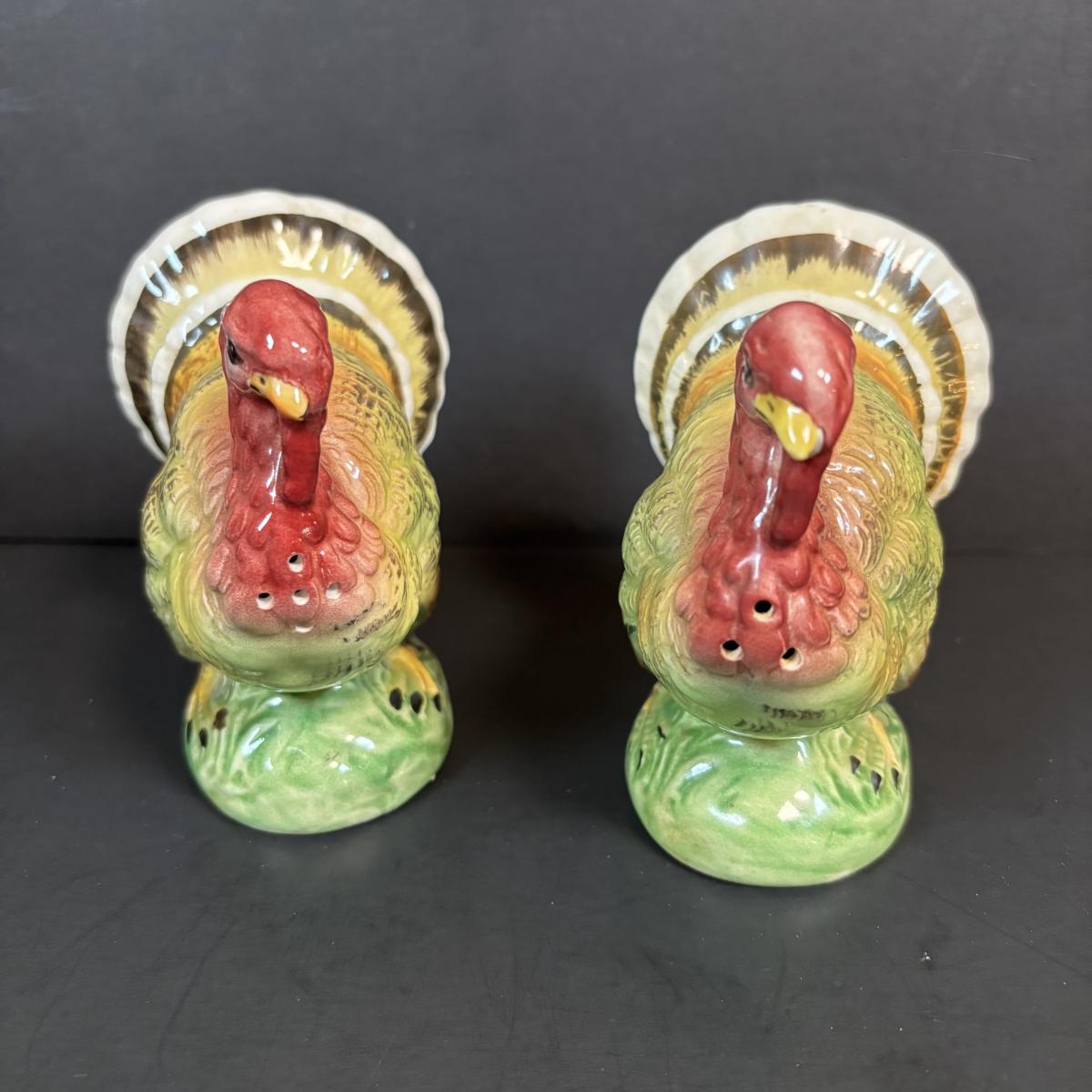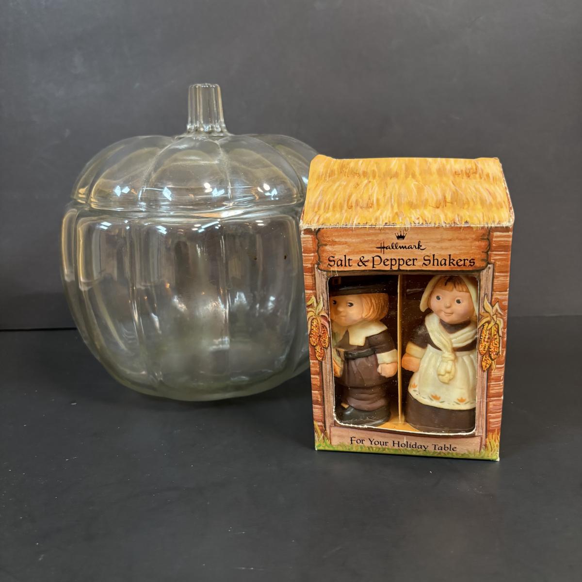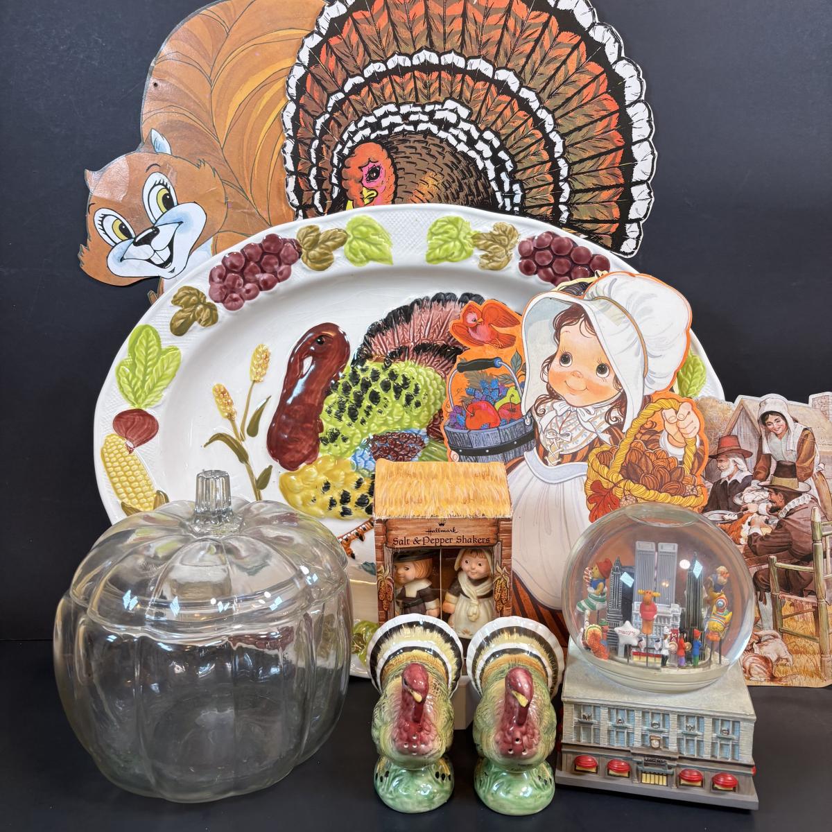 LOT 98: Fall Collection: Paper Decorations, Macy's Day Parade Musical Snow Globe, Lefton Turkey Salt/Pepper Shakers, Glass Pumpkin