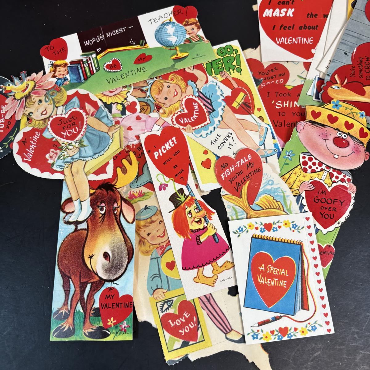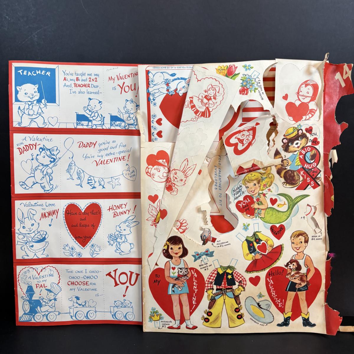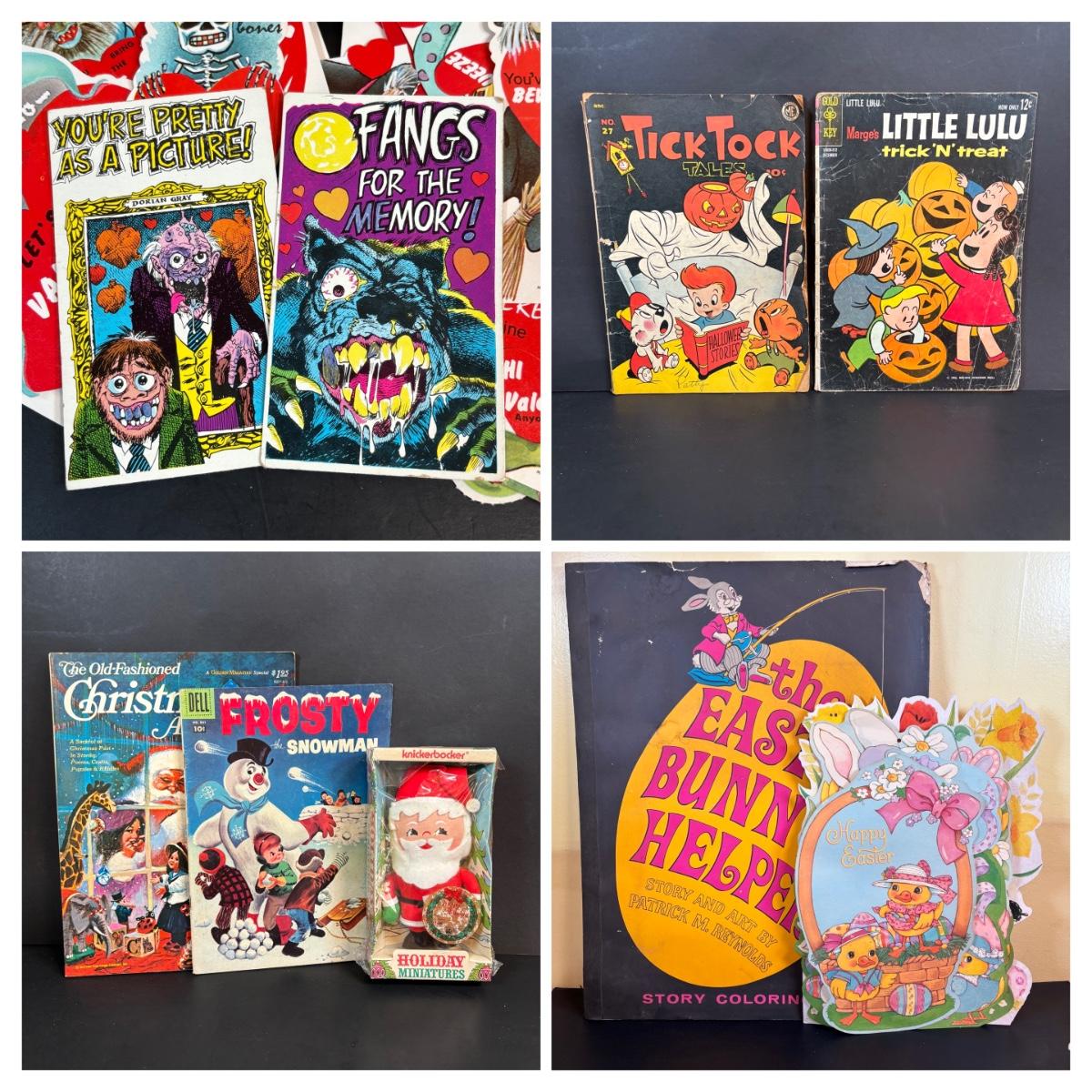 LOT 100: Fun Collection of Holiday Decorations or Paper Crafting: Vintage Valentines Cards, Insult Postcards, Halloween Comics, Giant Easter Coloring Book, Frosty the Snowman Comic