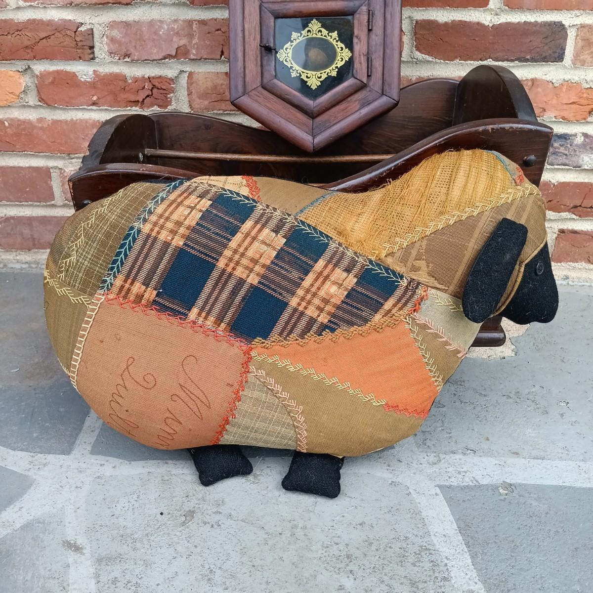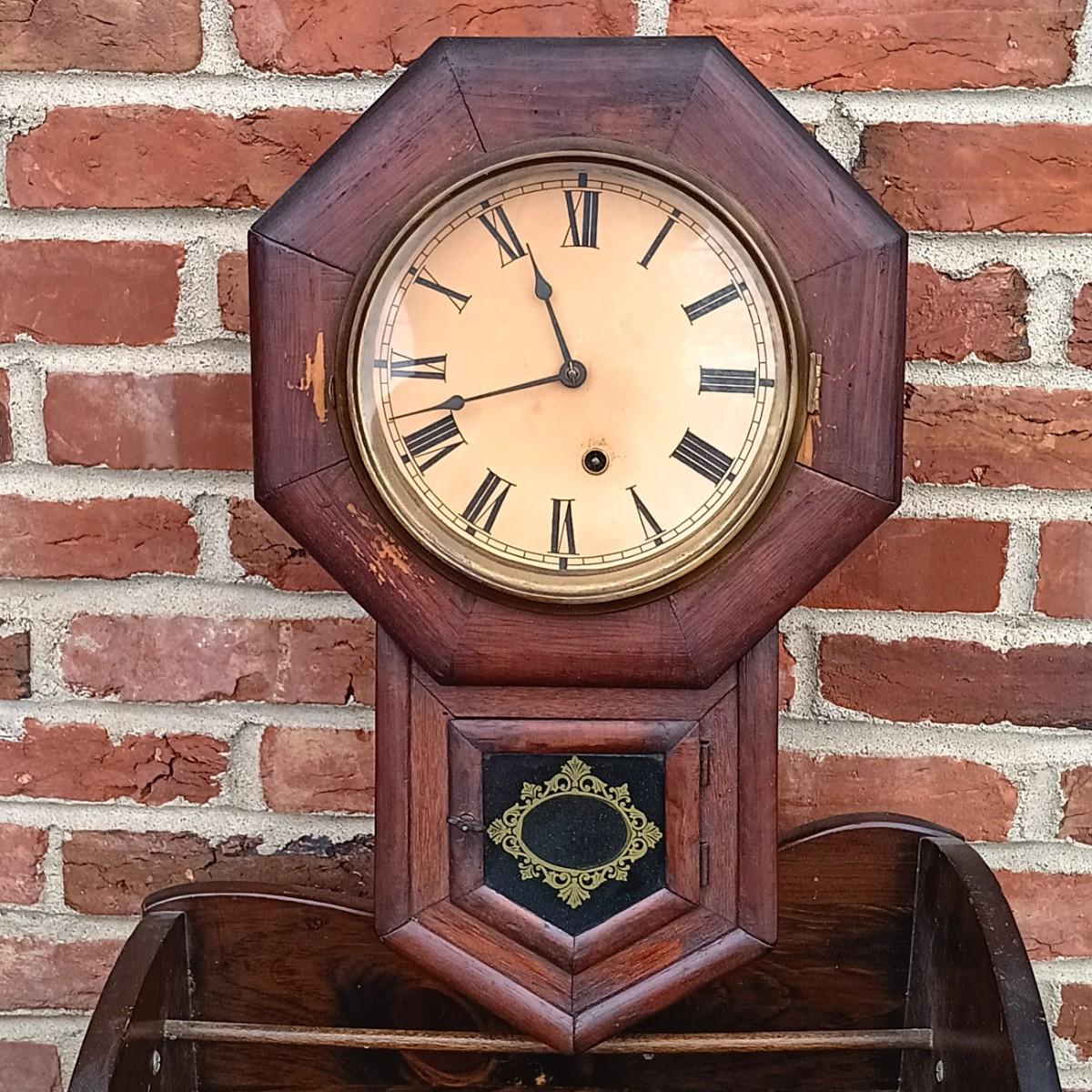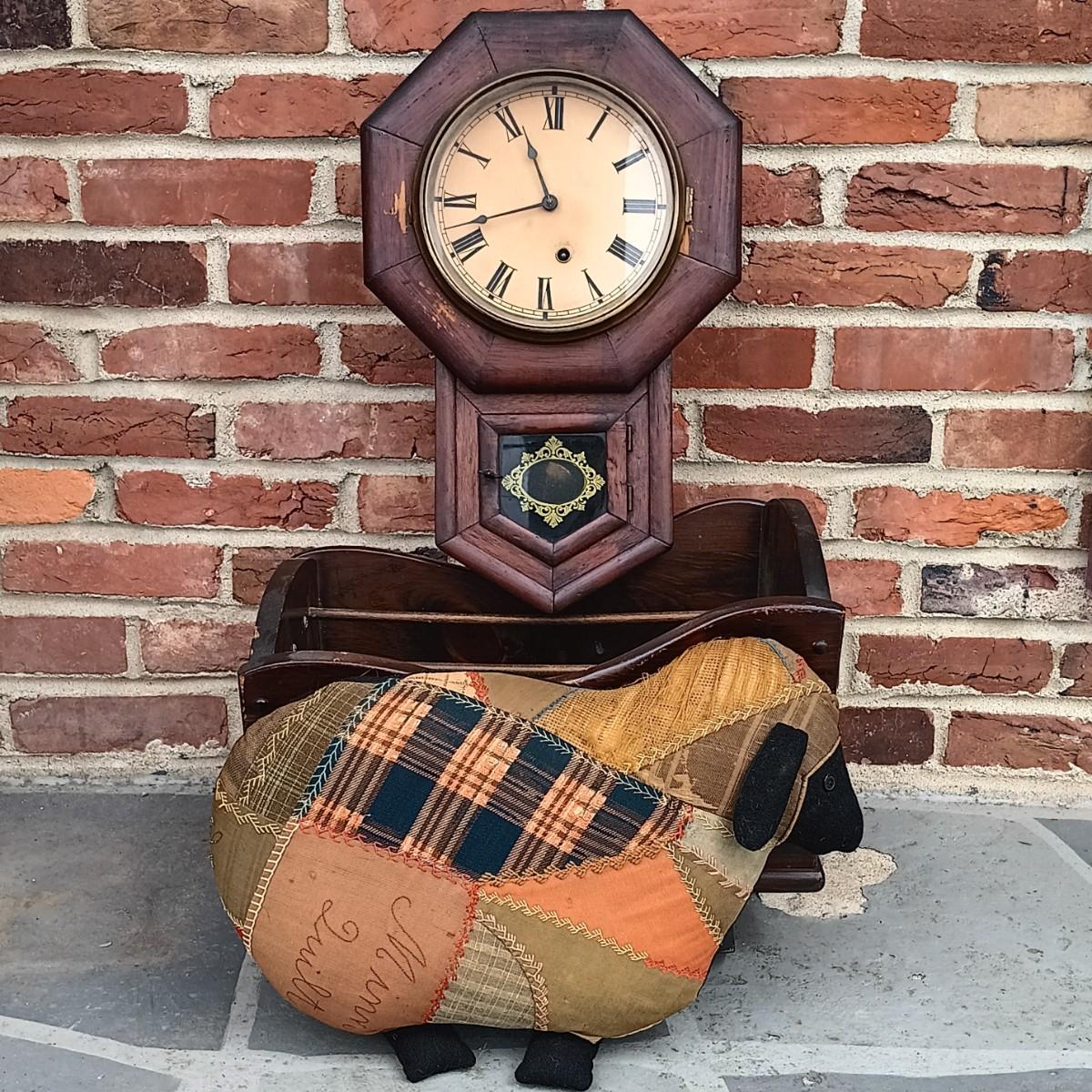 LOT 223: Ansonia Clock Co. Drop Clock w/ Vintage Magazine Cradle & Quilted Sheep Pillow