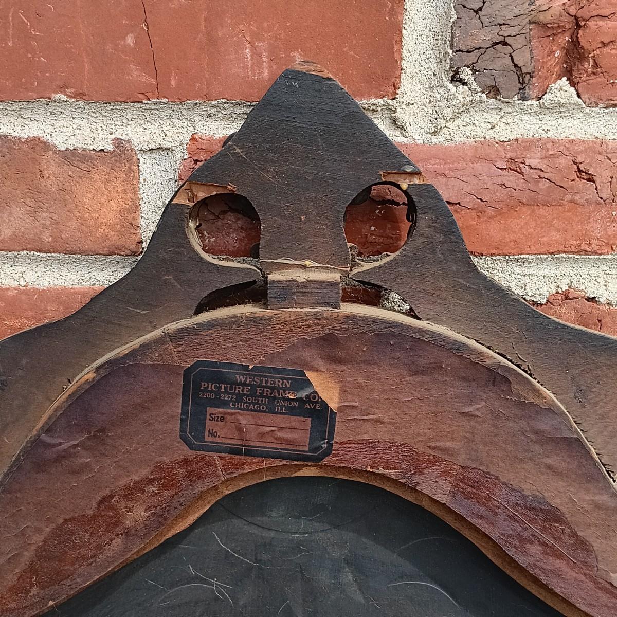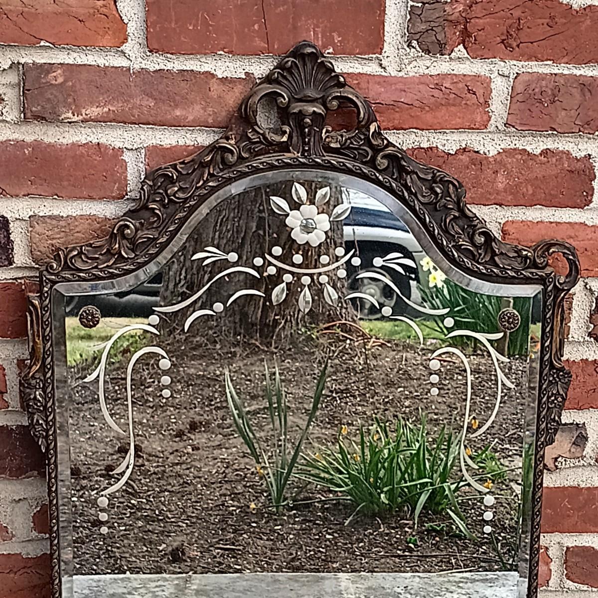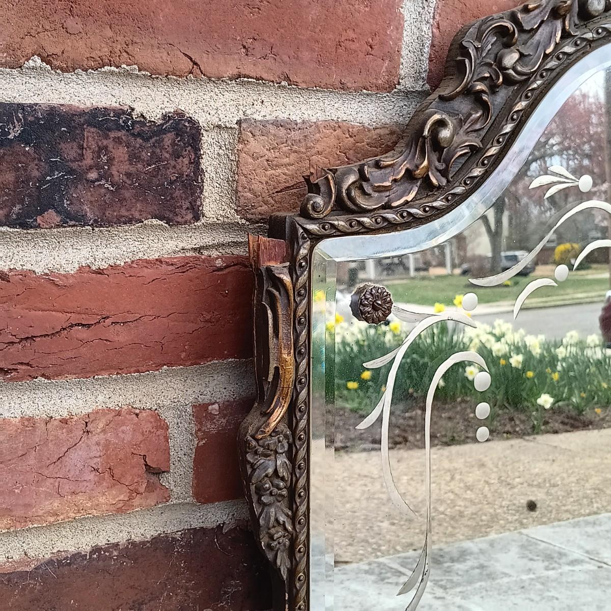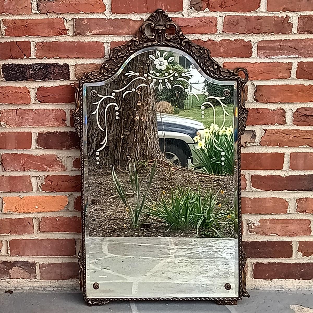 LOT 225: Antique Western Picture Frame Co. Etched Glass Mirror with Carved Wooden Frame