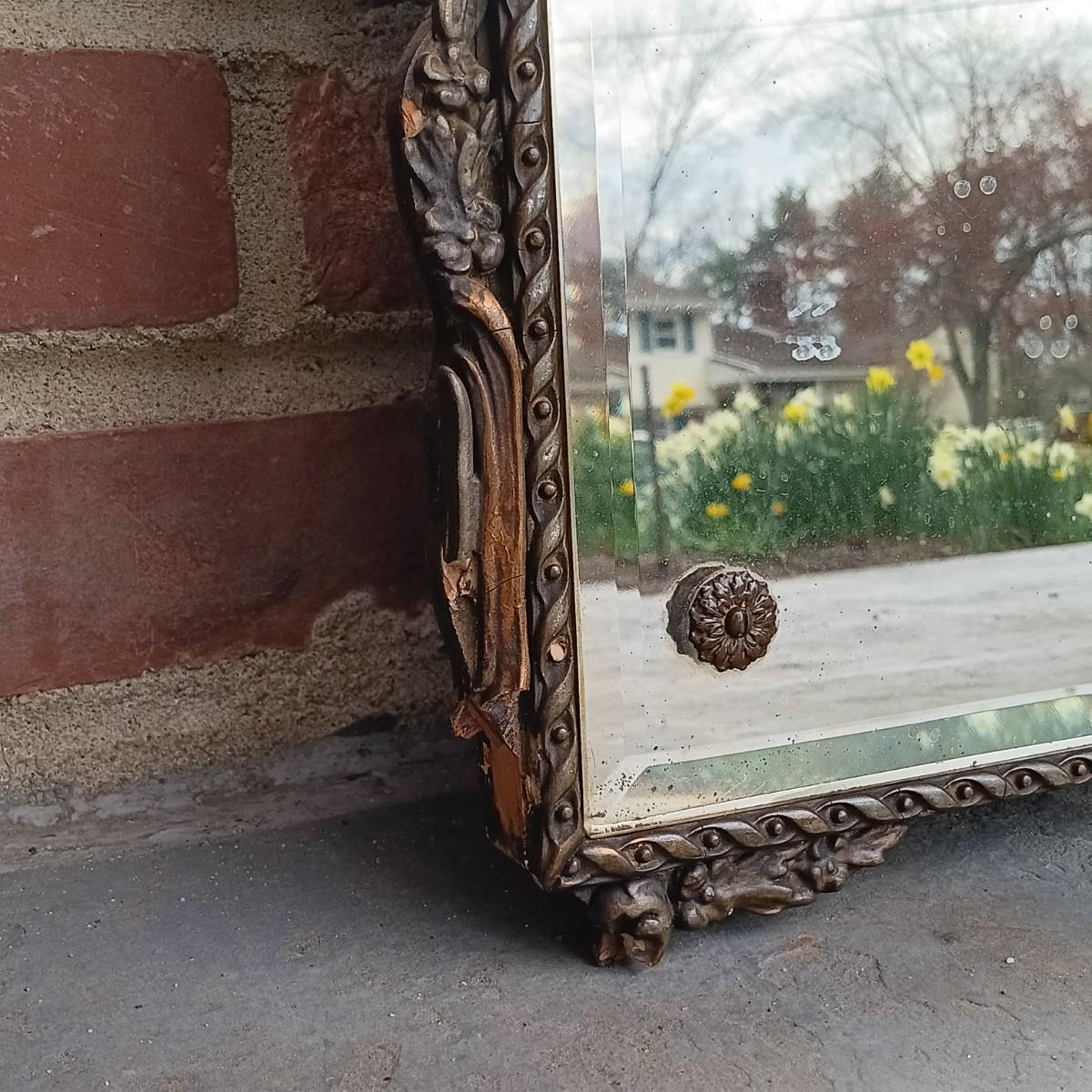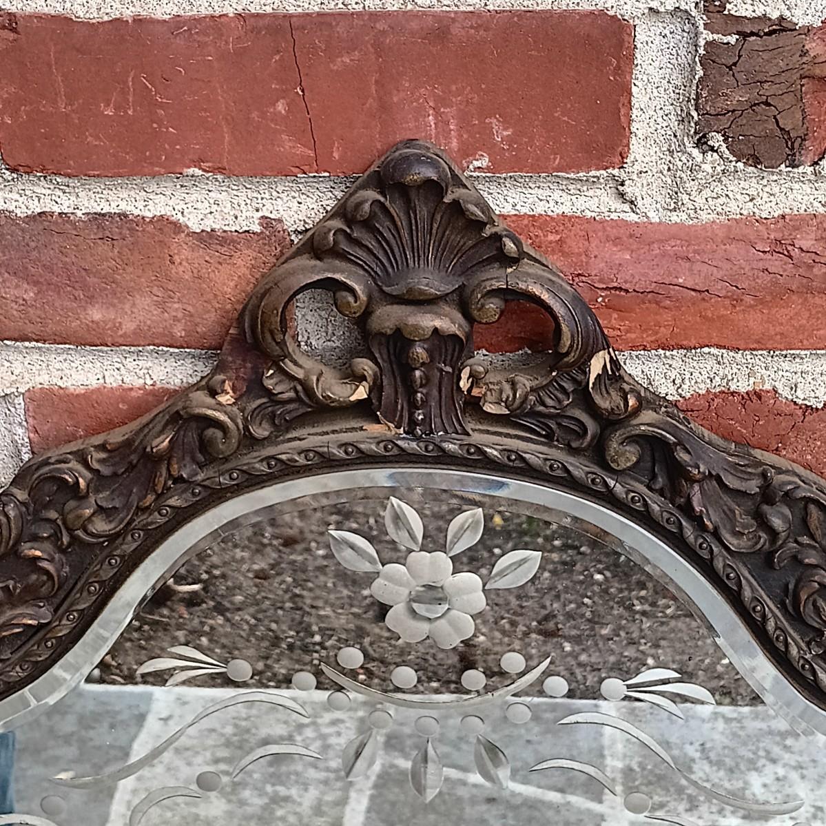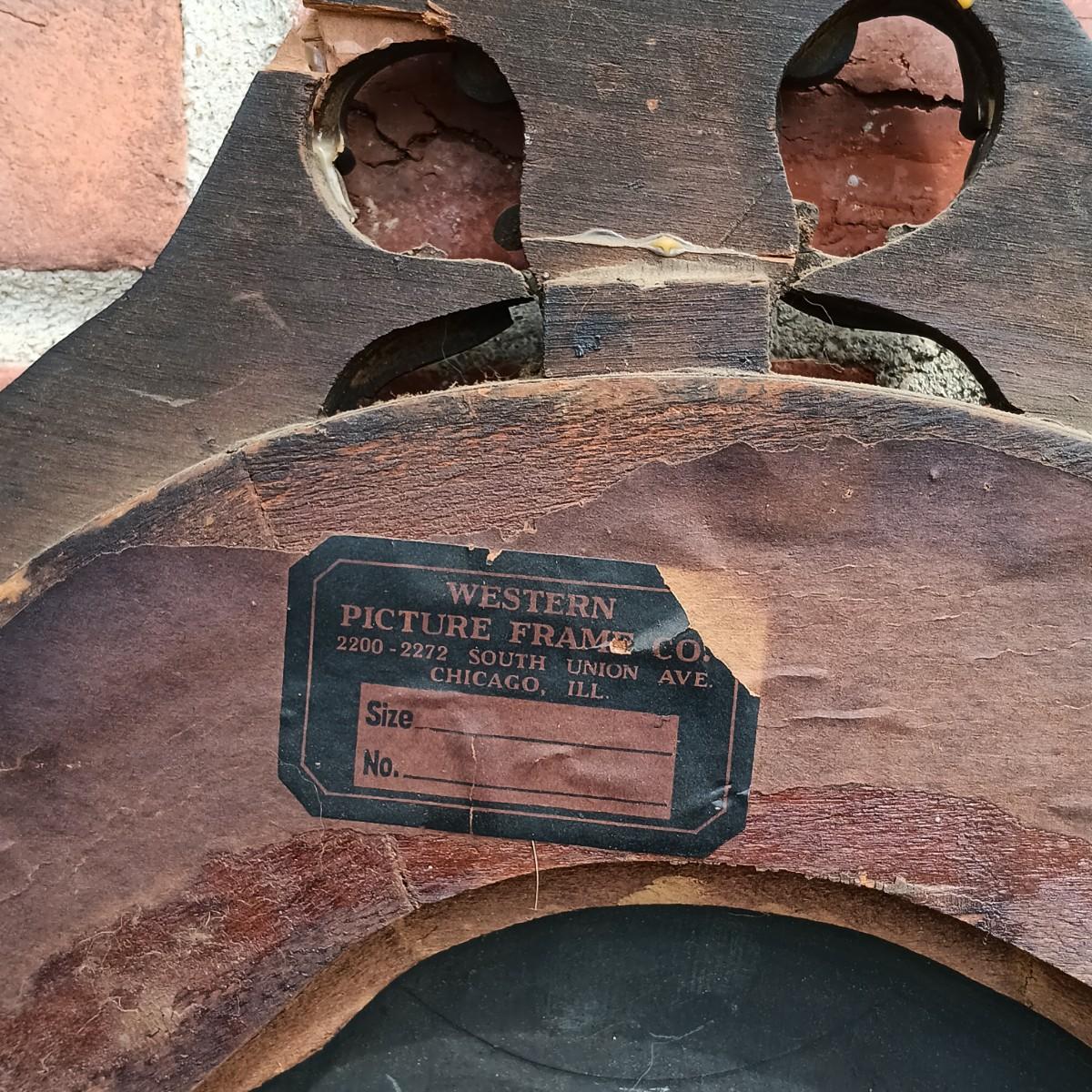 LOT 225: Antique Western Picture Frame Co. Etched Glass Mirror with Carved Wooden Frame