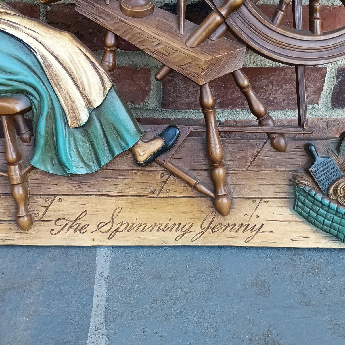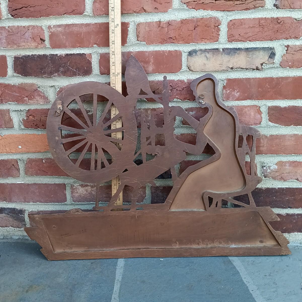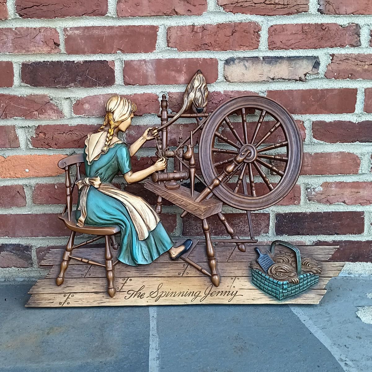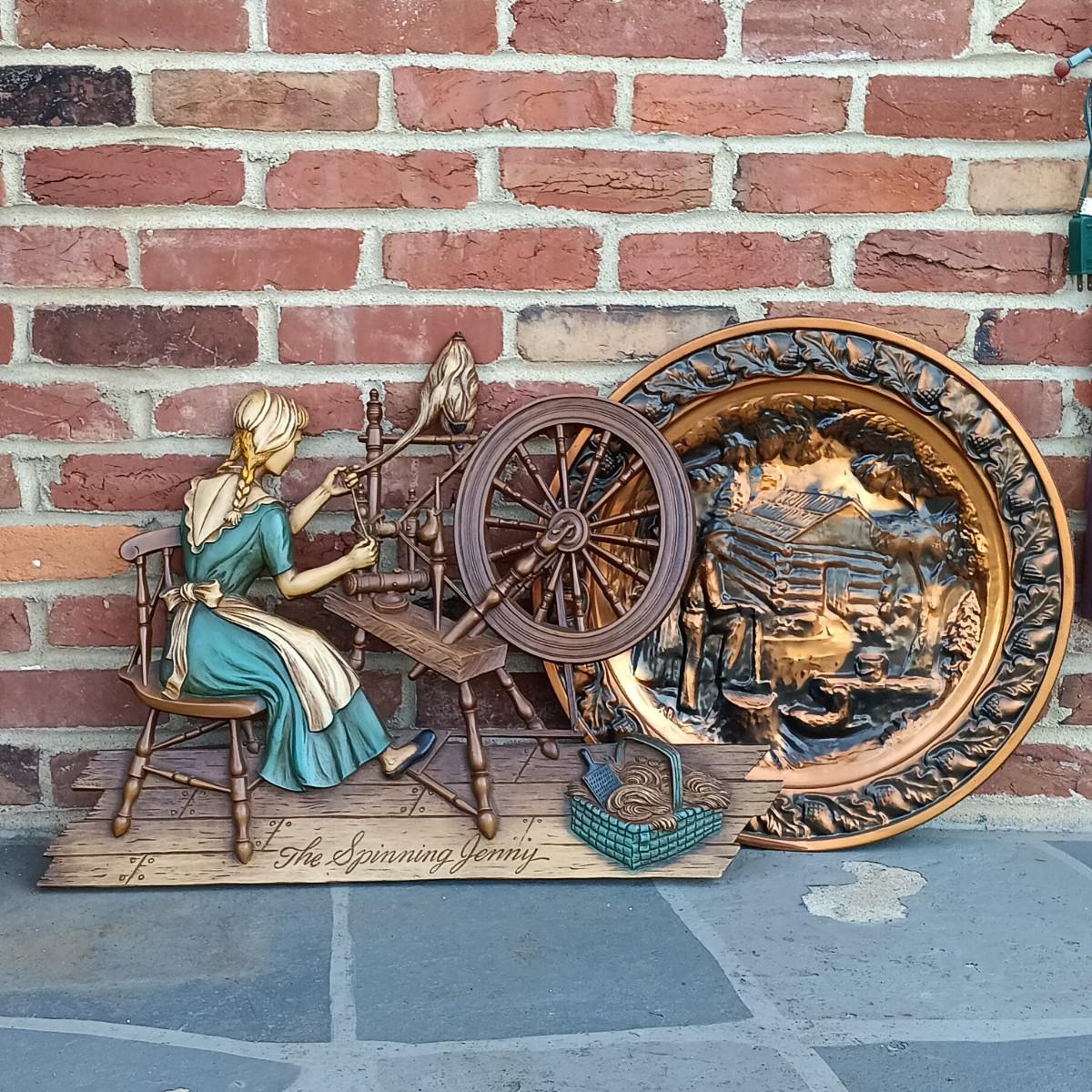 LOT 242: Vintage Syroco 'The Spinning Jenny' Wall Plaque w/ Coppercraft Guild Taunton, MA Decorative Plate