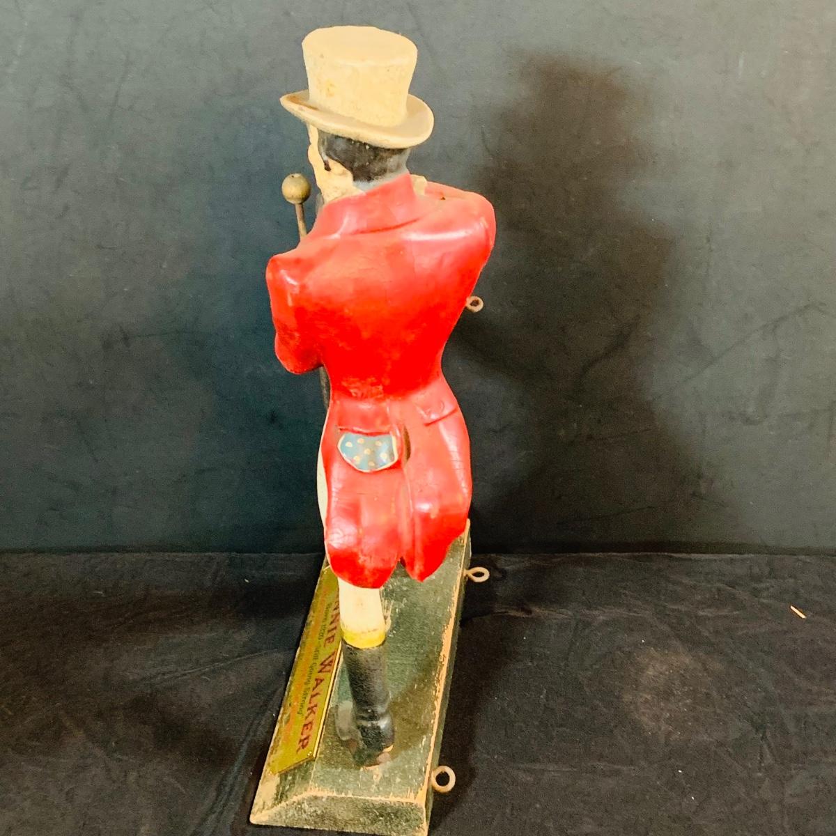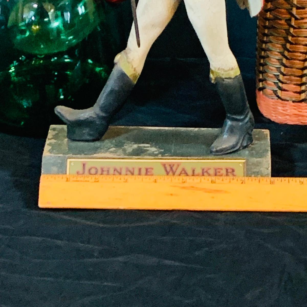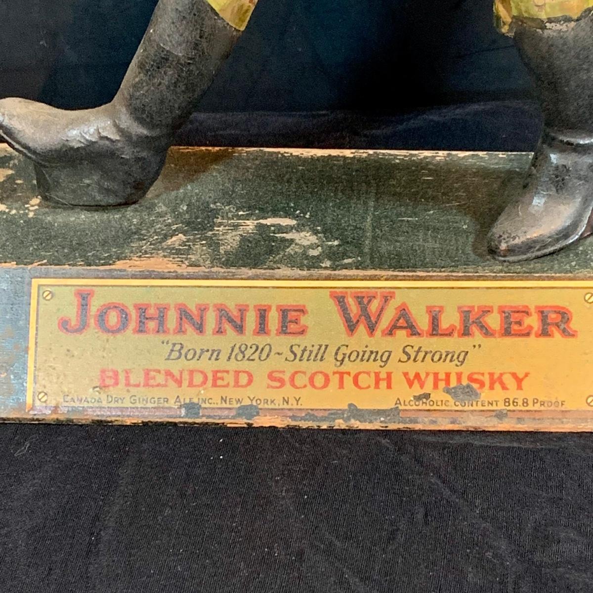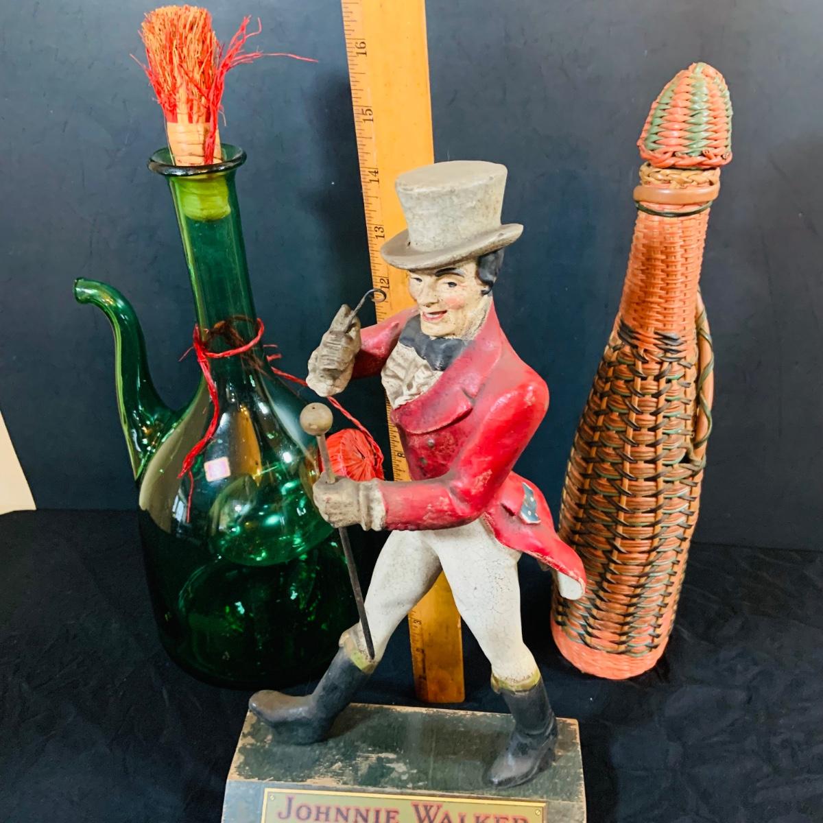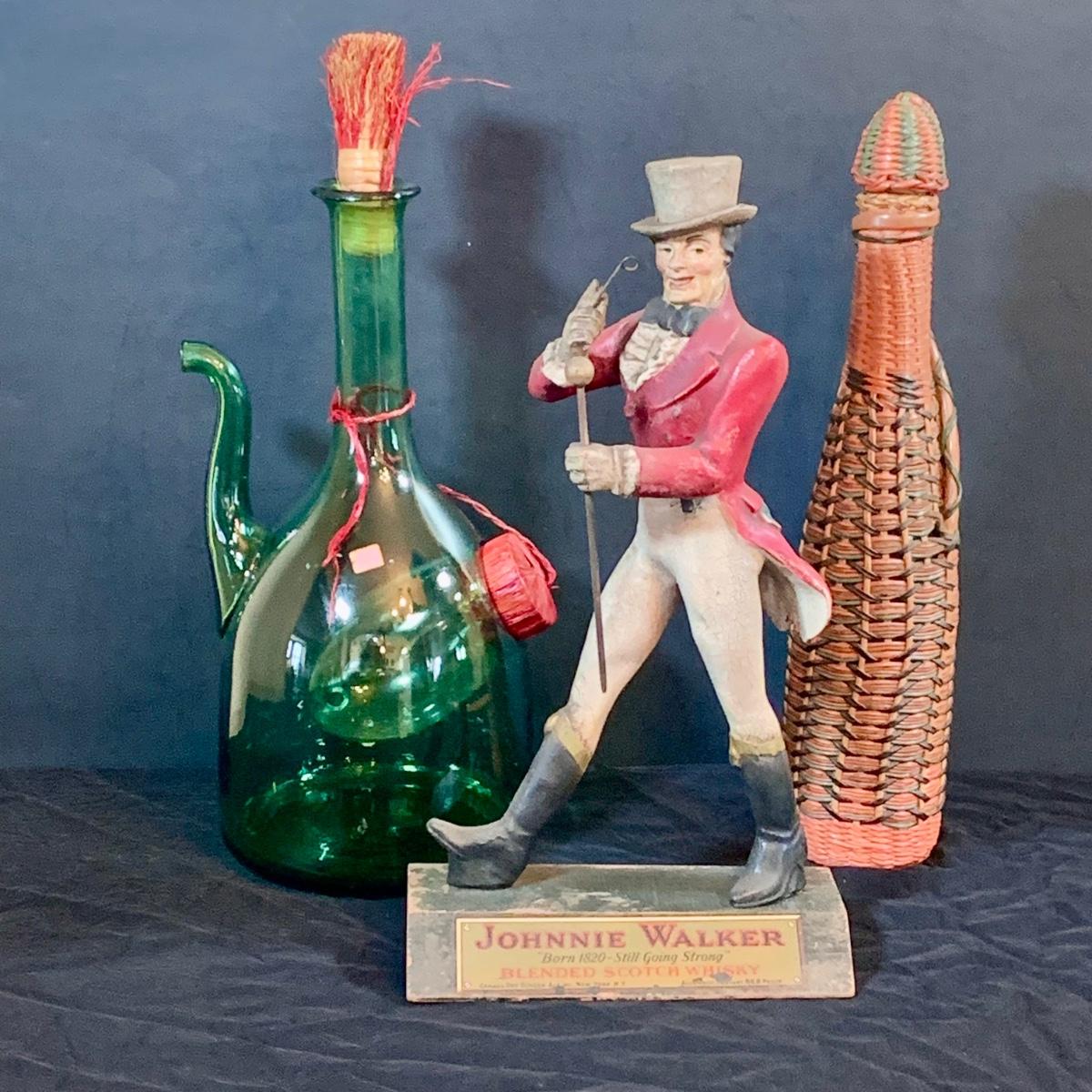 LOT 247: For the Bar Collection Featuring an Antique/Vintage Johnnie Walker Scotch Wooden Walking Man Display Figurine and Two (2) Decanters