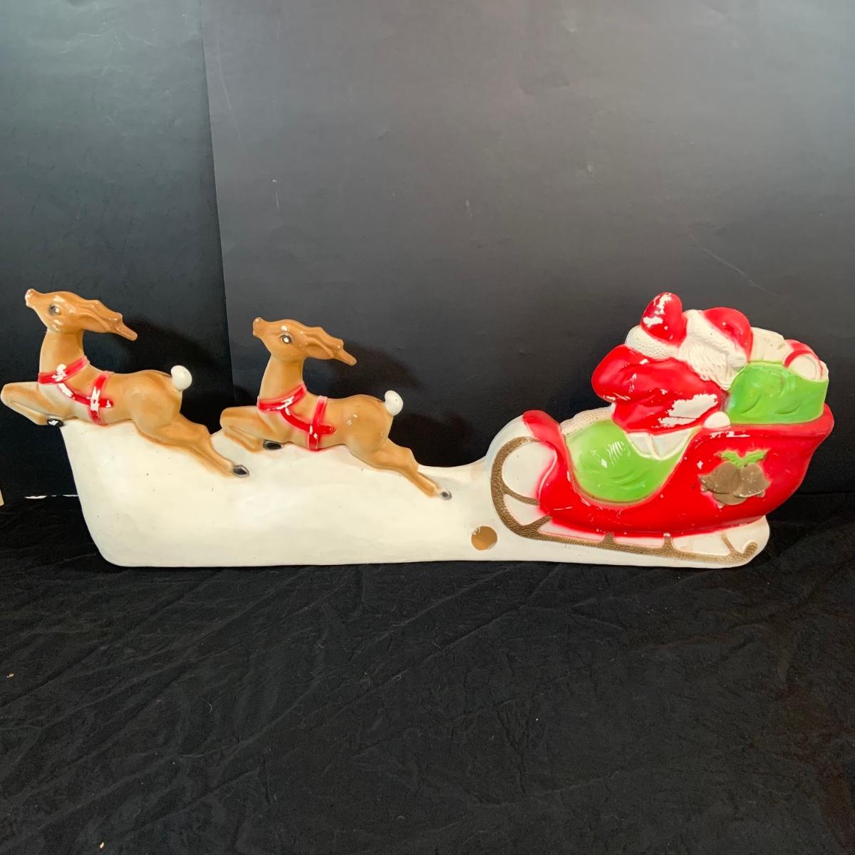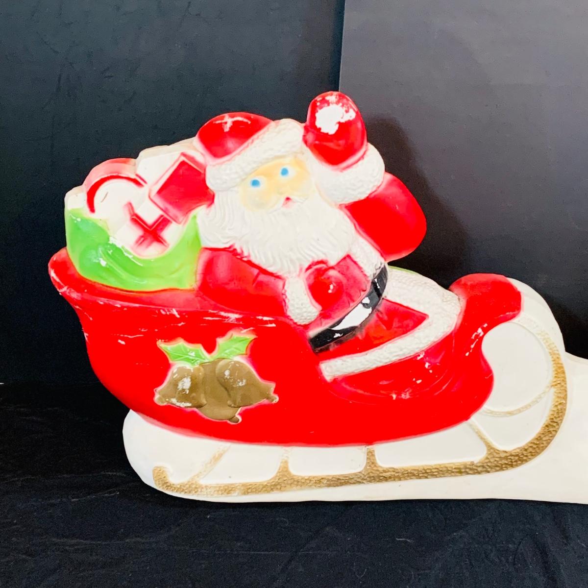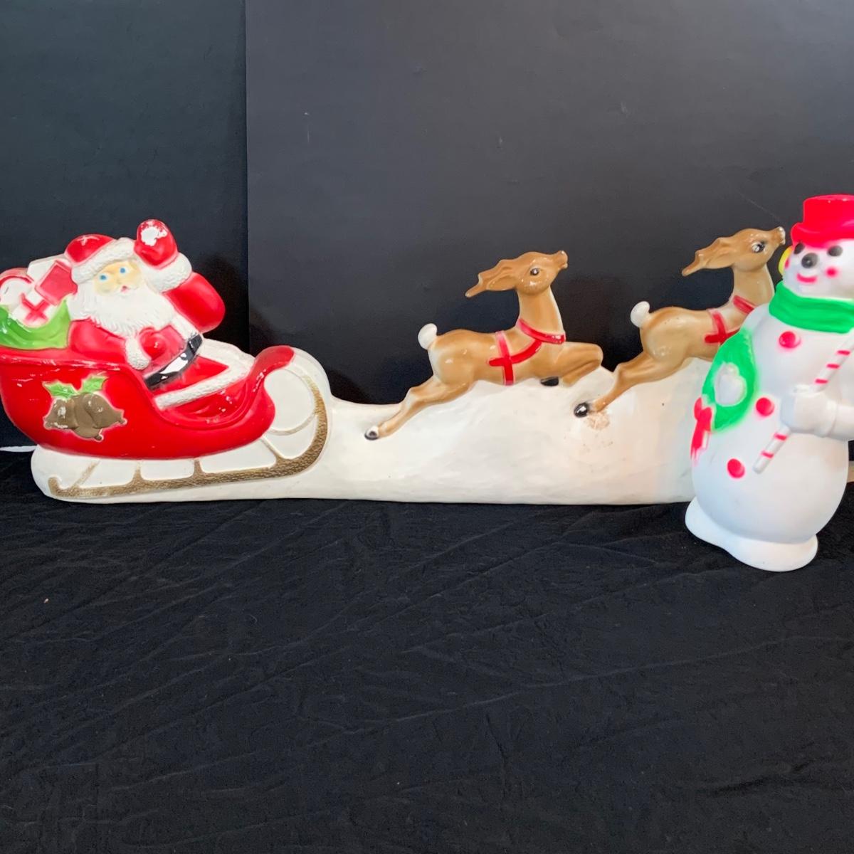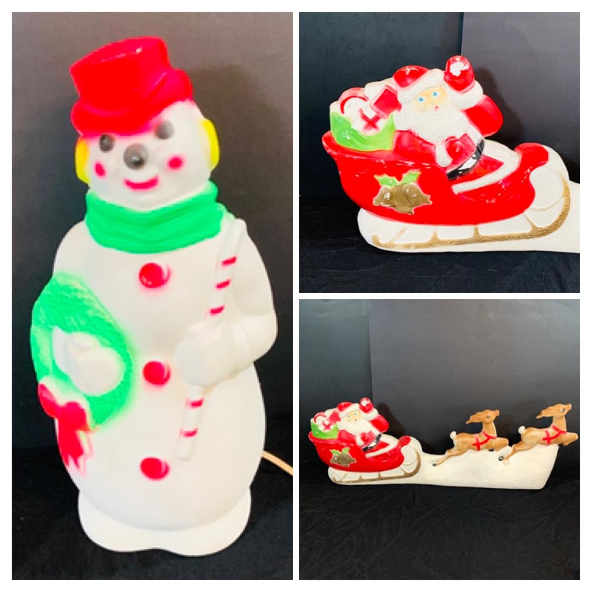 LOT251: Vintage Christmas Holiday Plastic Blow. Mold Lighted Decorations - Santa’s Sleigh by Union Products and Snowma by Empire 1966