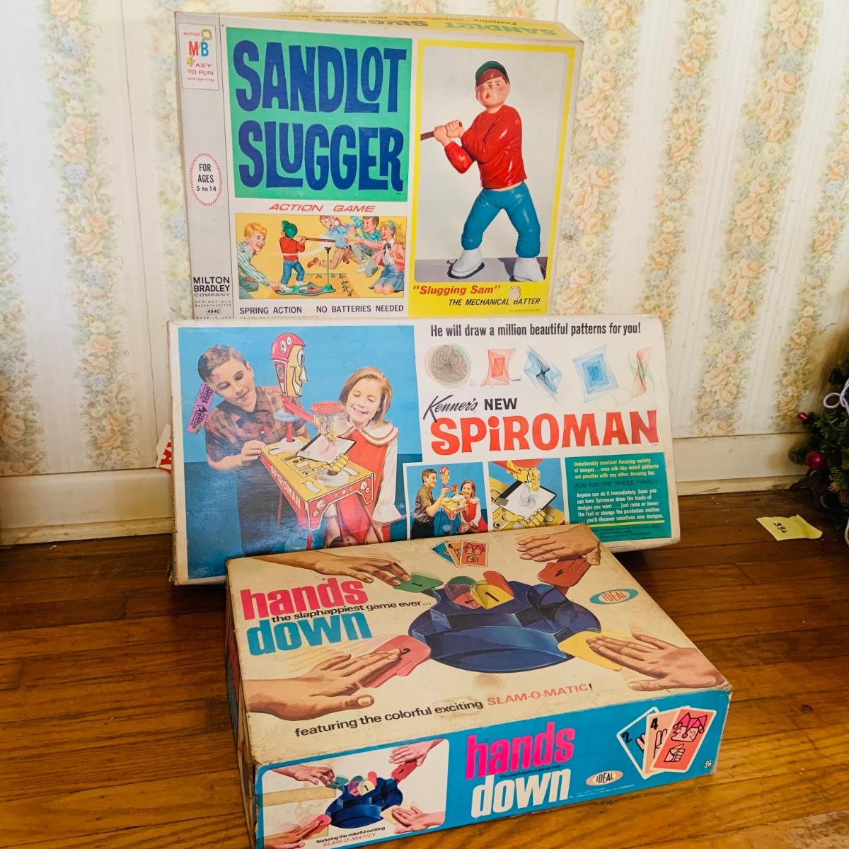 LOT 260: Vintage Children’s Games Including Sandlot Slugger by Milton Bradley, Spiroman by Kenner and Hands Down by Ideal