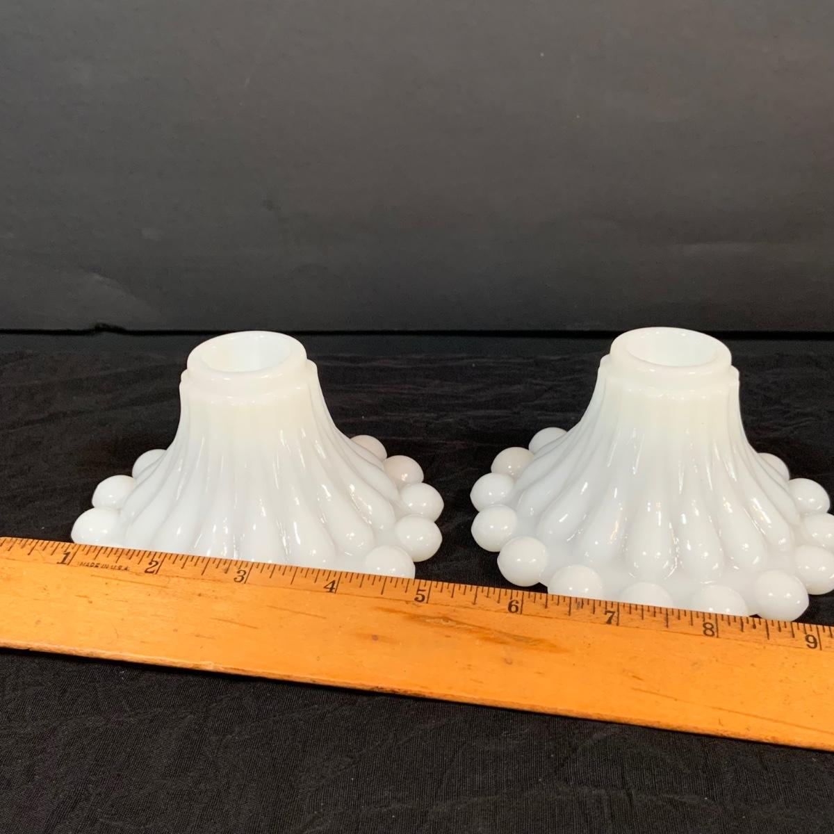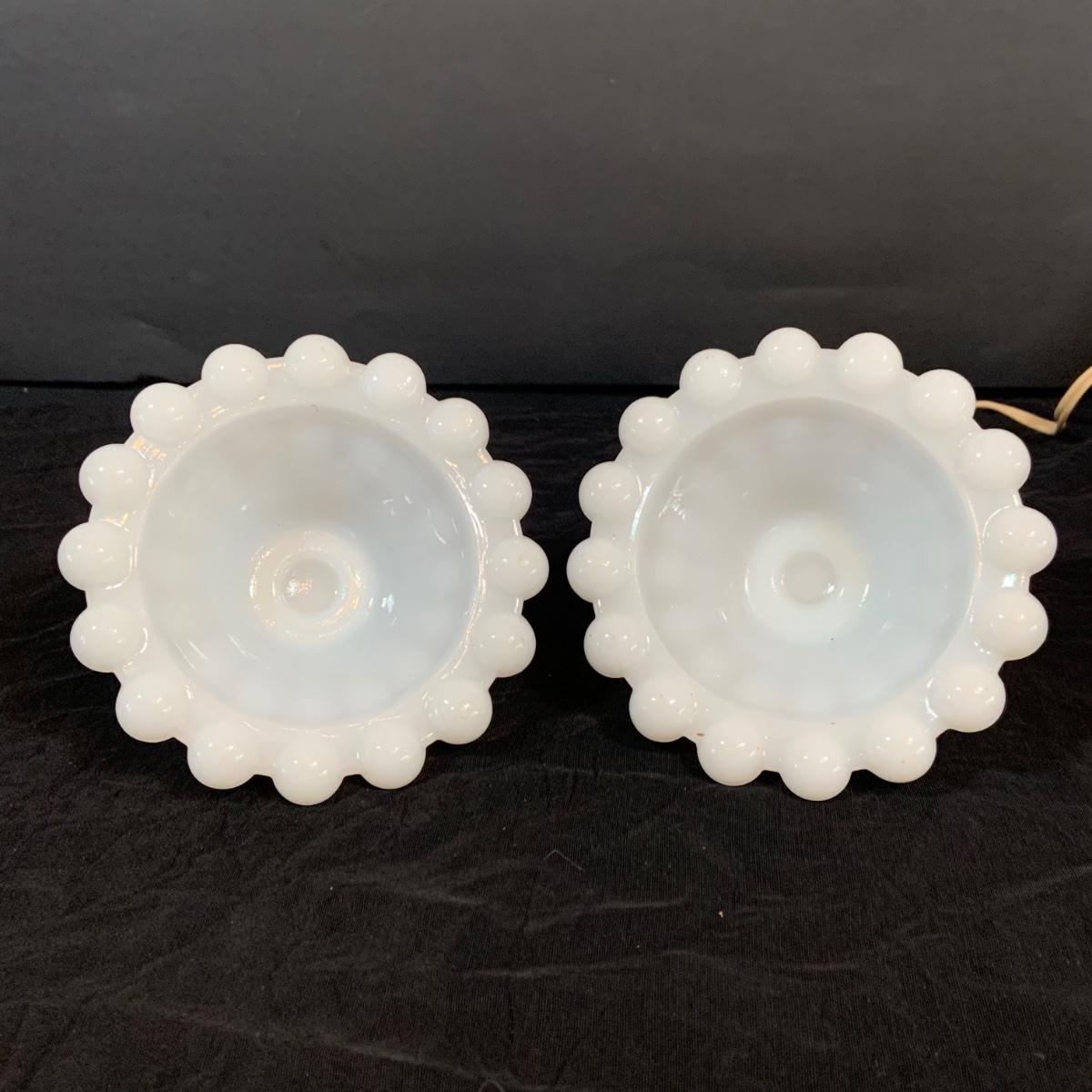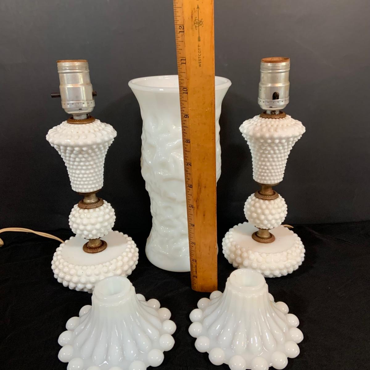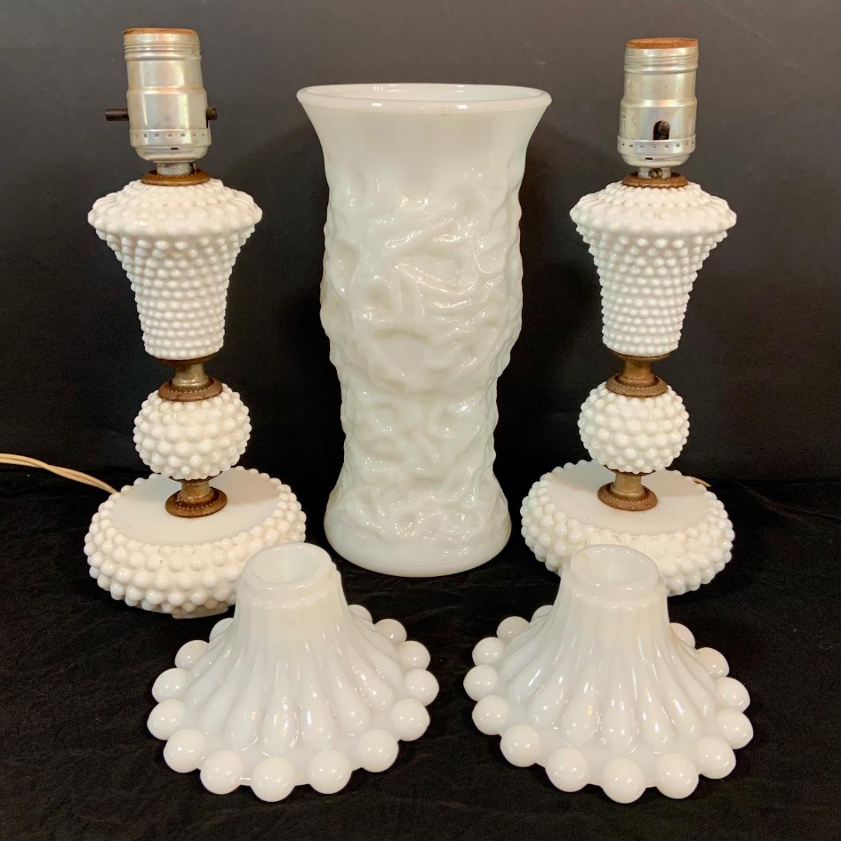 LOT 265: Set of Two (2) Hobnail Milk Glass Electric Lambs, Milk Glass Candle Stick Holders, and a Brody Milk Glass Vase
