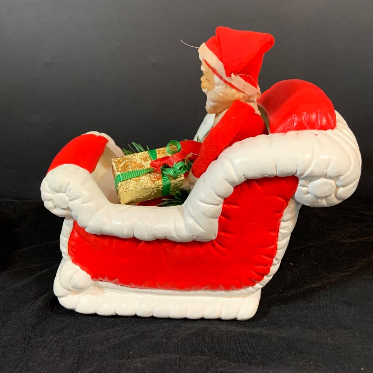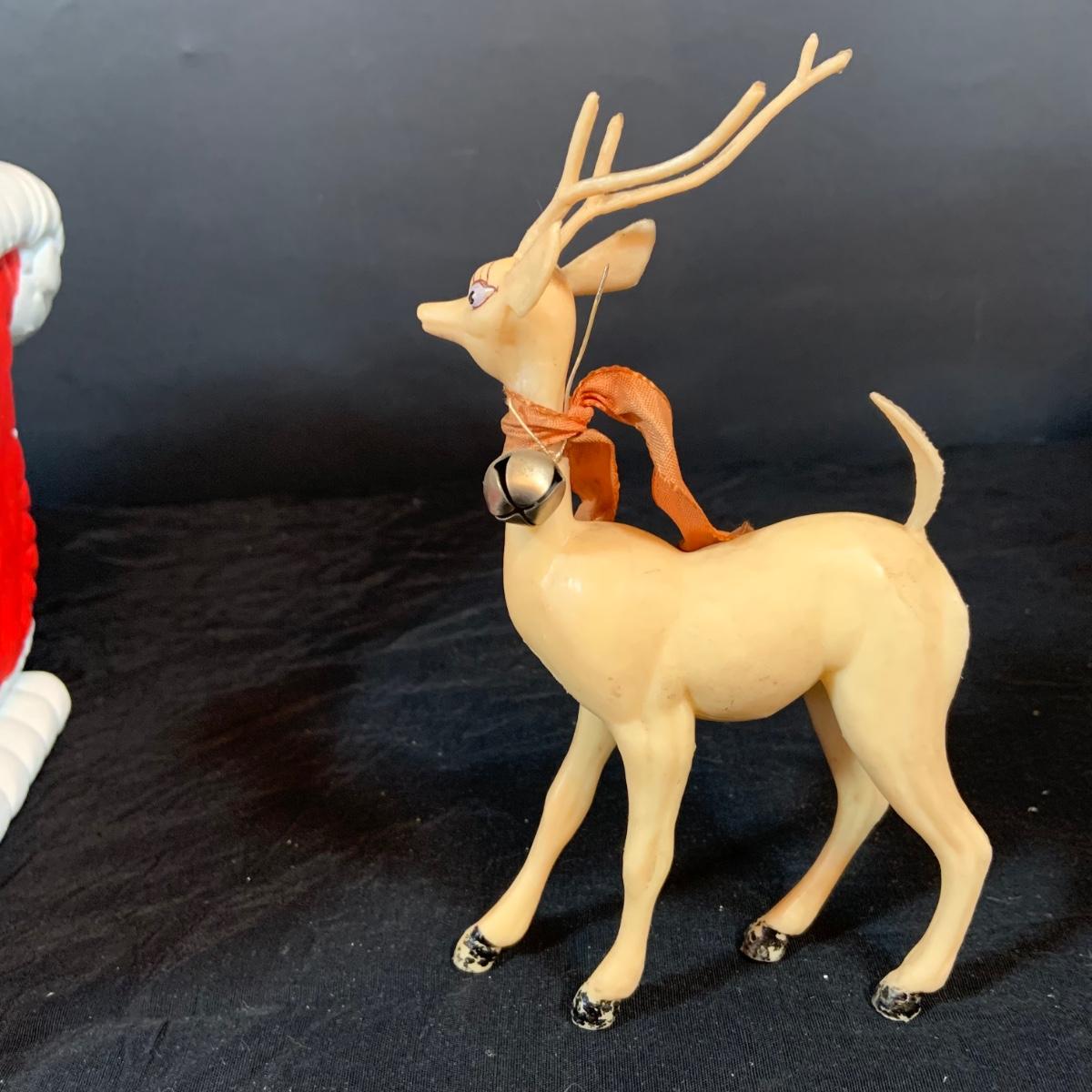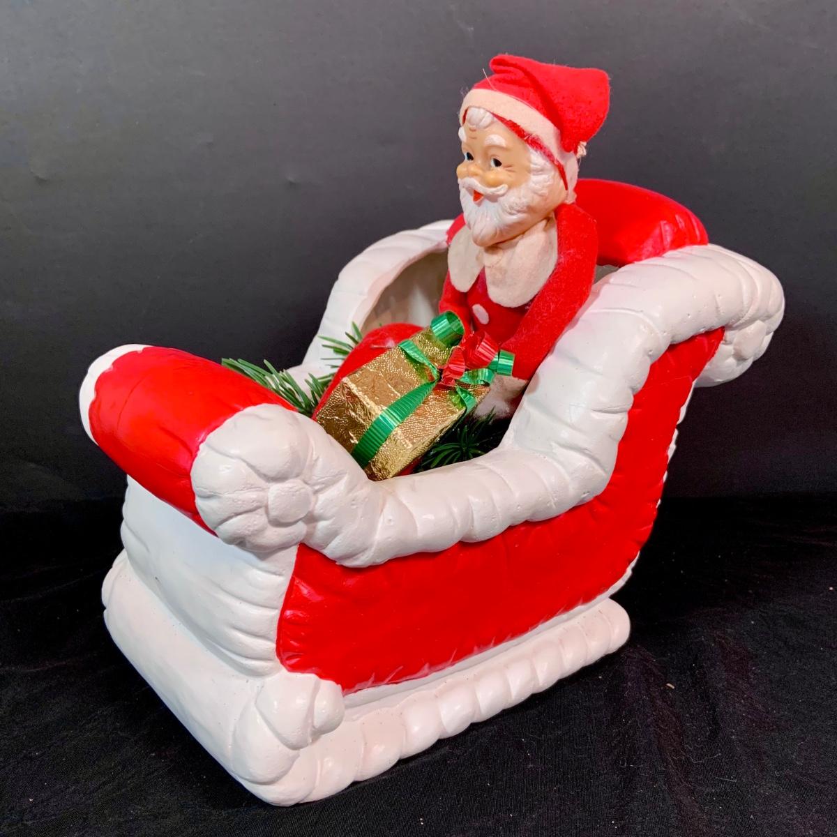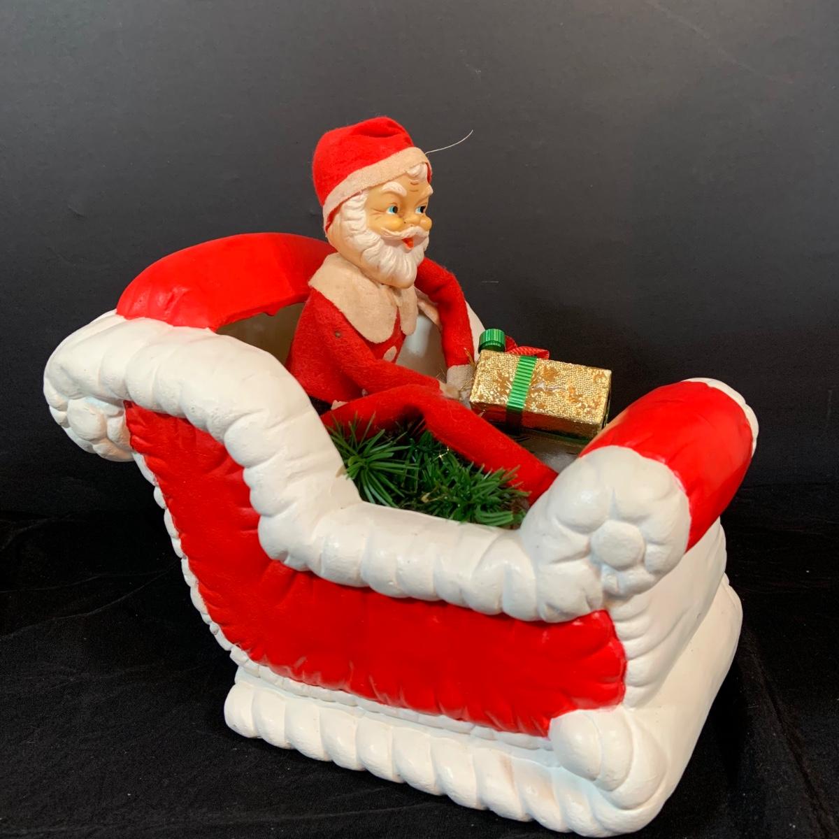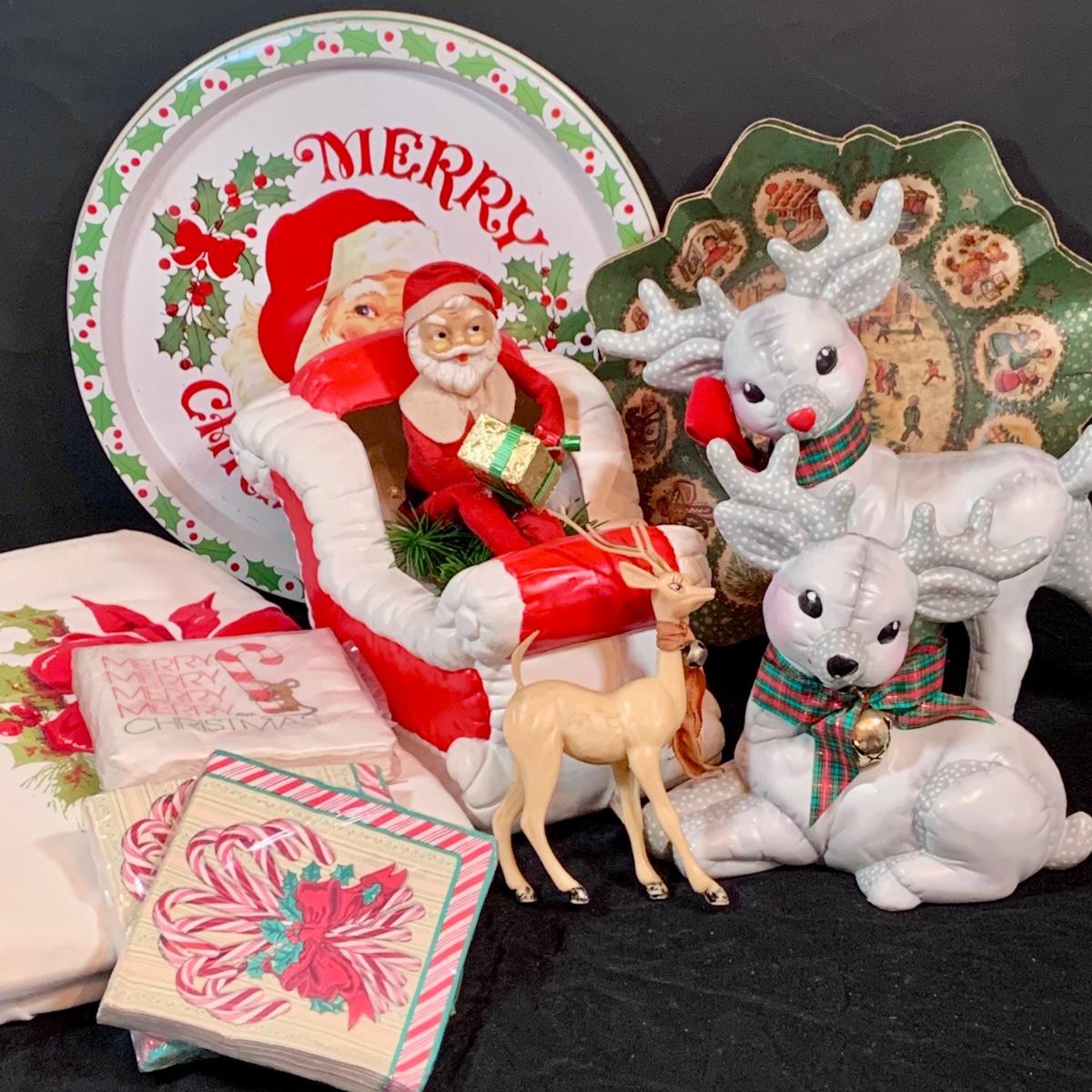 LO 269: Assortment of Vintage Christmas Decorations and More Including Vintage Hallmark Paper Bowls Knee Hugger Style Santa in Ceramic Sleigh, Ceramic and Plastic Reindeer, and More