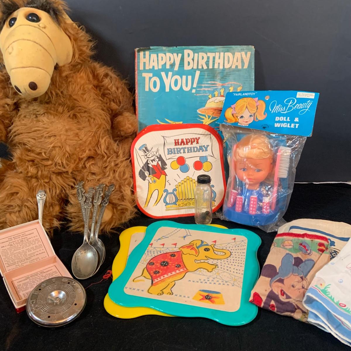 LOT 283: Assortment of Vintage Children’s, Toys, Books, Plush, Including Alf, Hanna Barbera Spoons and Much More
