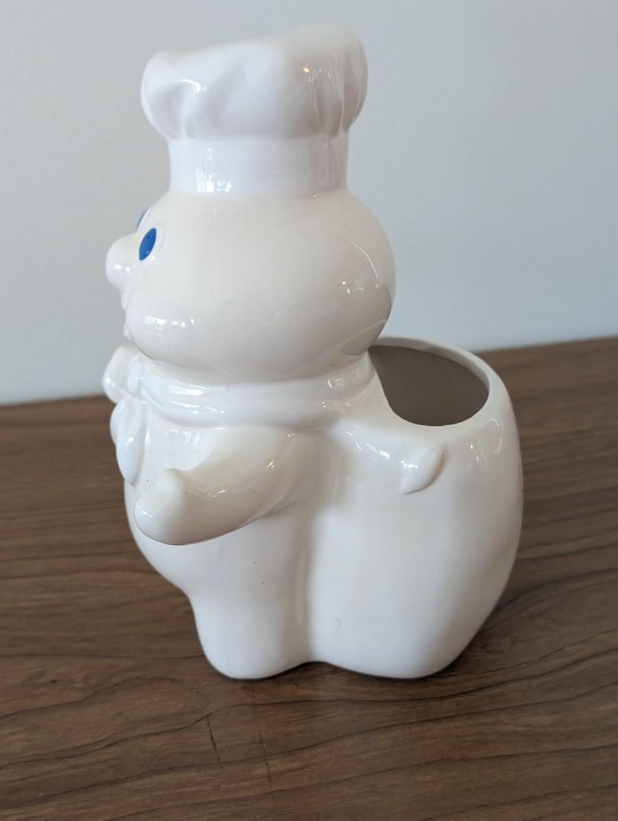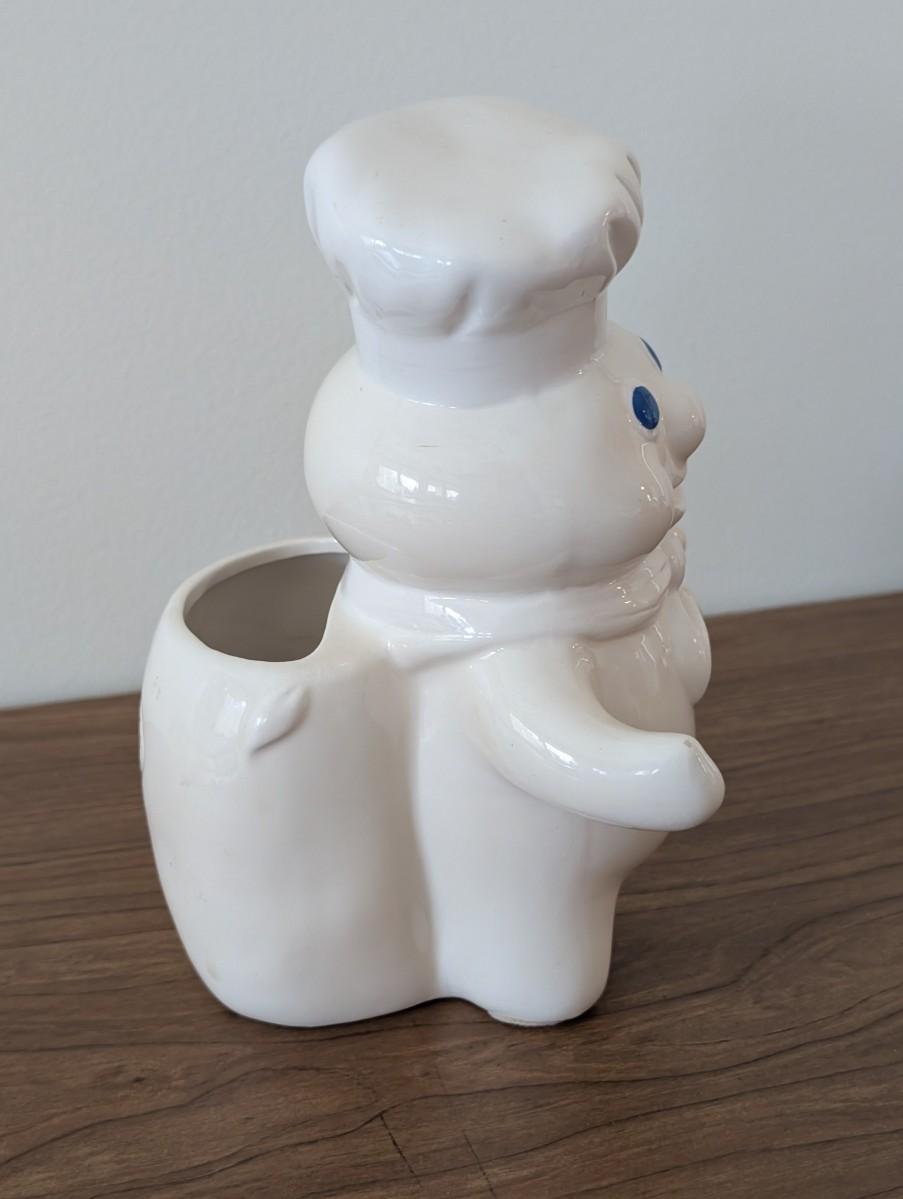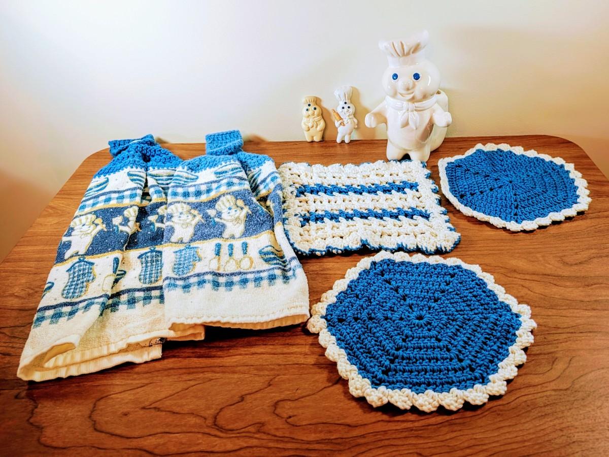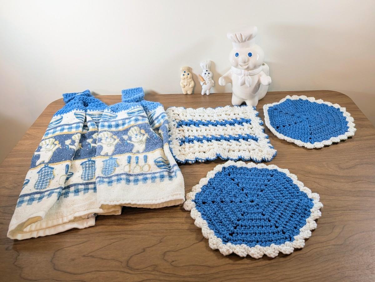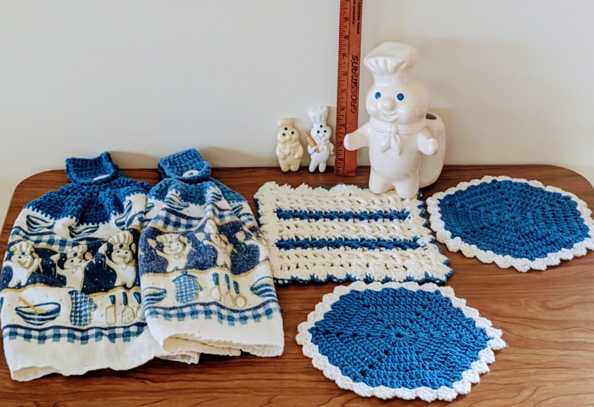 LOT 45K: Vintage Pillsbury Doughboy Kitchen Utensil Holder, Magnets And Hanging Kitchen Towels With Coordinating Hand Crocheted Potholders