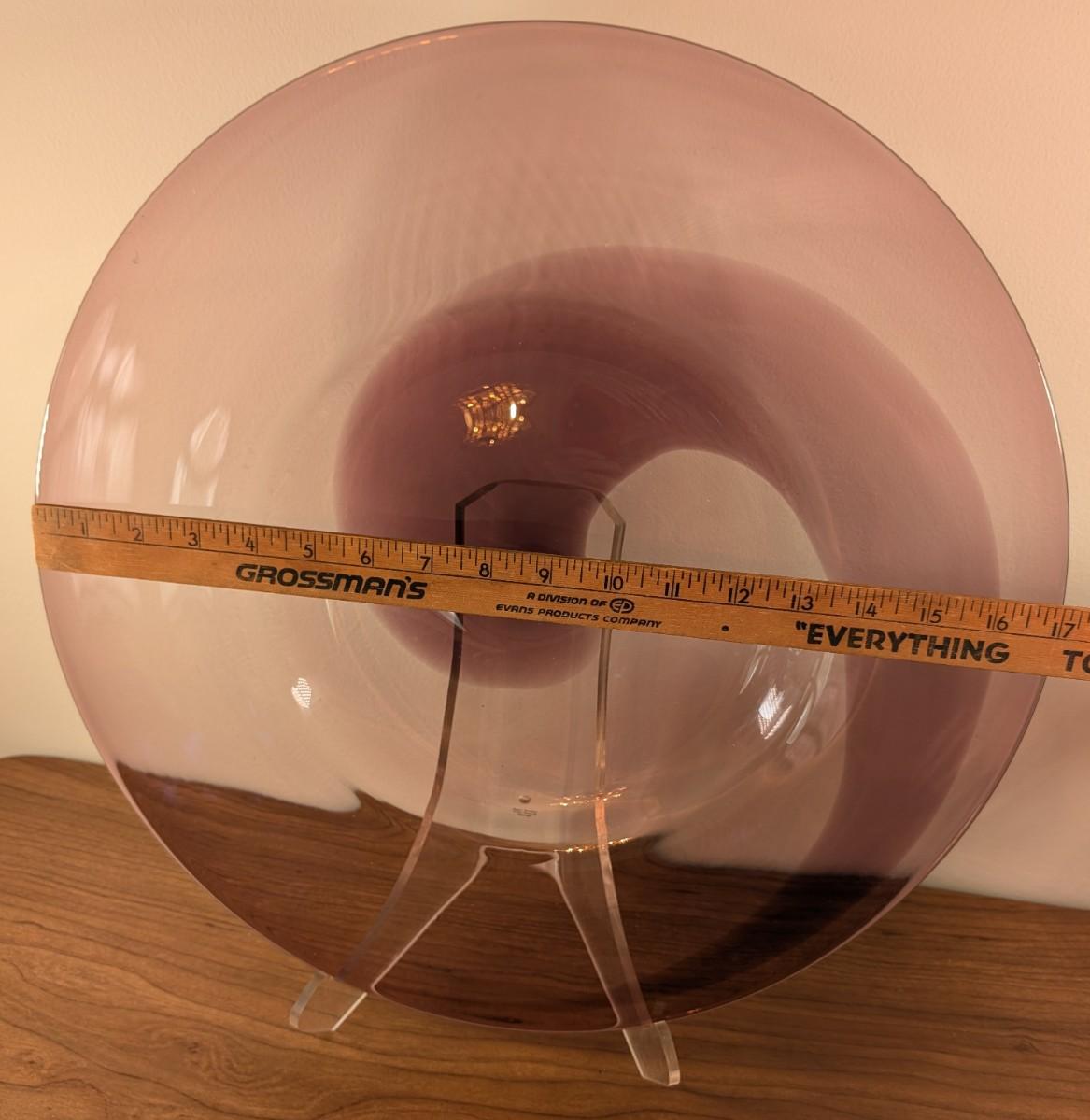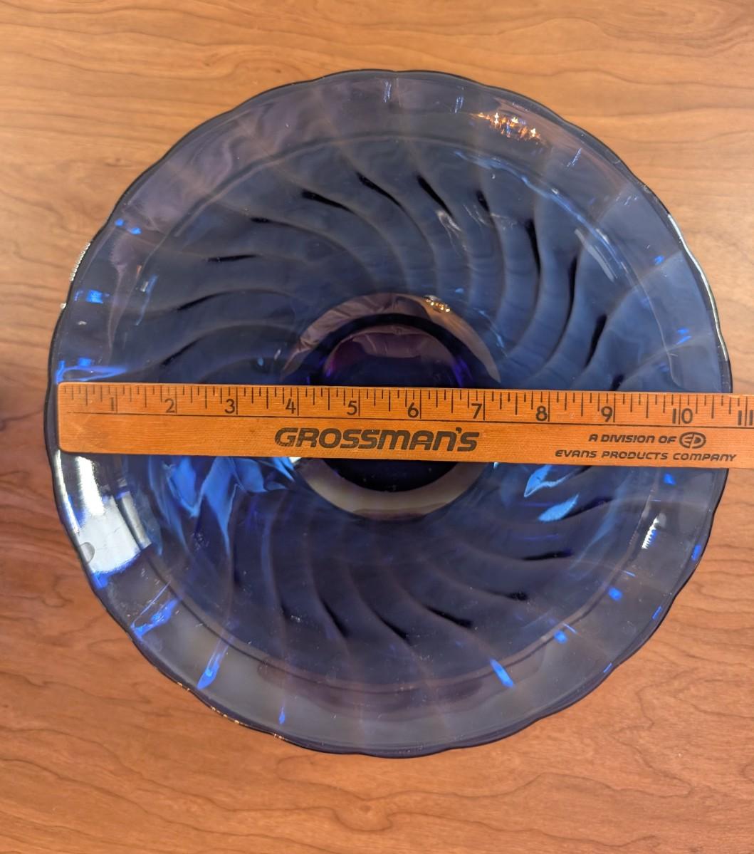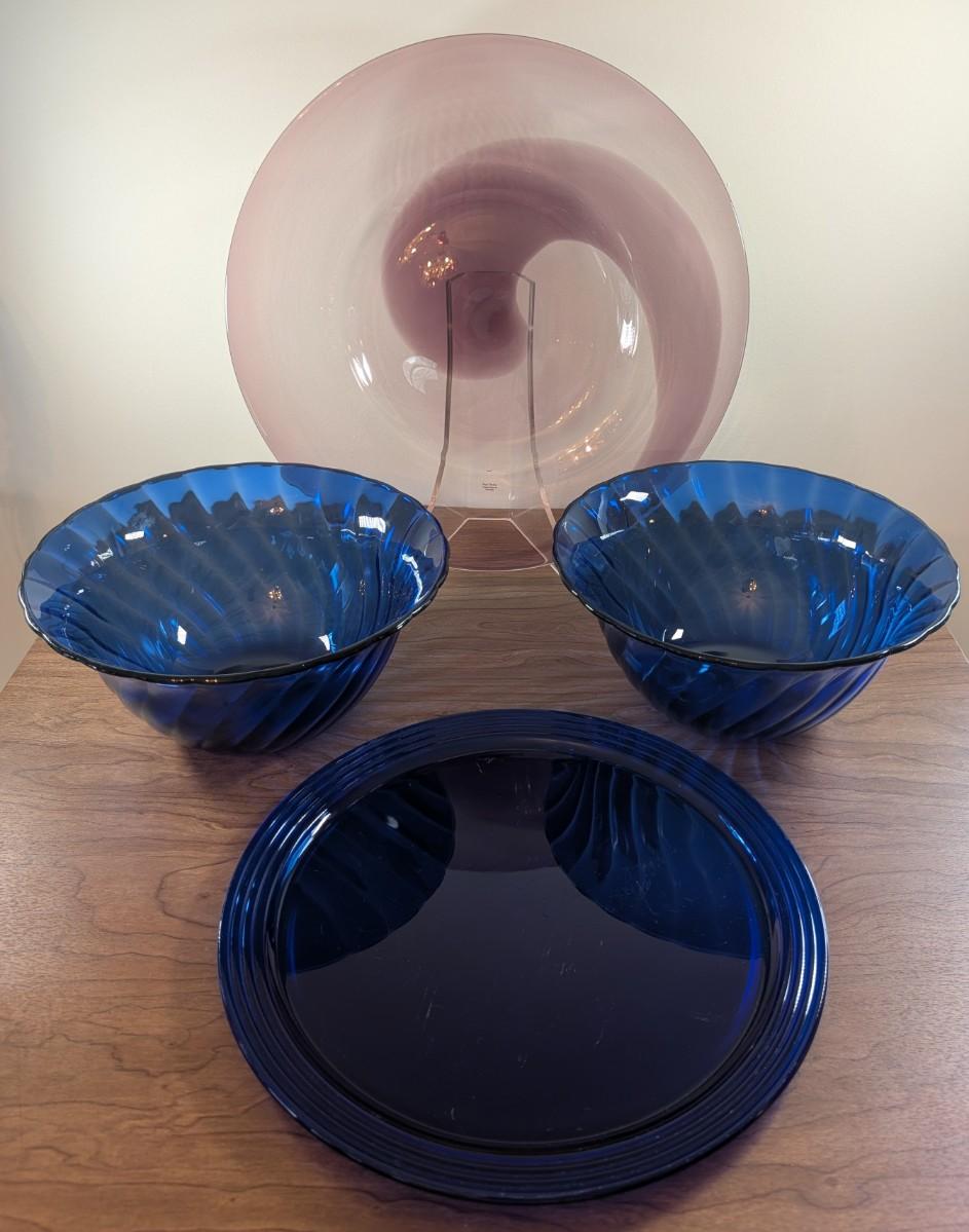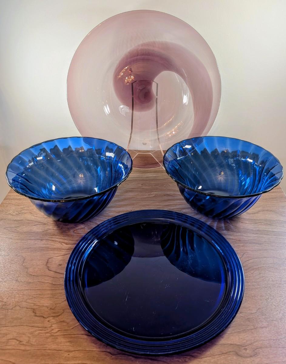 LOT 56K: Vintage Large Smokey Mauve Glass Shallow Bowl With Stand, Medium Size Cobalt Blue Plate And Blue Glass Bowls With Vertical Ridge Pattern