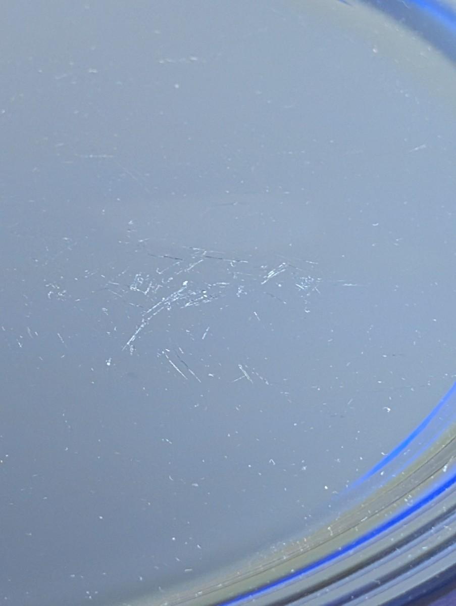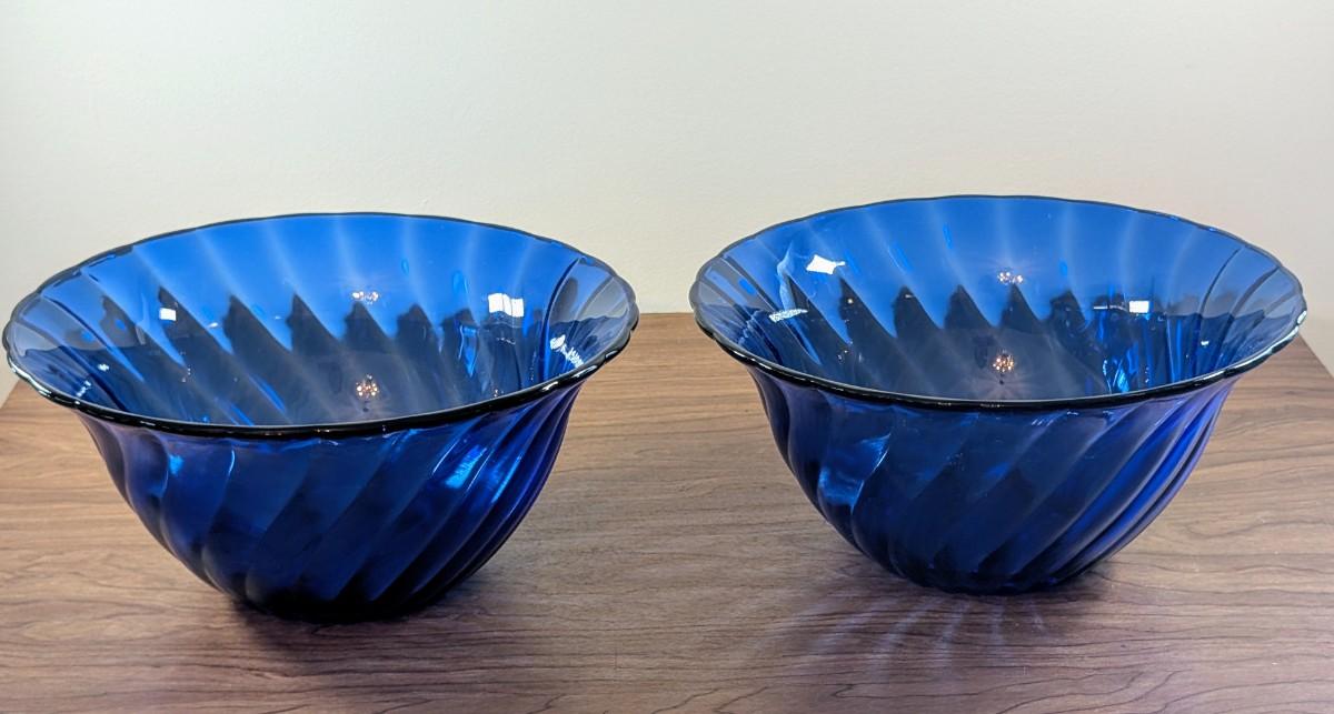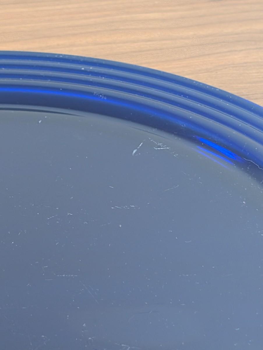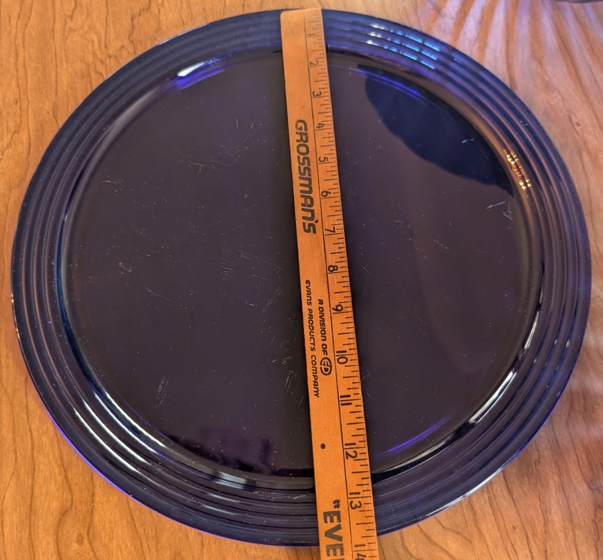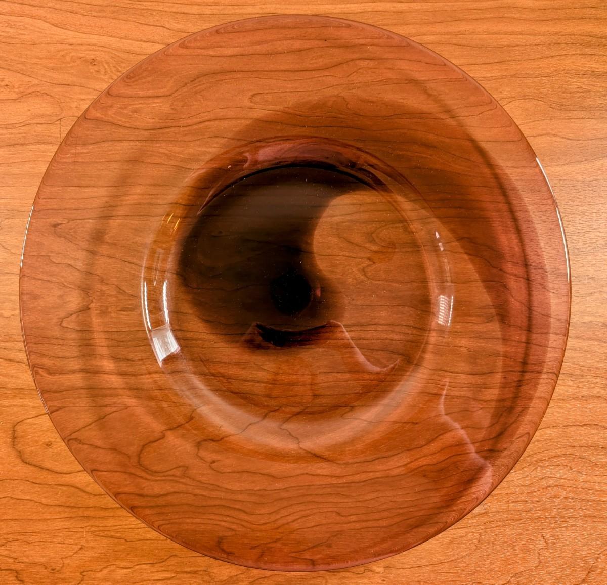 LOT 56K: Vintage Large Smokey Mauve Glass Shallow Bowl With Stand, Medium Size Cobalt Blue Plate And Blue Glass Bowls With Vertical Ridge Pattern