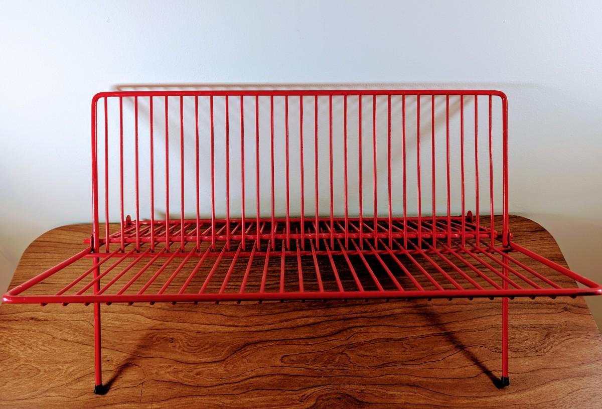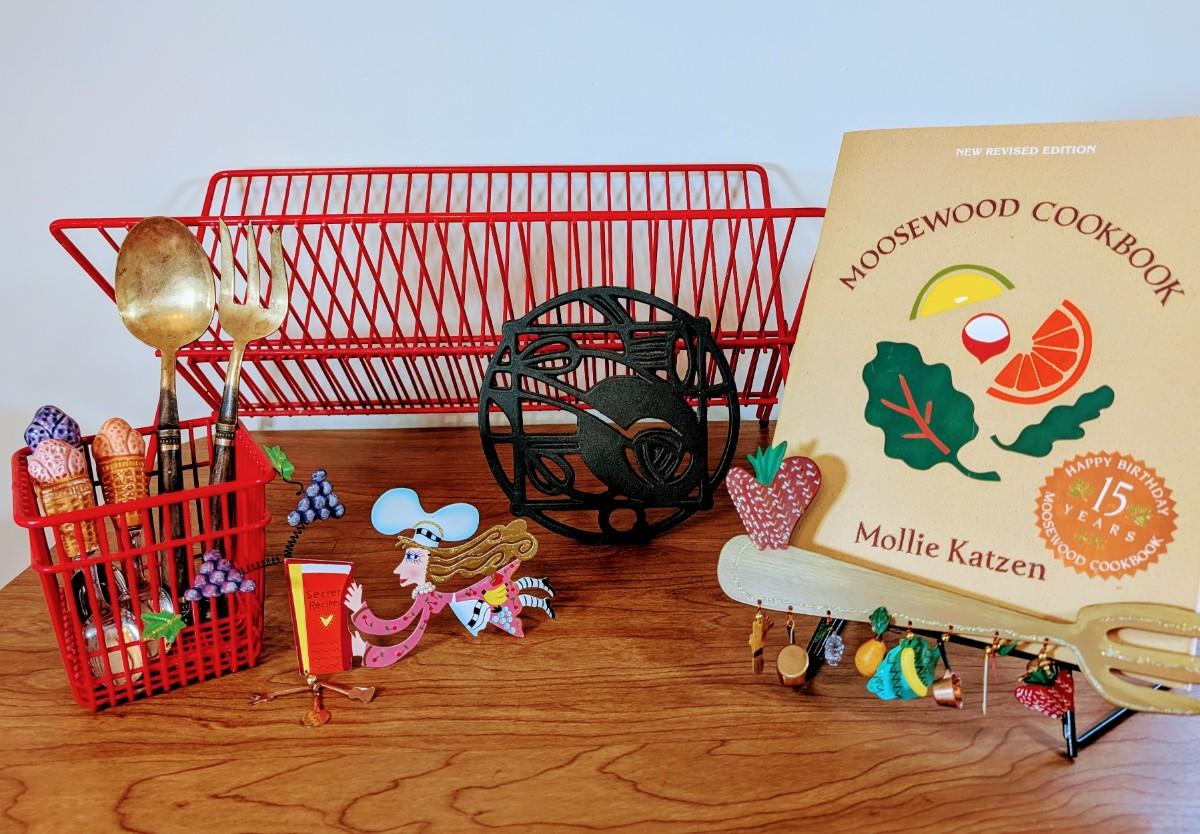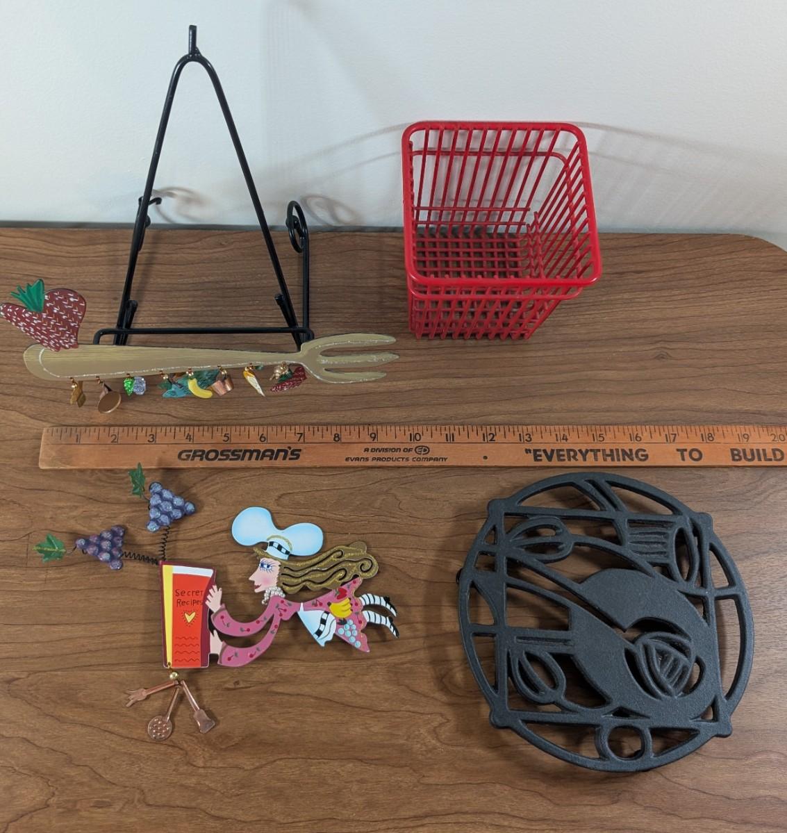 LOT 57K: Kitchen Collection, Red Wire Collapsible Dish Drying Rack With Matching Utensil Holder, Serving Utensils, Vintage Cook Book And Whimsical Cookbook Stand