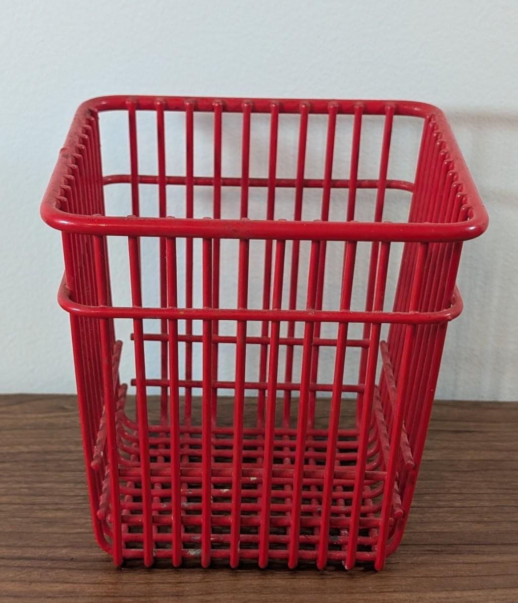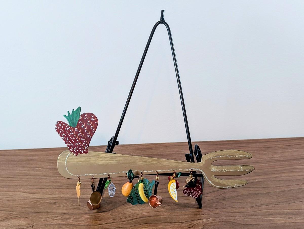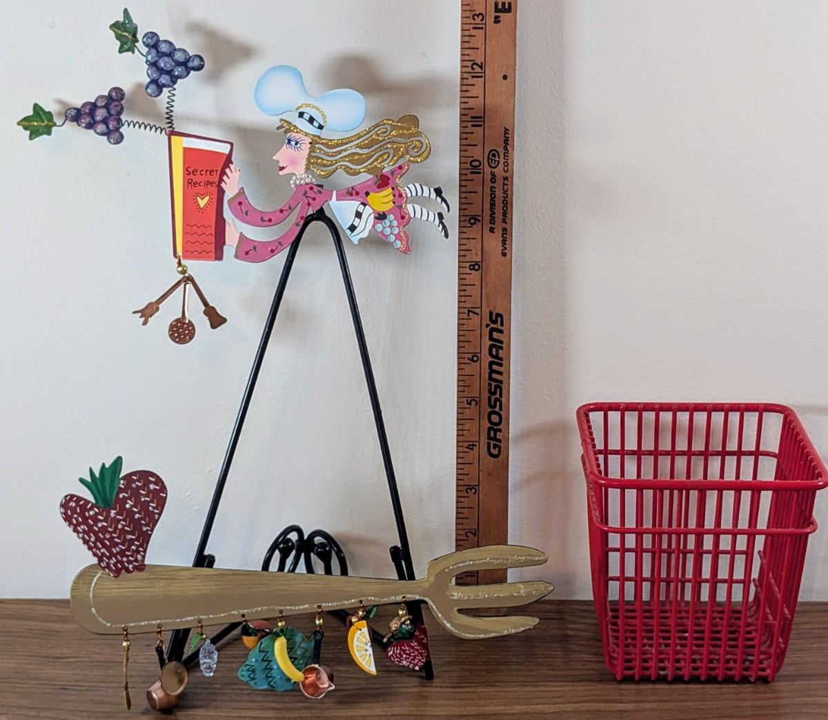 LOT 57K: Kitchen Collection, Red Wire Collapsible Dish Drying Rack With Matching Utensil Holder, Serving Utensils, Vintage Cook Book And Whimsical Cookbook Stand