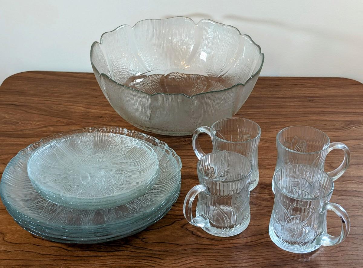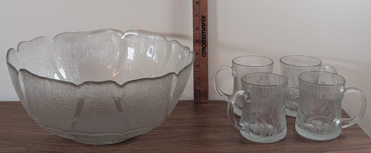 LOT 58K: Nice Large Glass Salad Bowl With 5 Large Glass Plates, 4 Small Salad Plates And 4 Glass Mugs