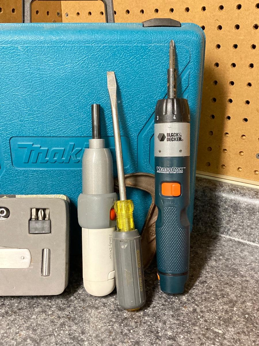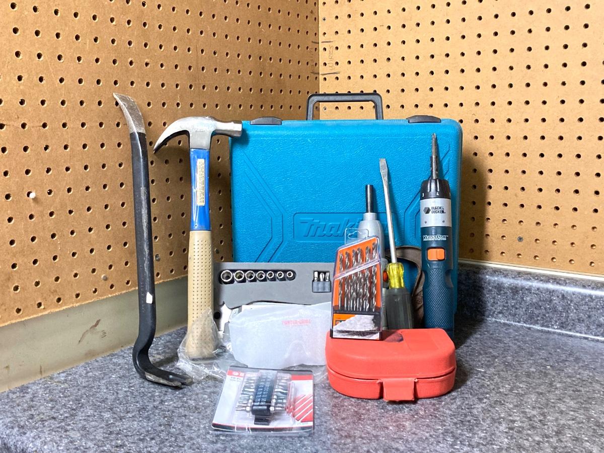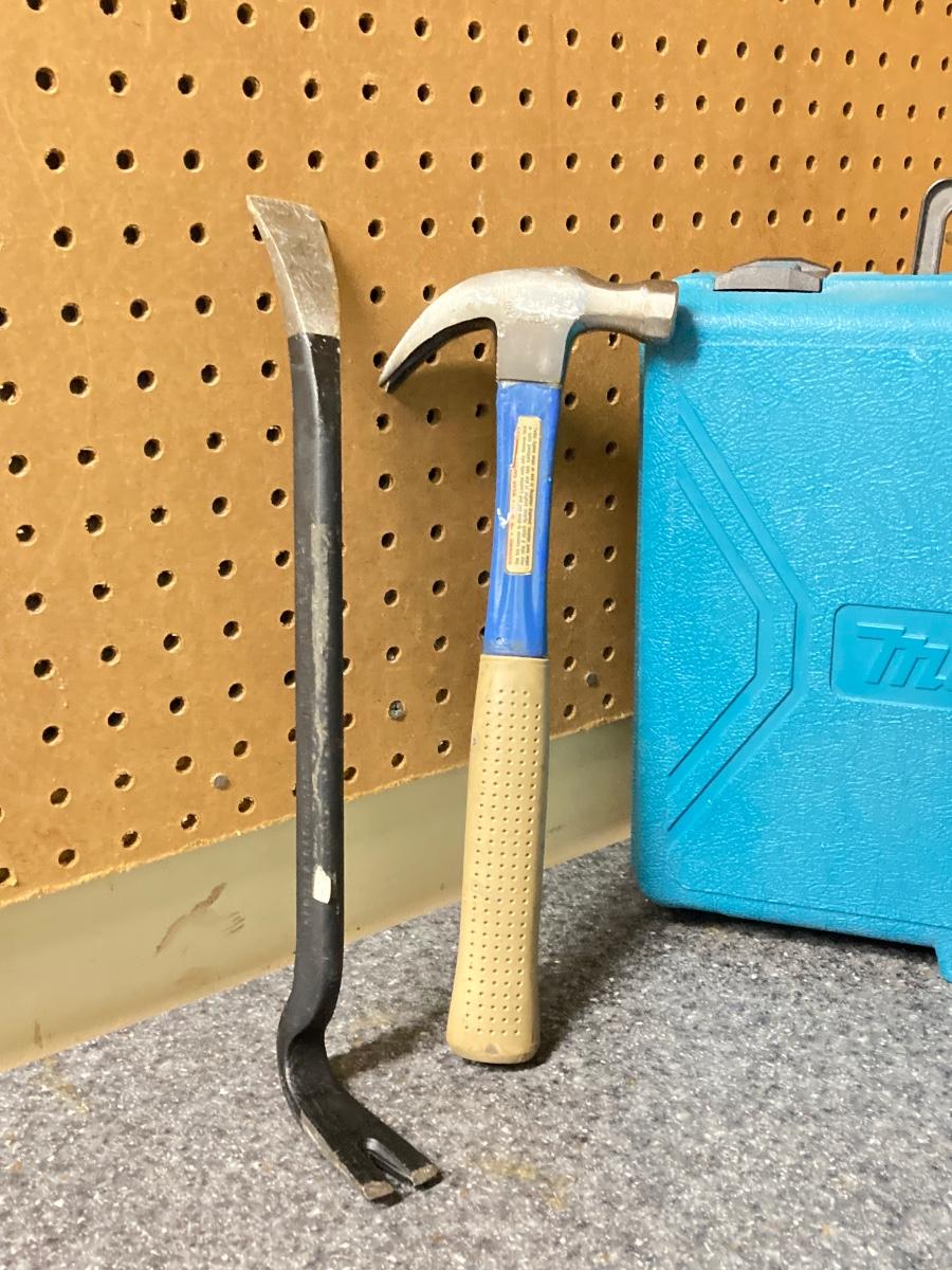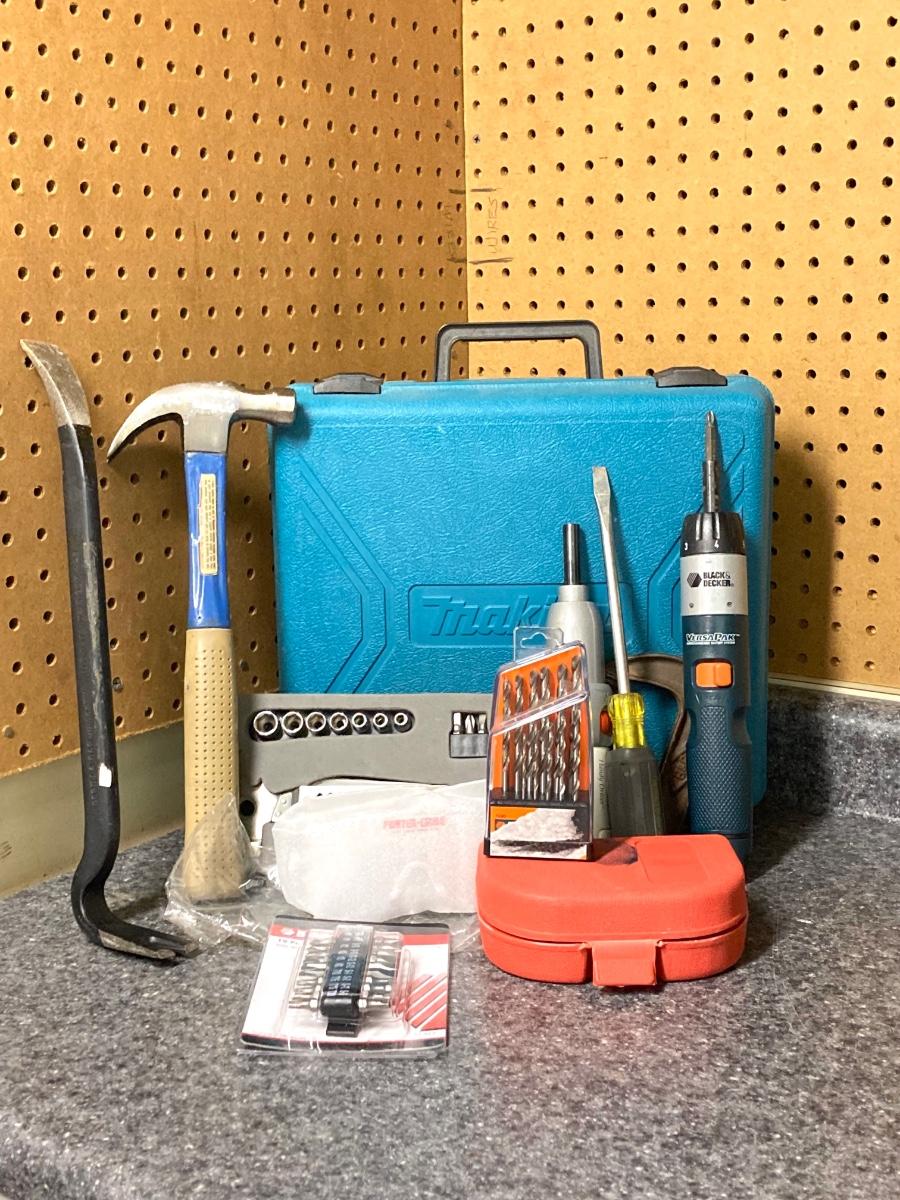 LOT 67U: Makita Drill Model 6095D with Charger, Cordless Screwdrivers, Drill Bits, Hammer, Pry Bar and More