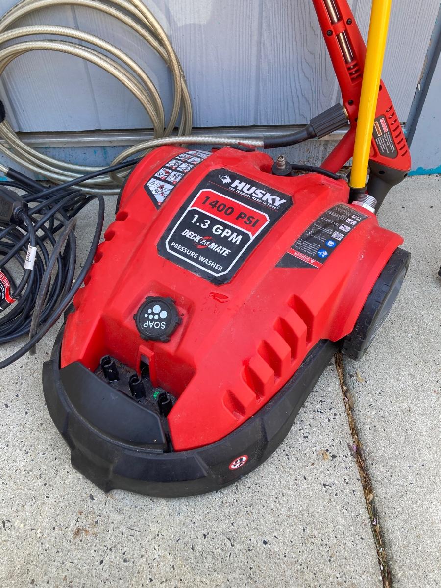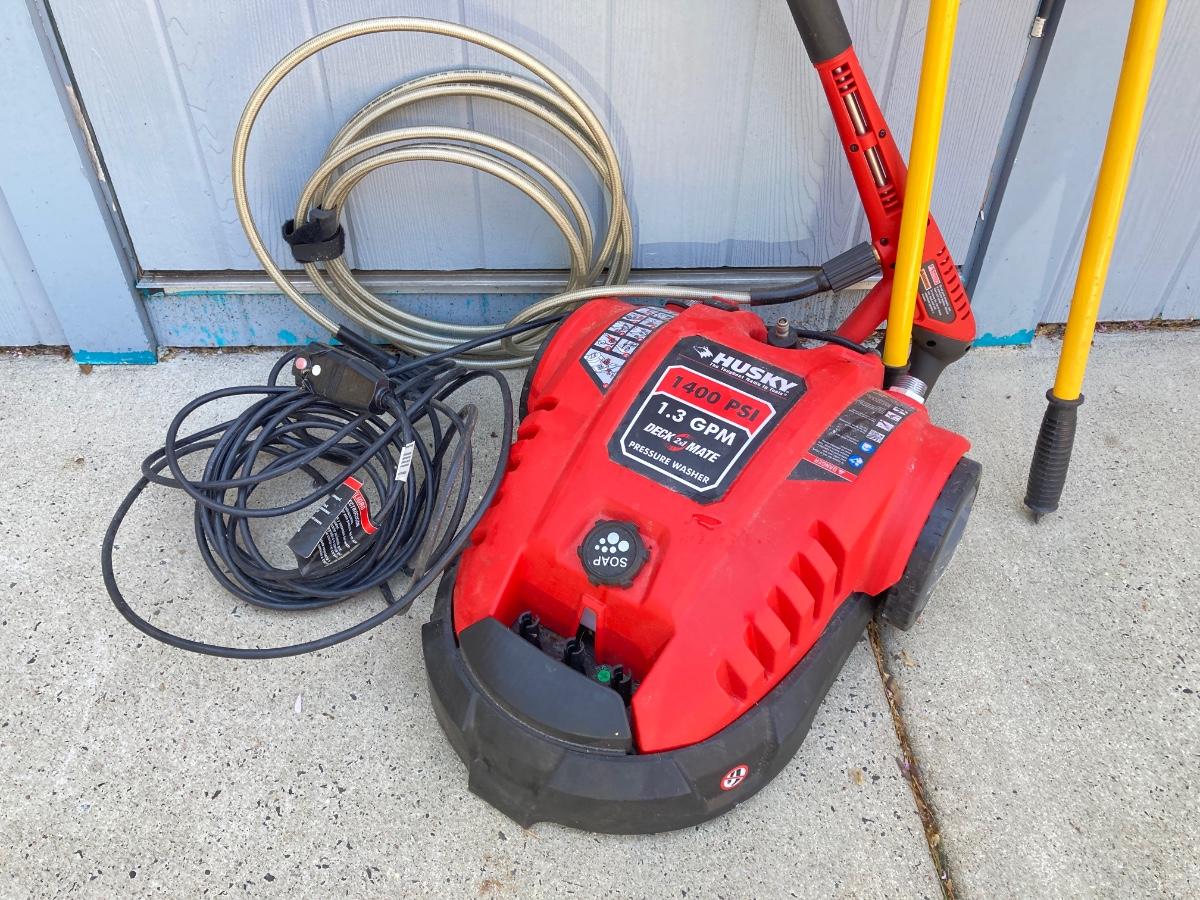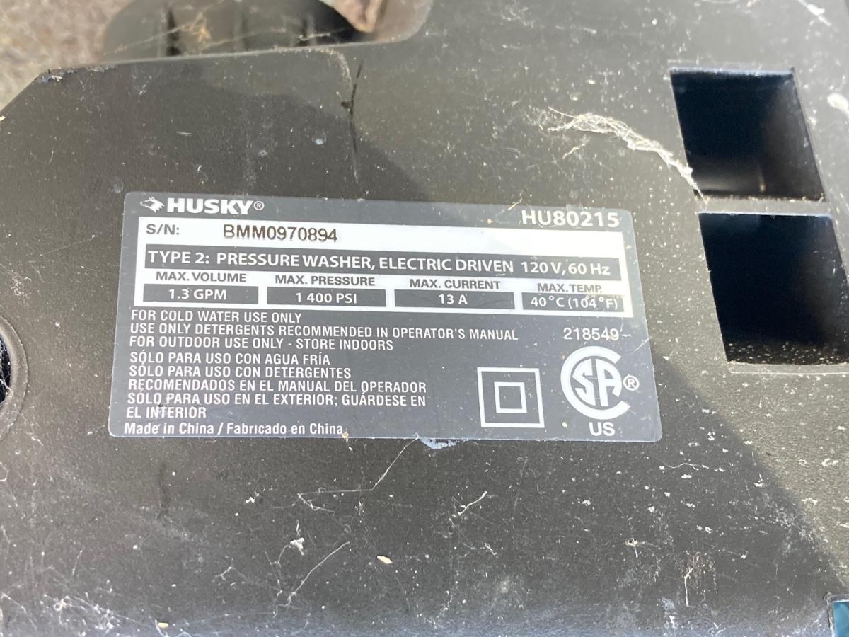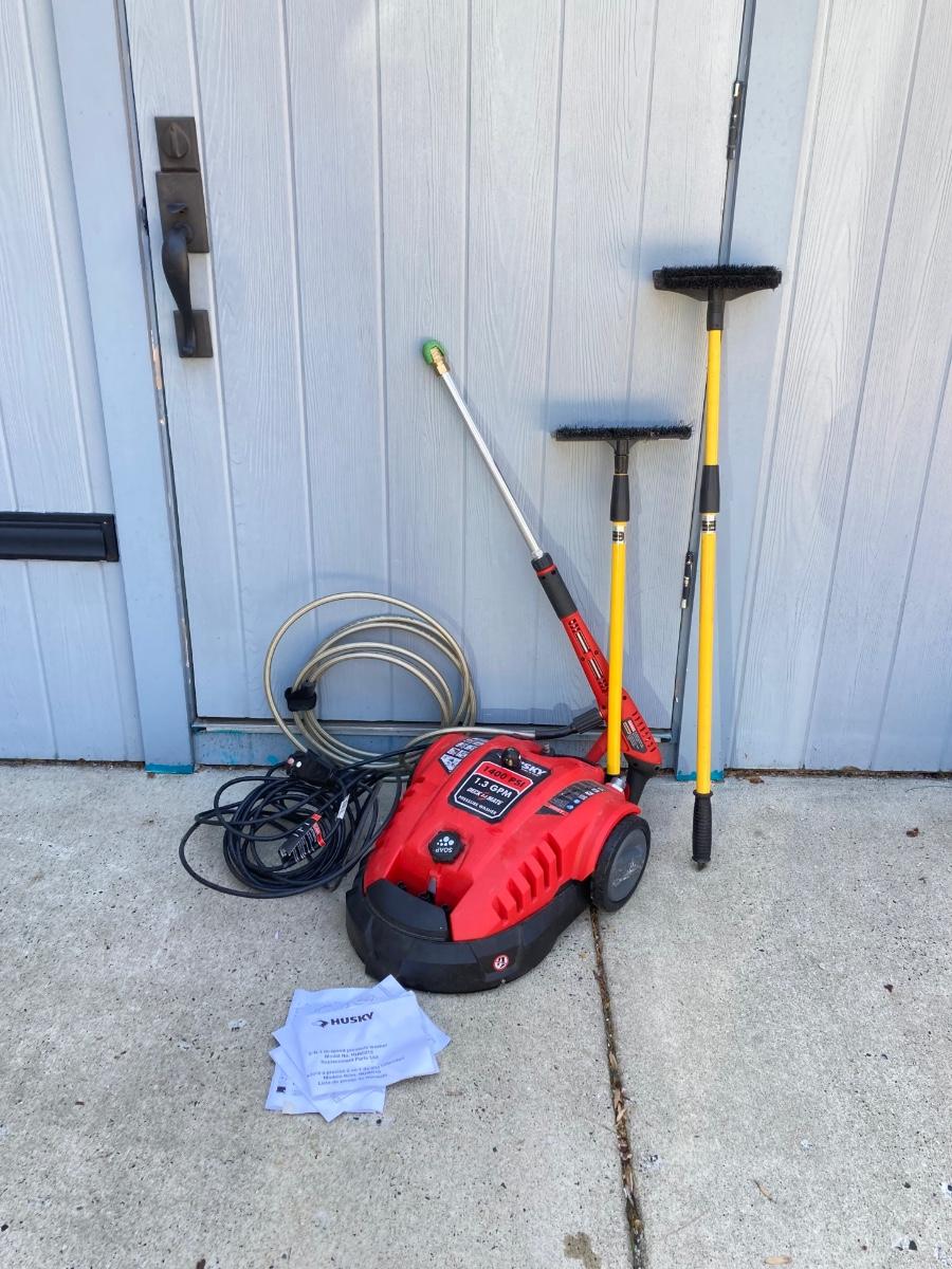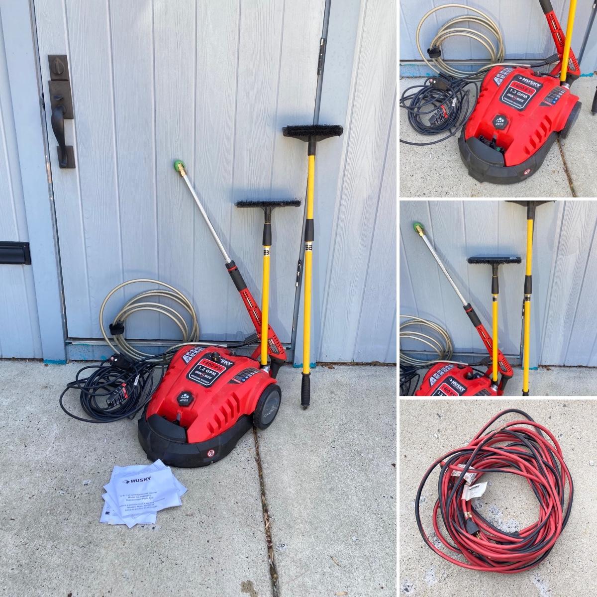 LOT 74G: Husky Deck Mate Pressure Washer HU80215, Husky Electric Power Cord and Pair of Telescopic Brushes /