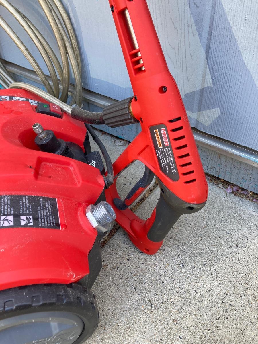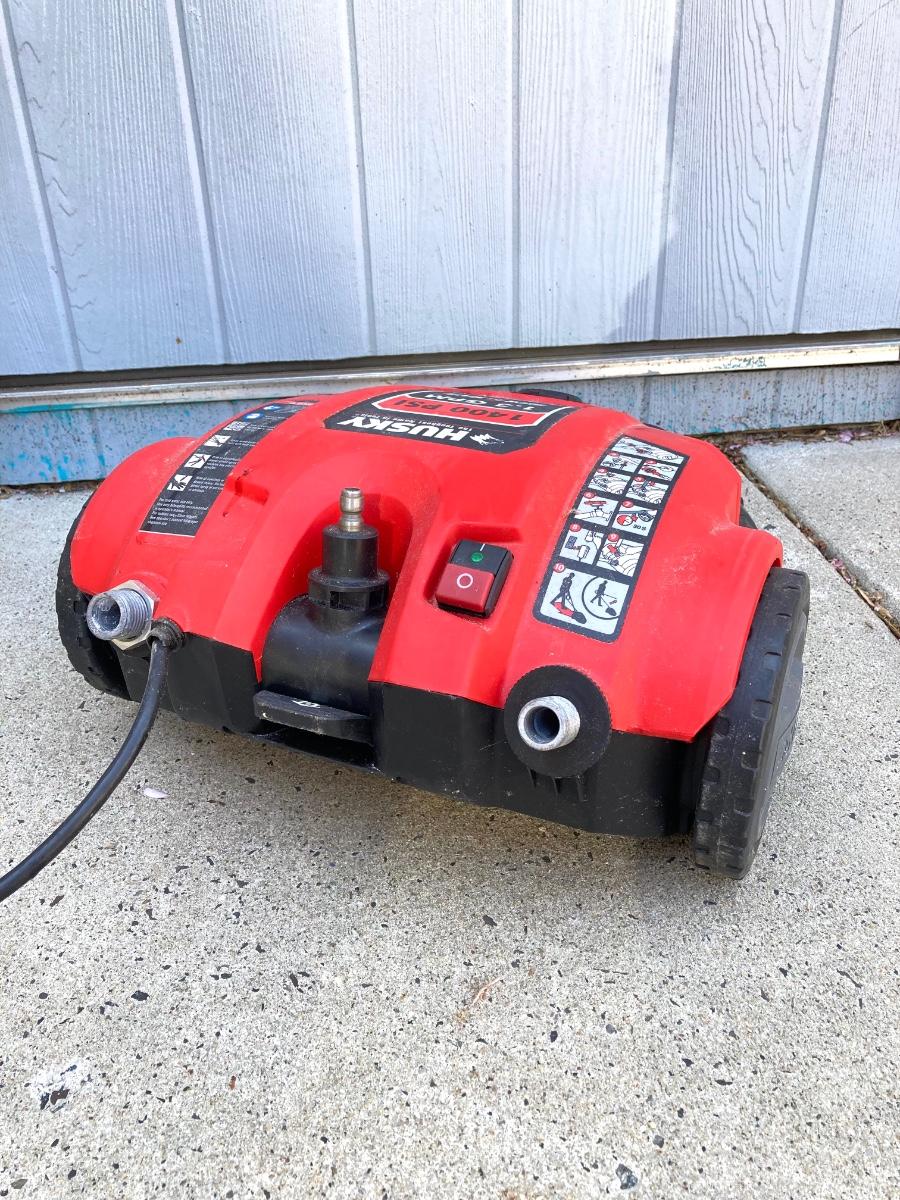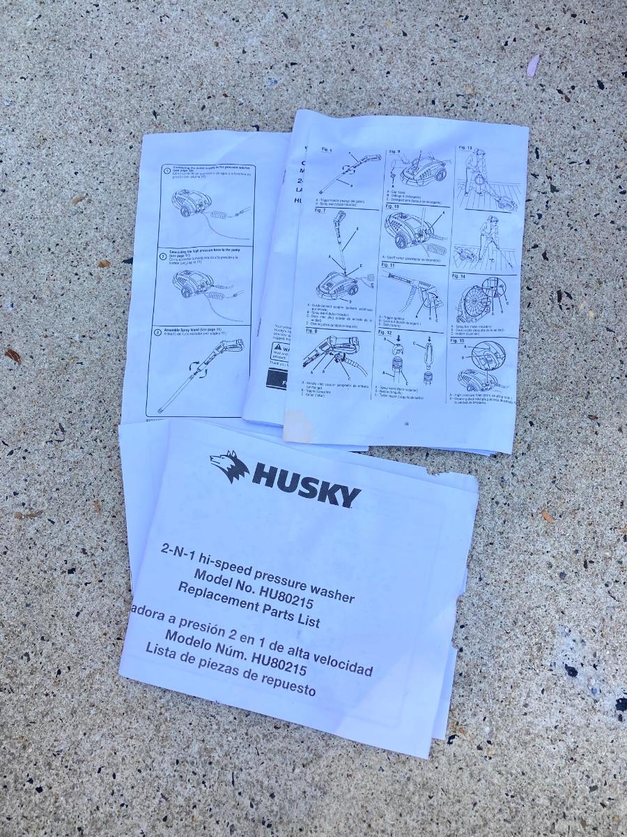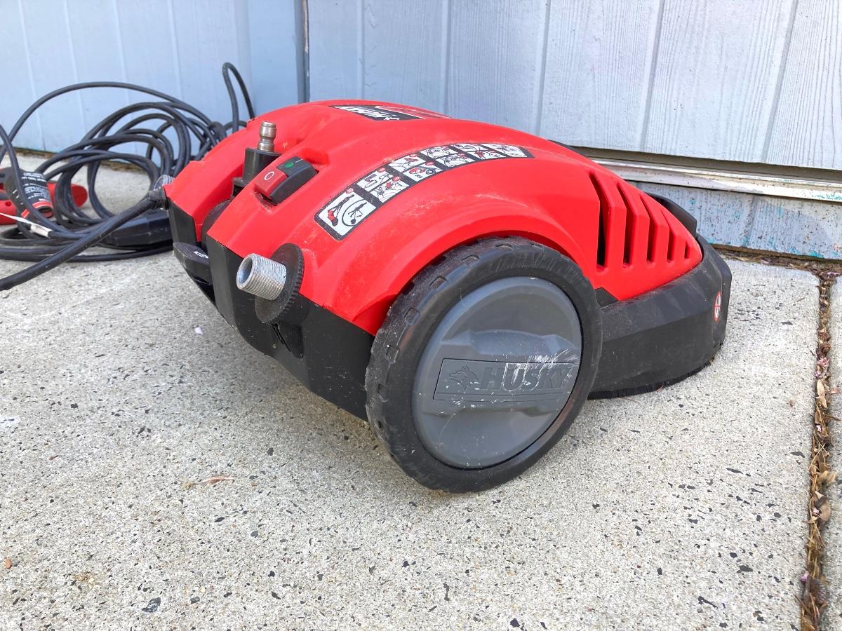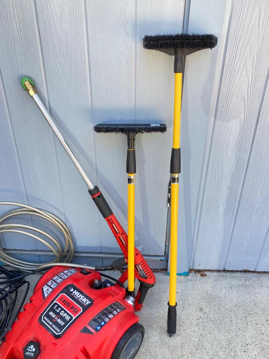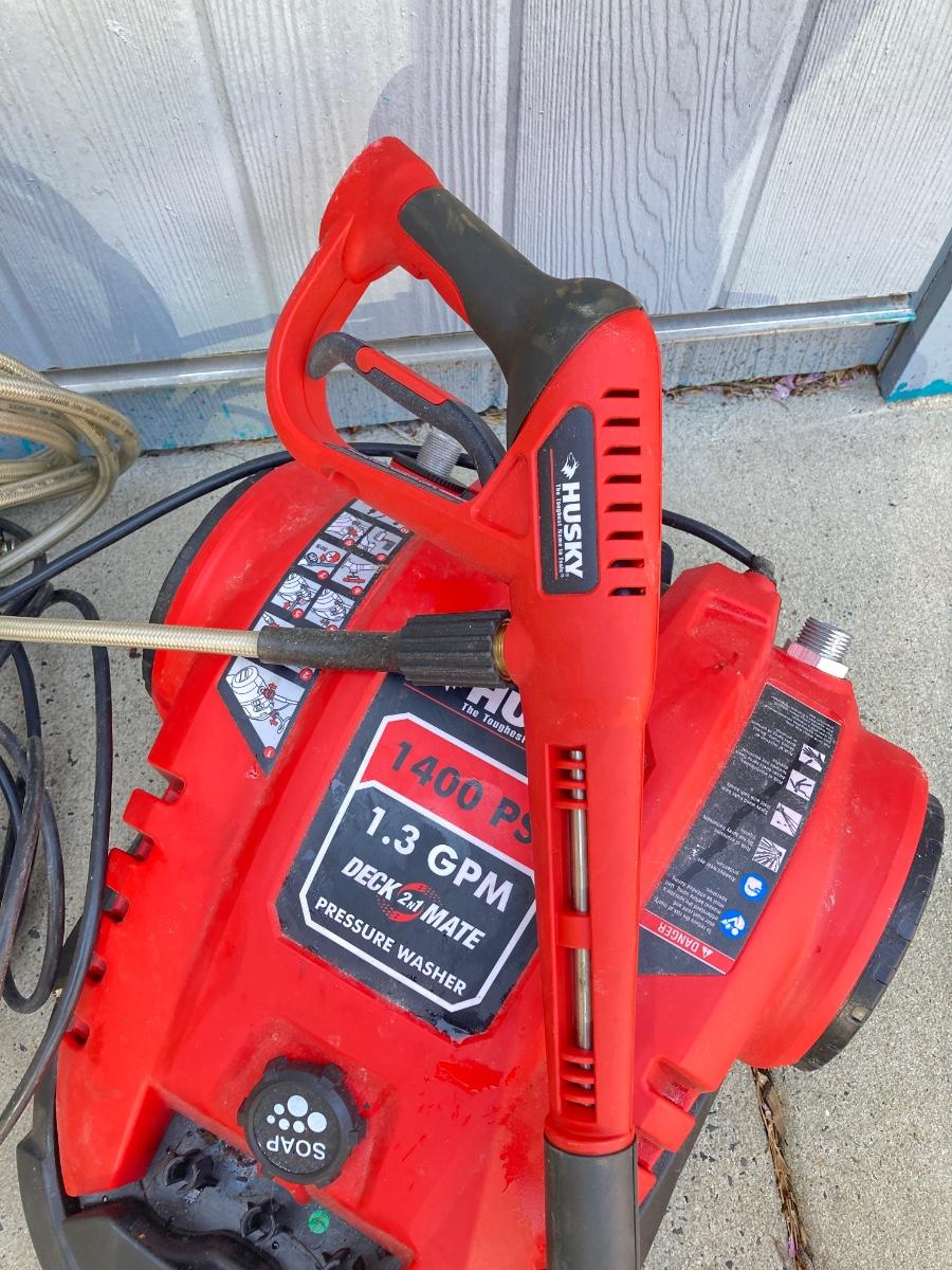 LOT 74G: Husky Deck Mate Pressure Washer HU80215, Husky Electric Power Cord and Pair of Telescopic Brushes /