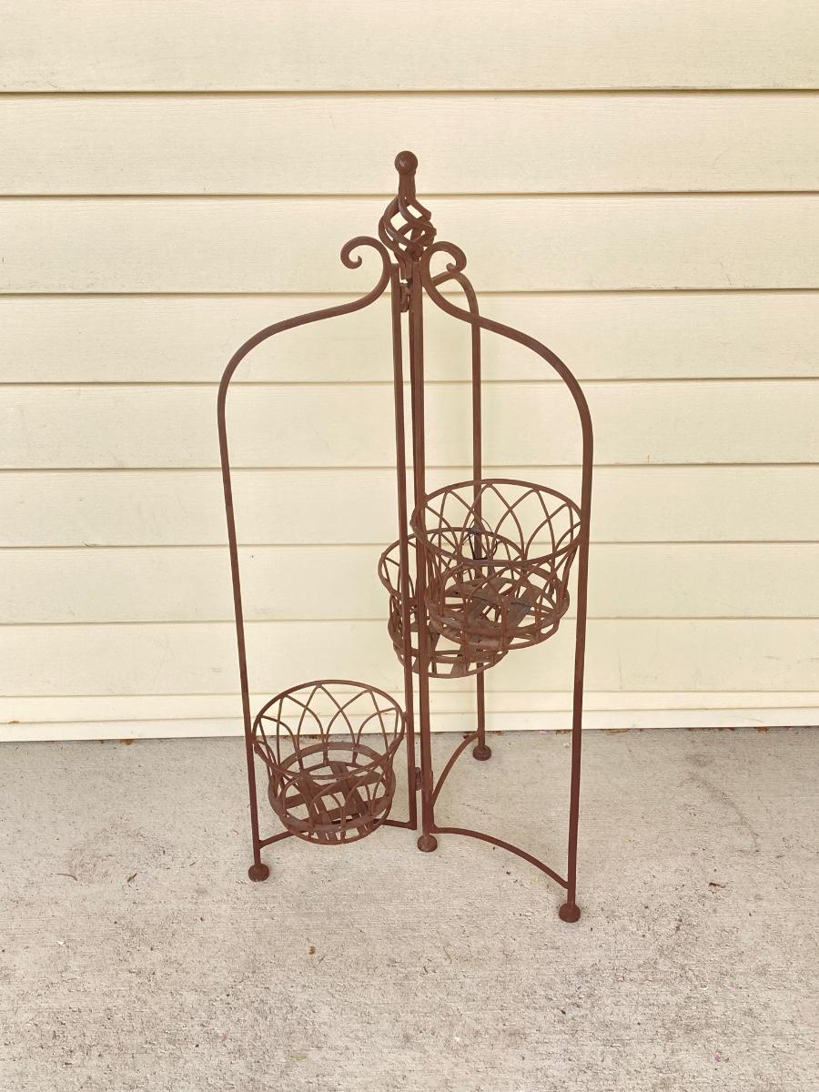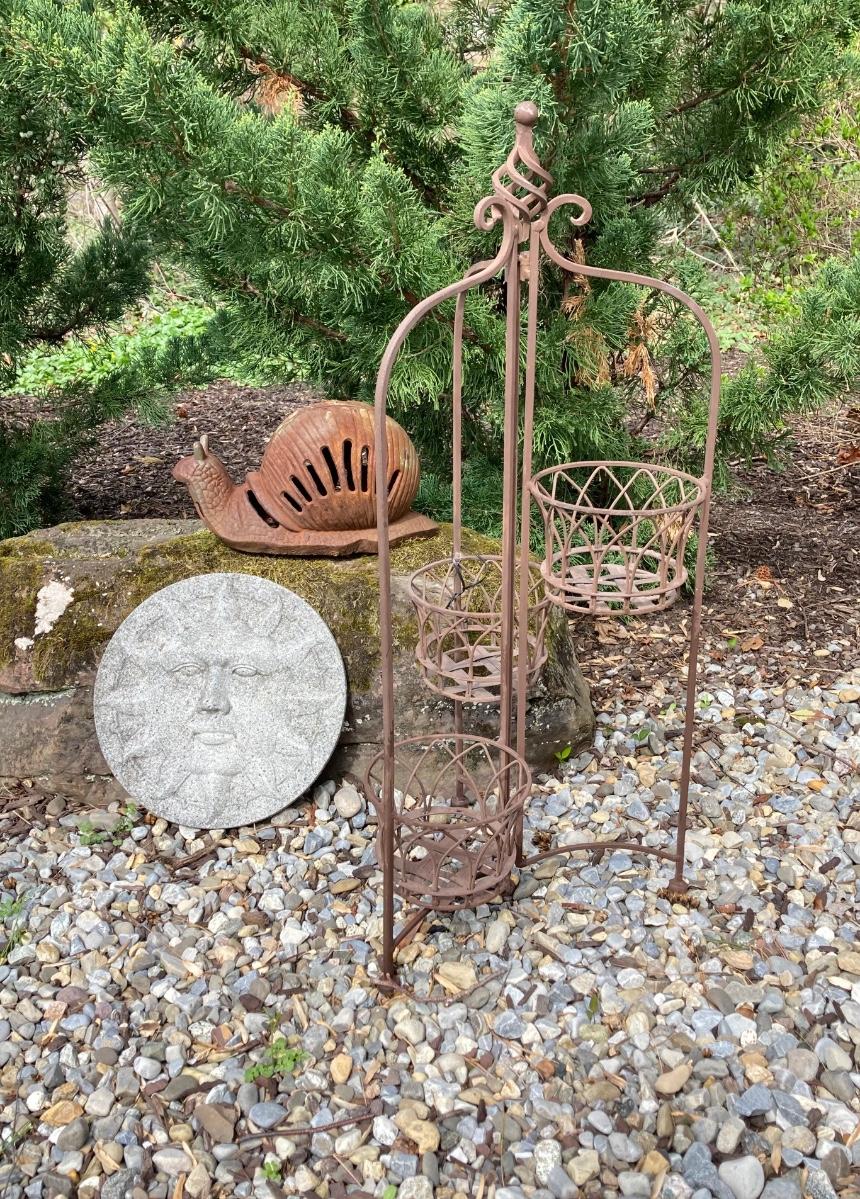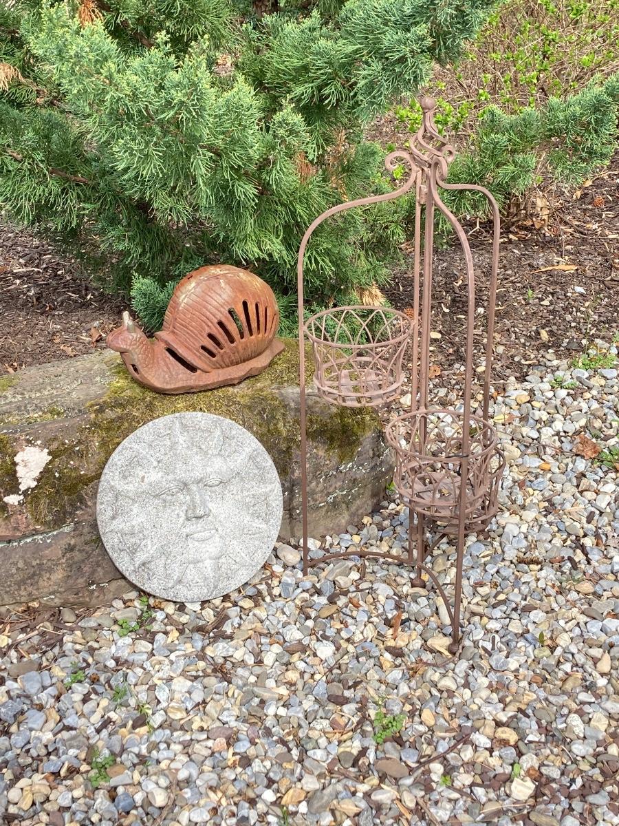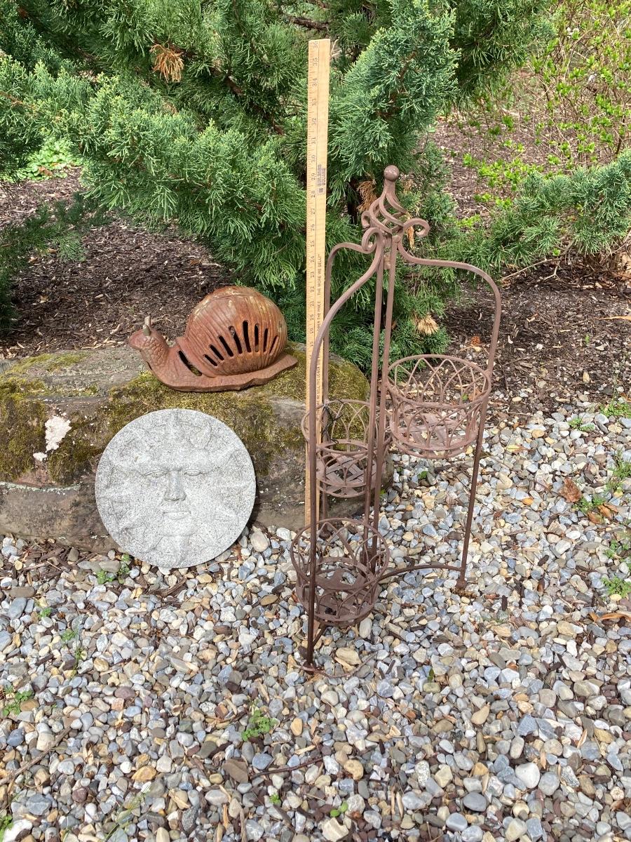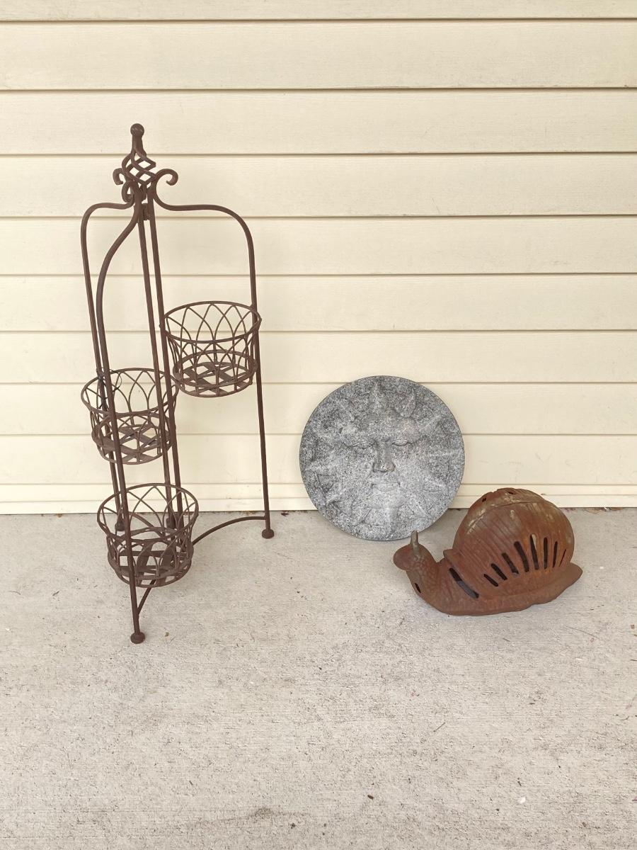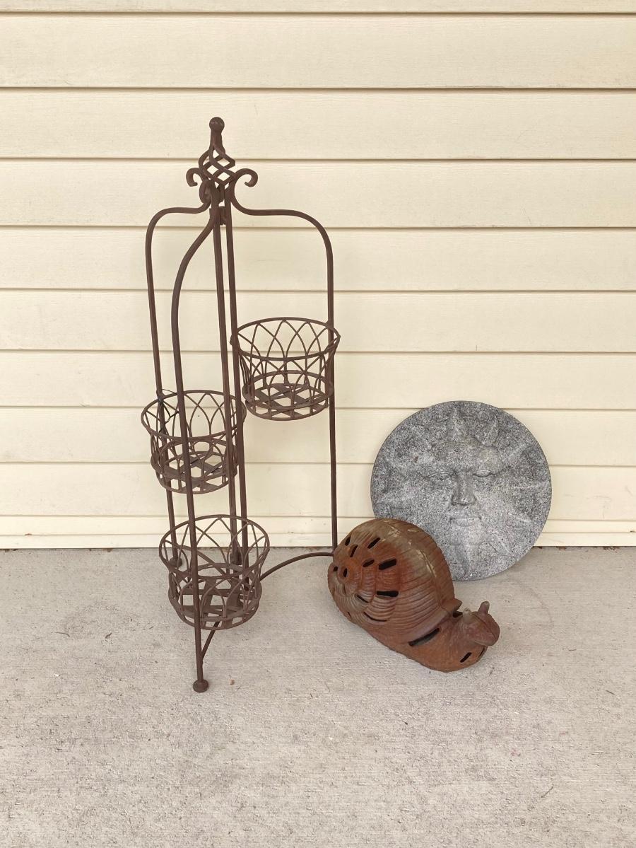 LOT 124G: Cast Iron Snail, Three Tier Folding Plant Stand and Concrete Sun Face Plaque