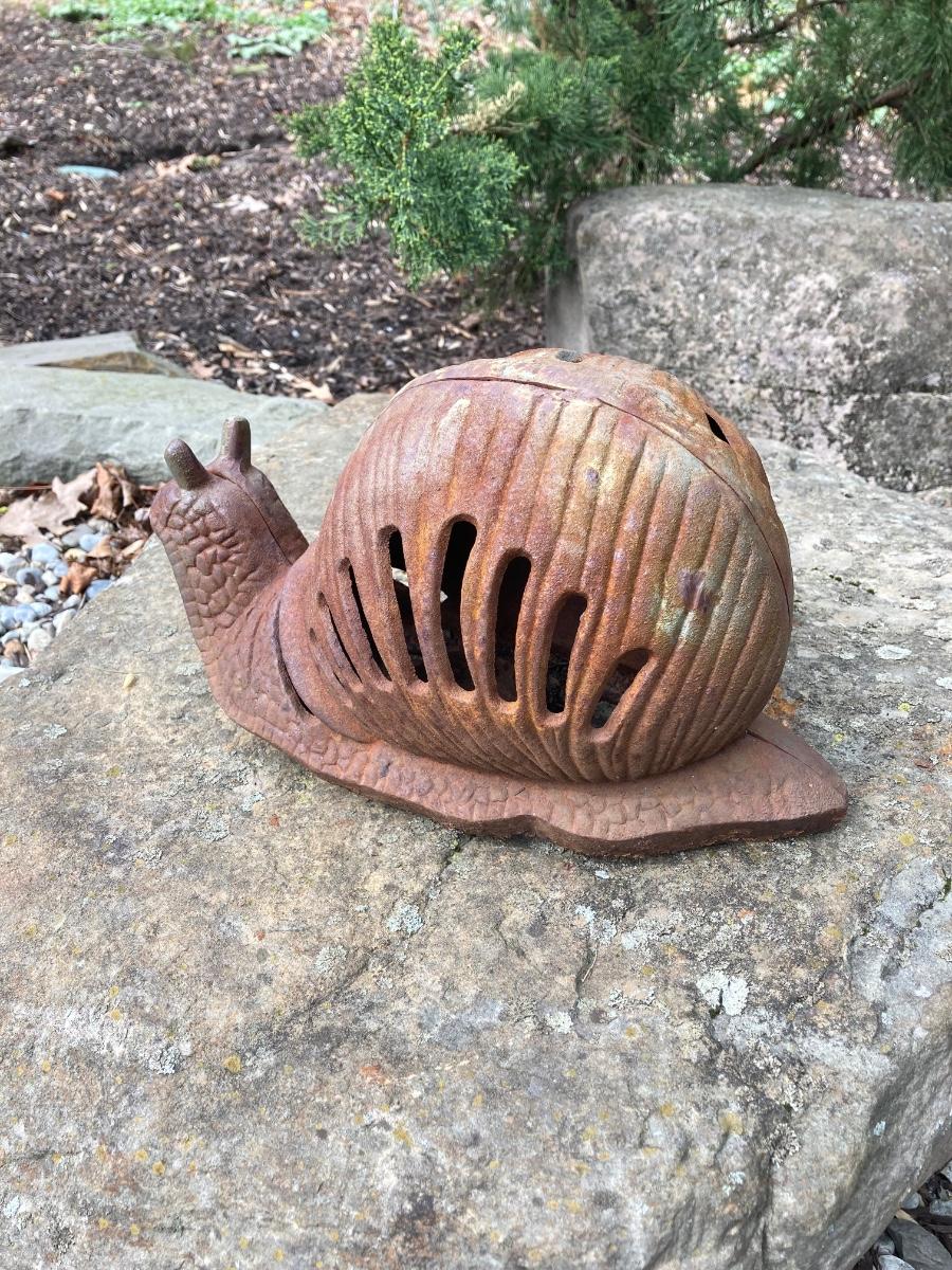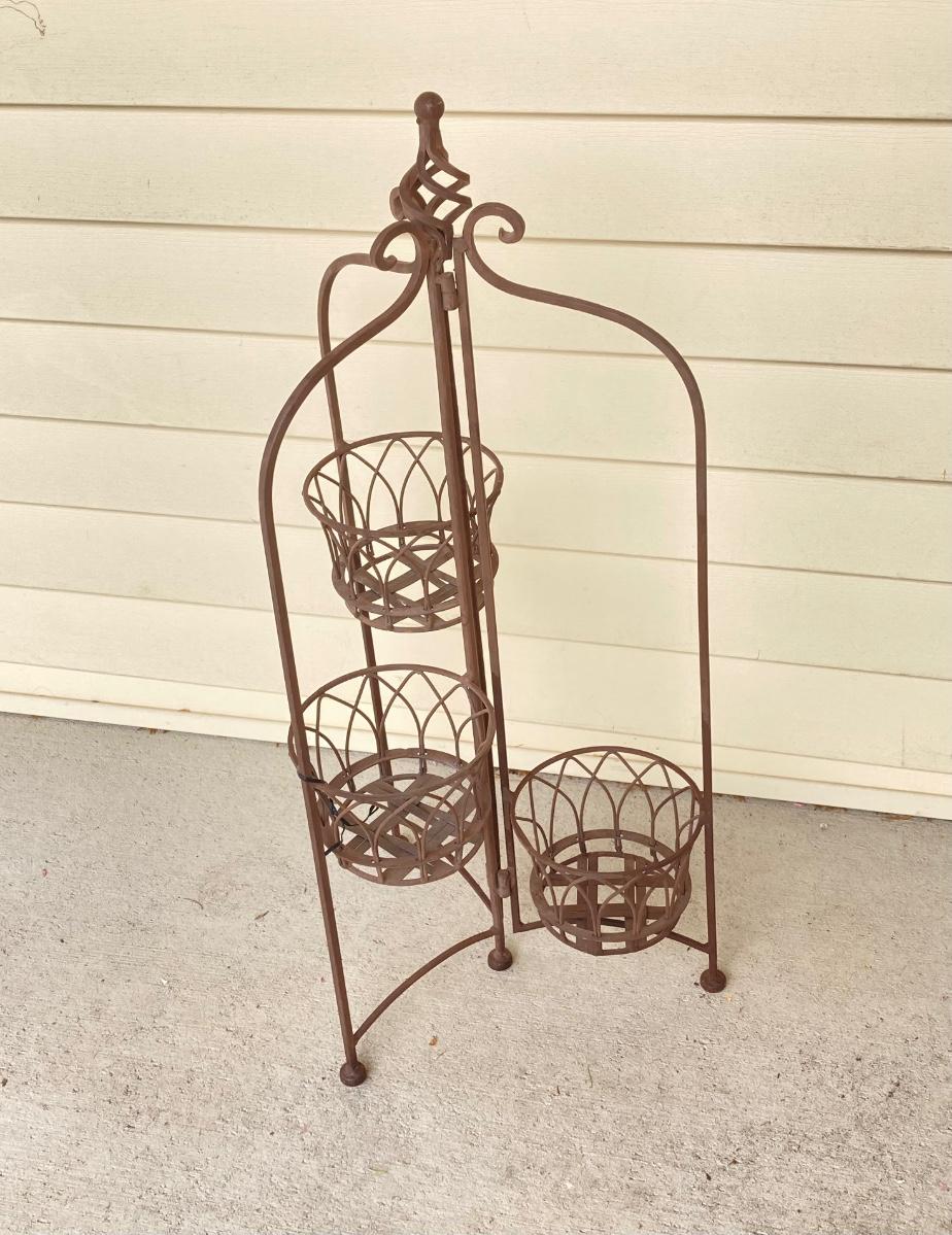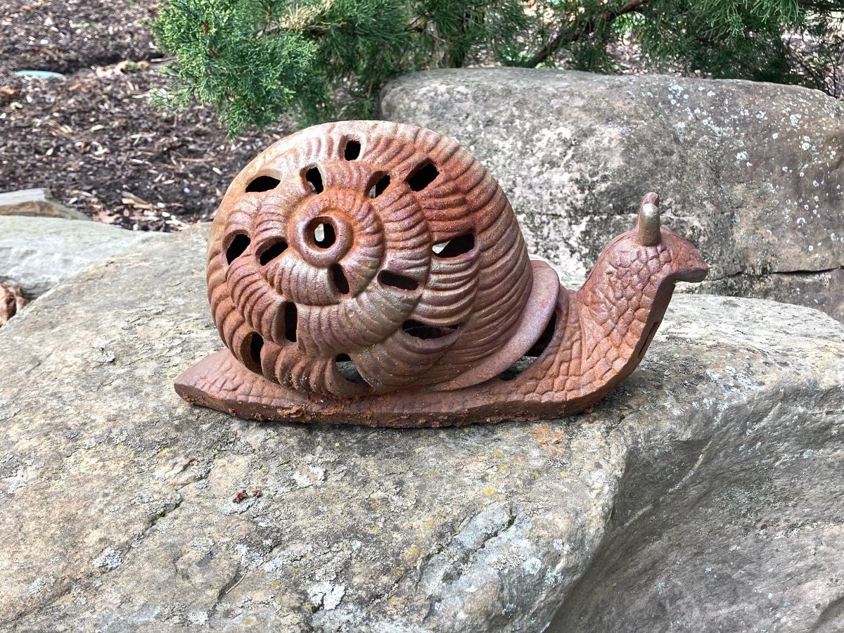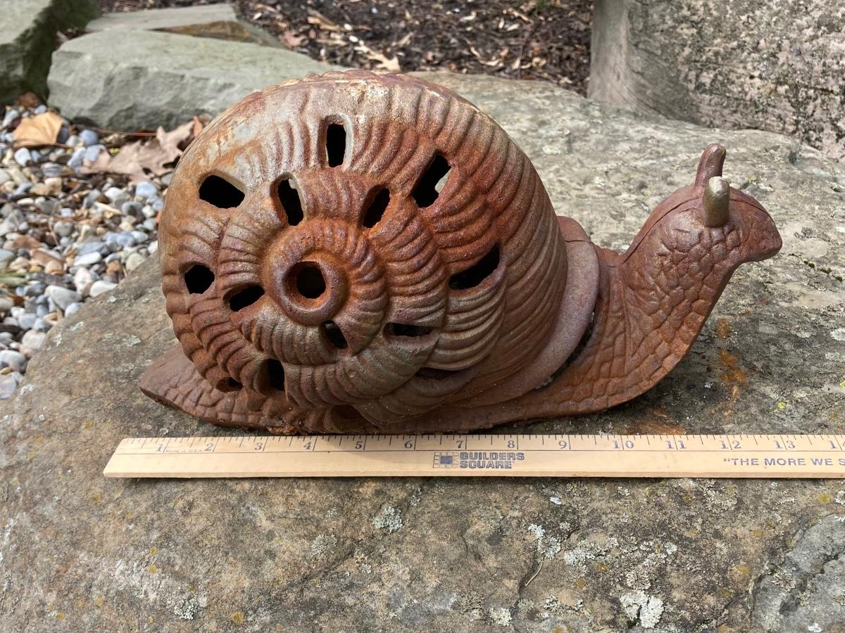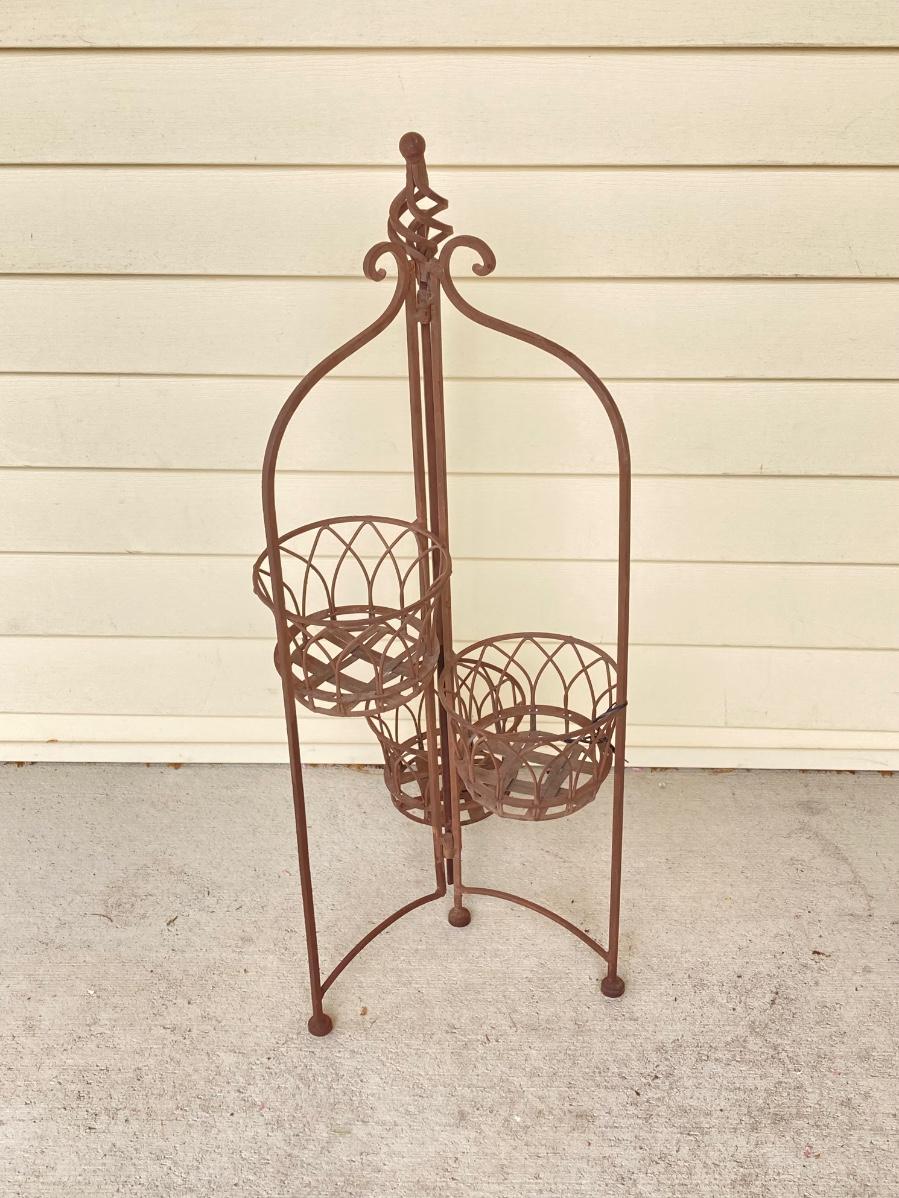 LOT 124G: Cast Iron Snail, Three Tier Folding Plant Stand and Concrete Sun Face Plaque