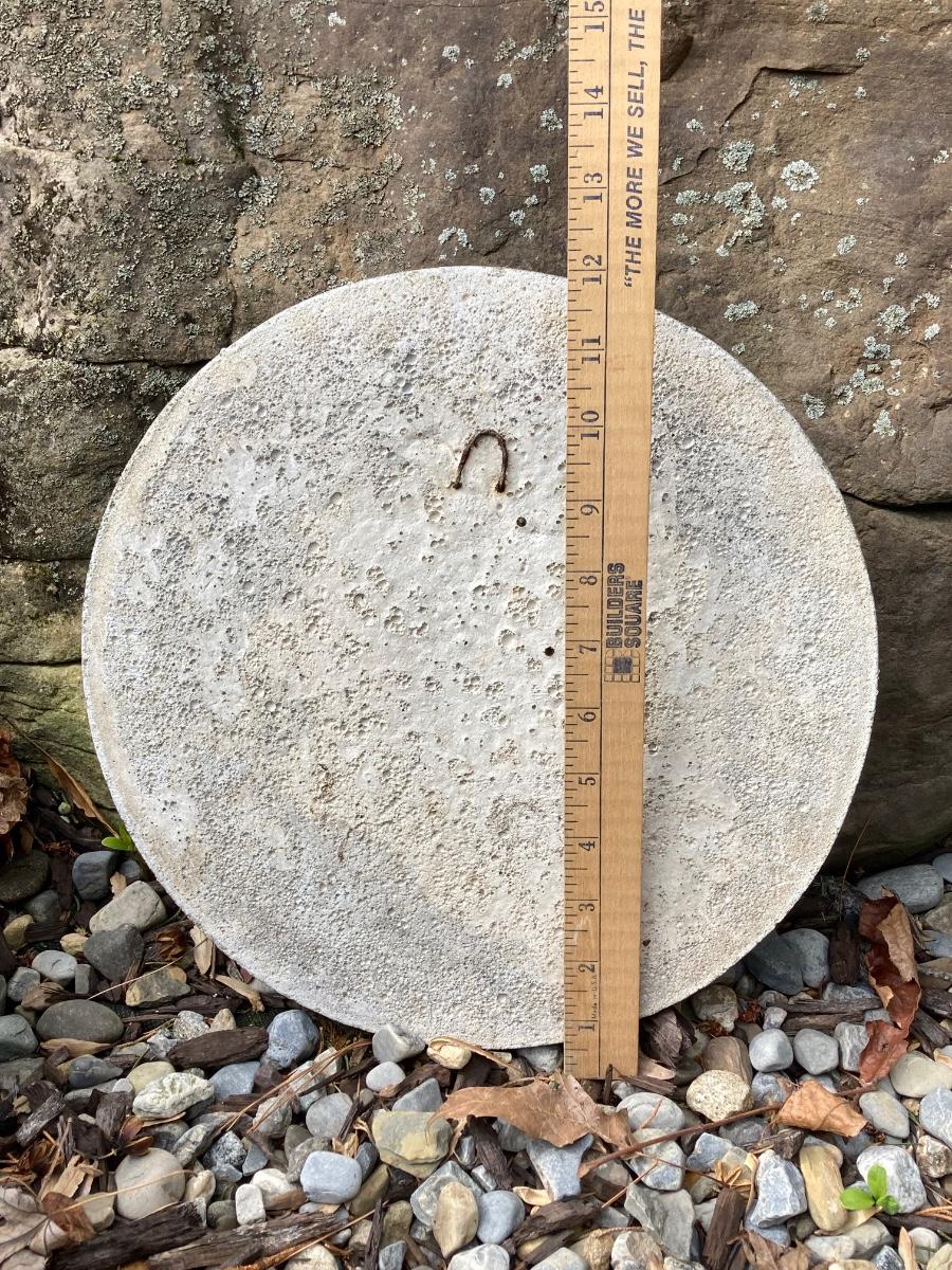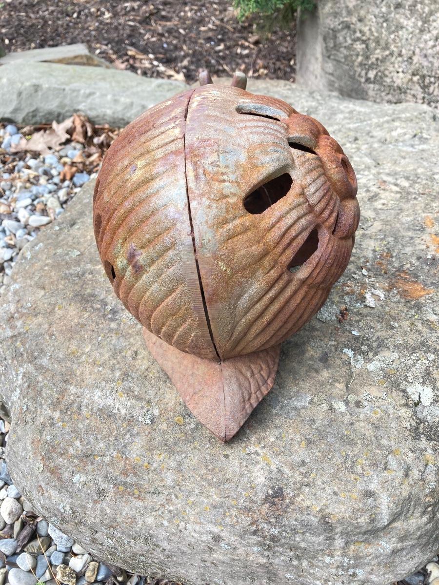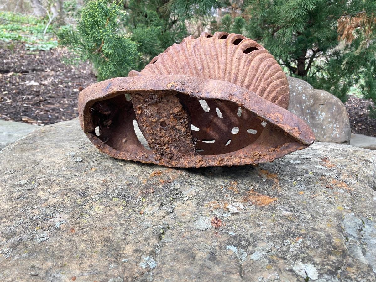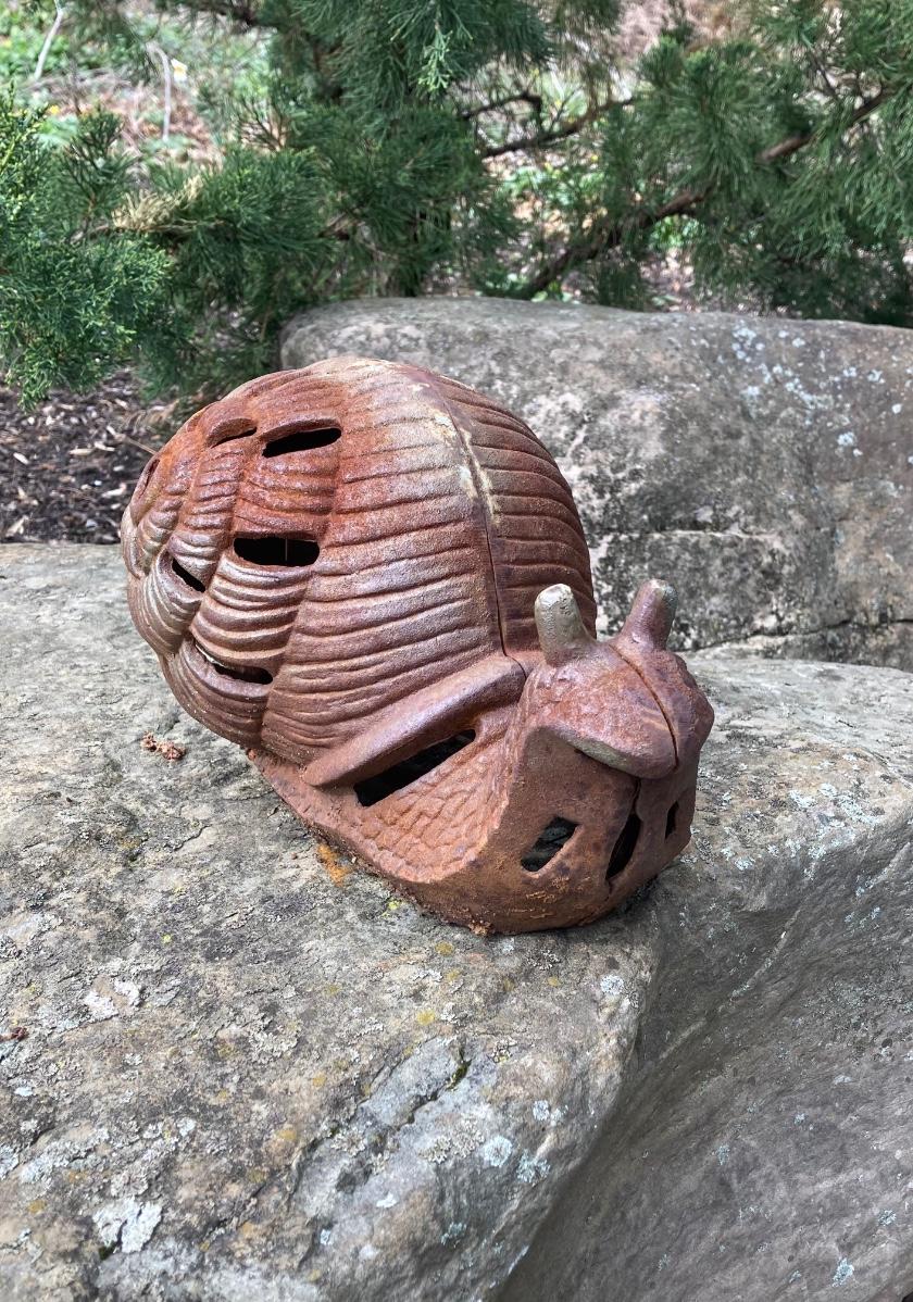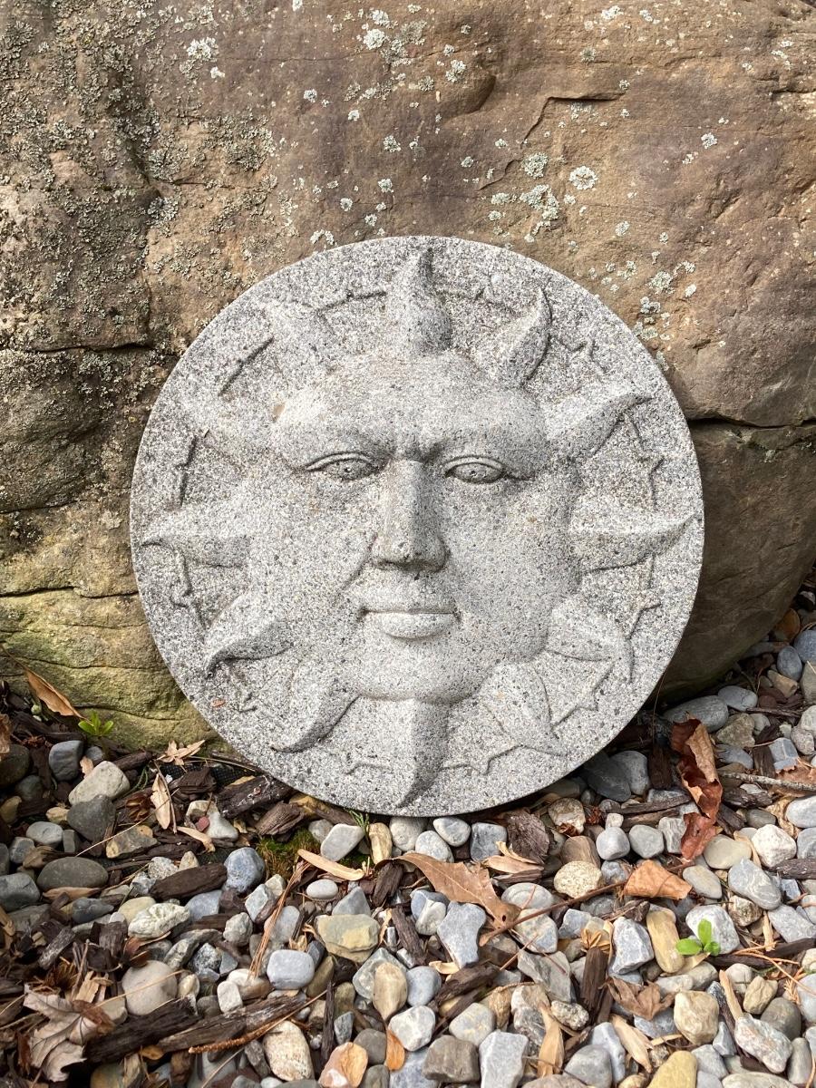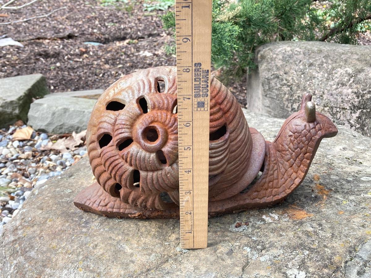 LOT 124G: Cast Iron Snail, Three Tier Folding Plant Stand and Concrete Sun Face Plaque