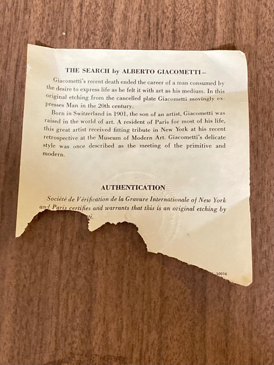LOT 132X: "The Search" by Alberto Giacometti Work of Art with Authentication