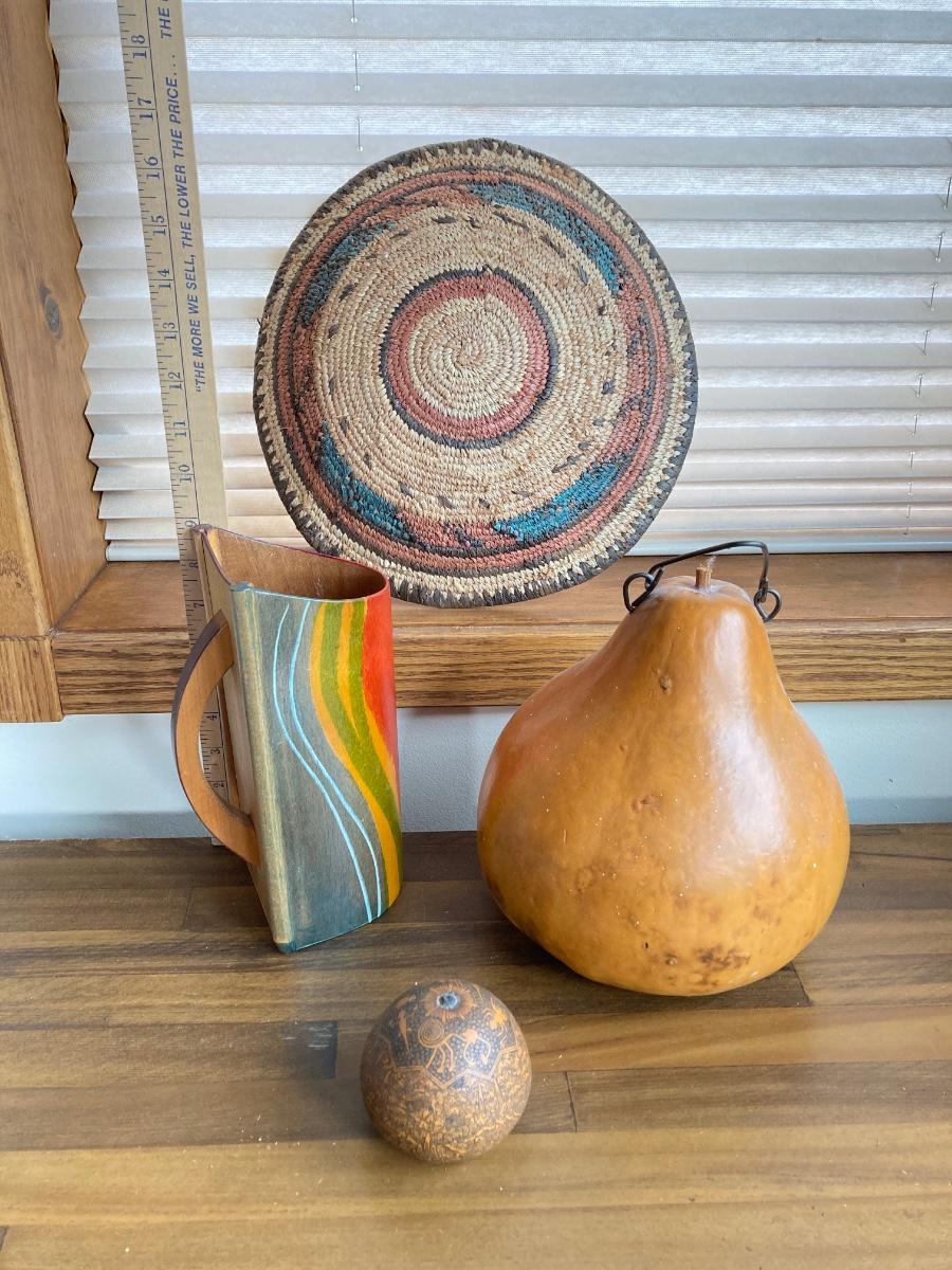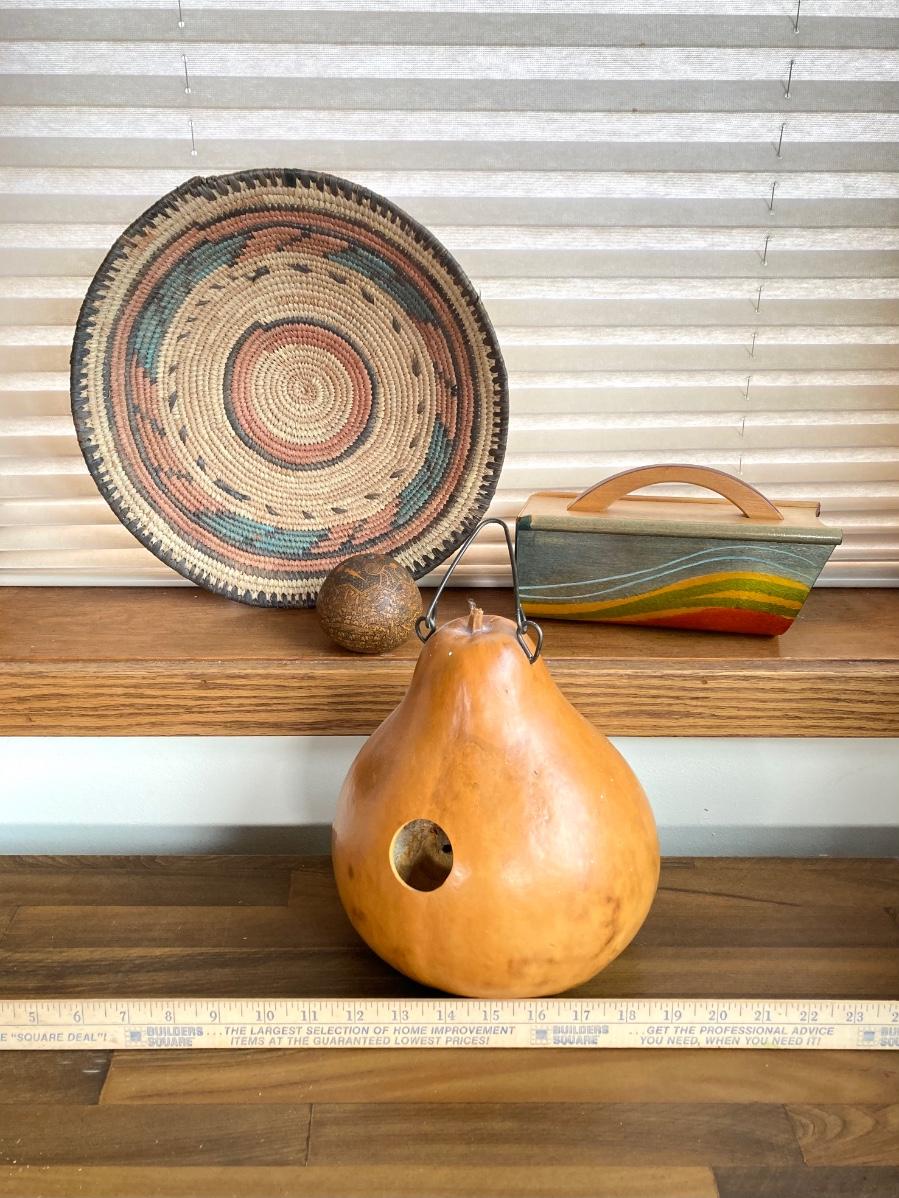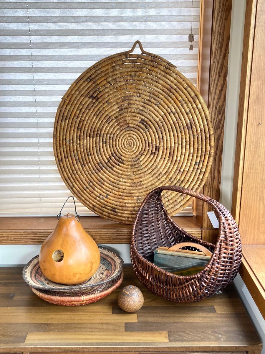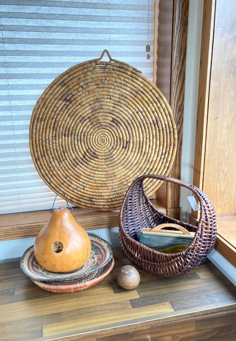 LOT 135X: Collection of Decorative Gourds, Boho Flat Baskets, Wall Art and Kakadu Hand Painted Wooden Scoop