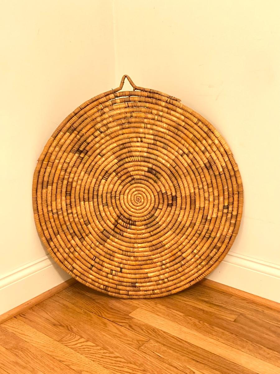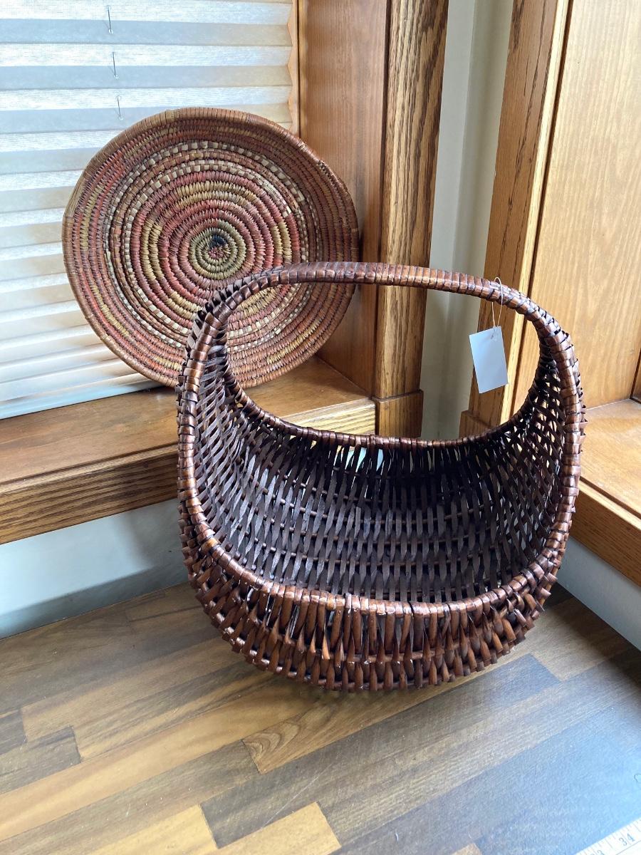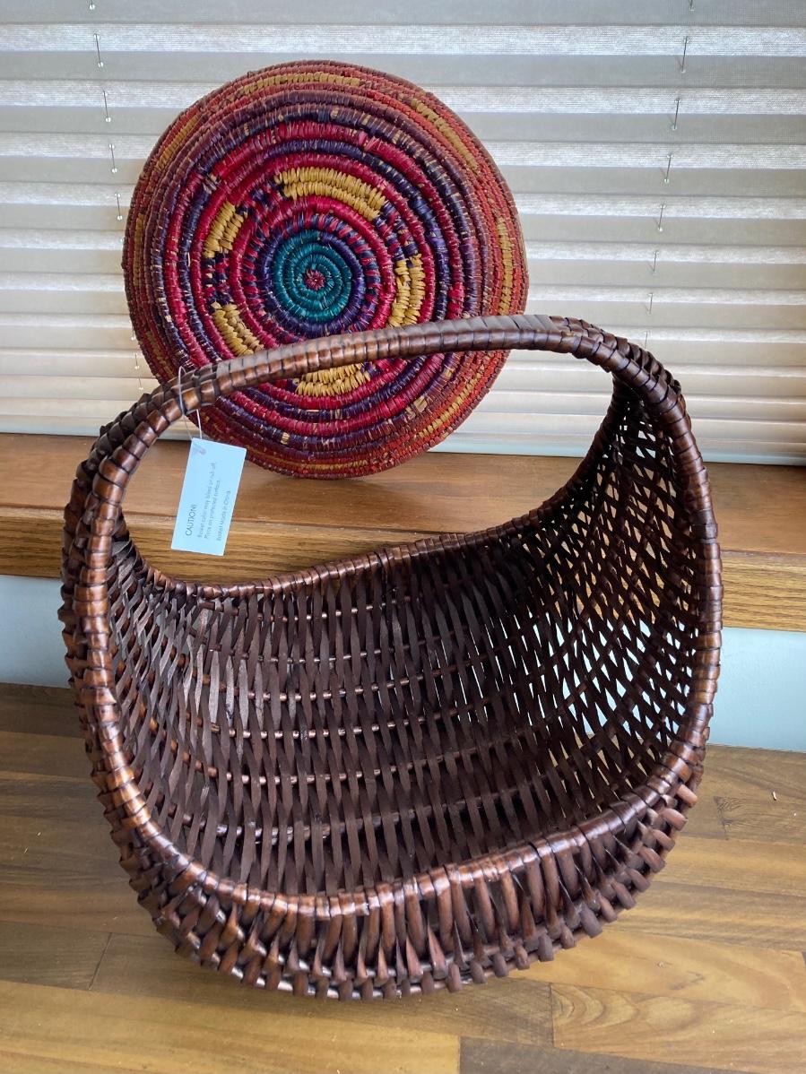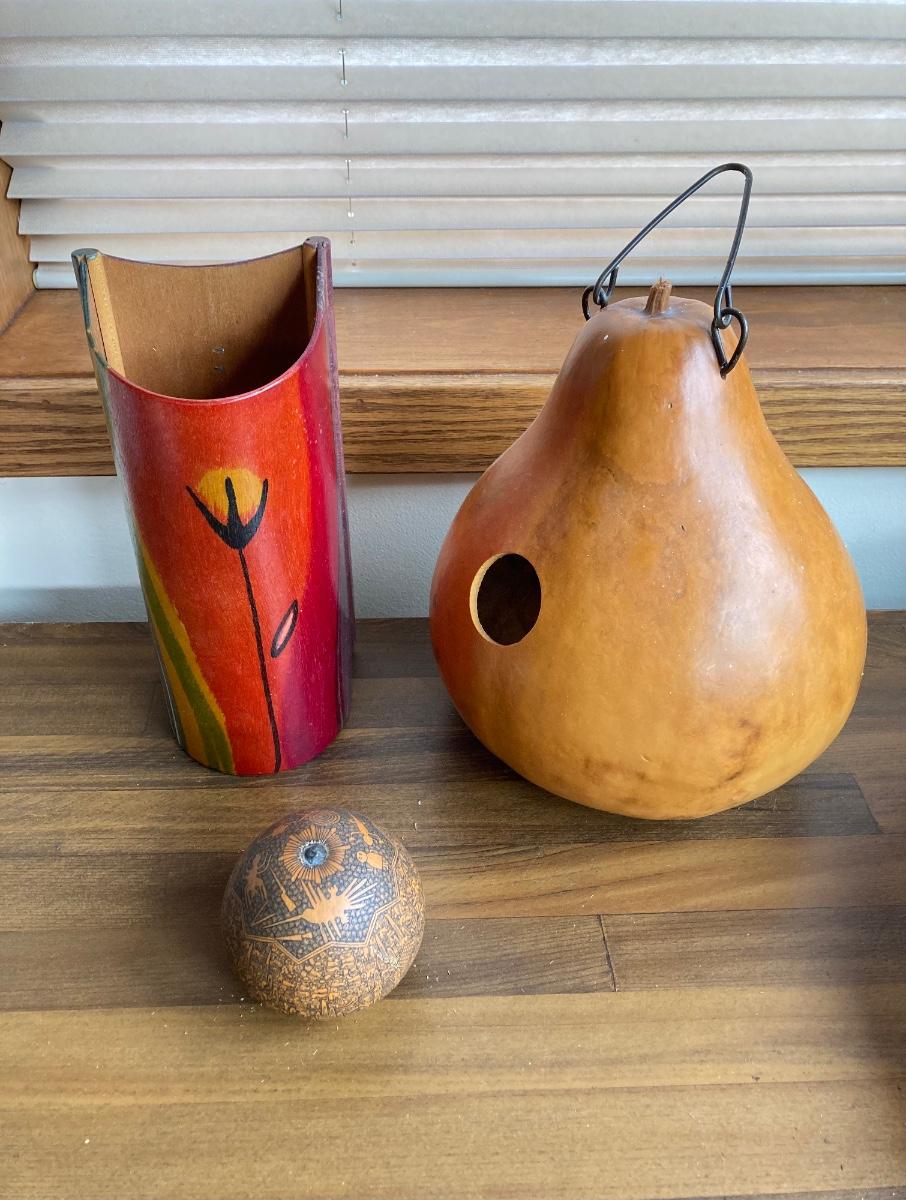 LOT 135X: Collection of Decorative Gourds, Boho Flat Baskets, Wall Art and Kakadu Hand Painted Wooden Scoop