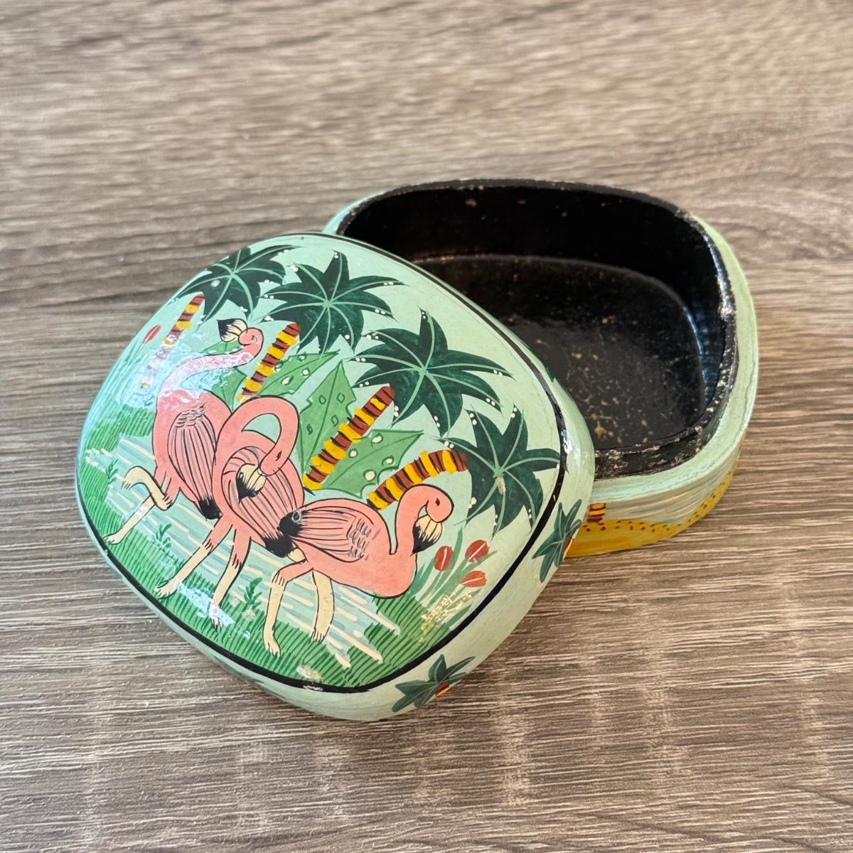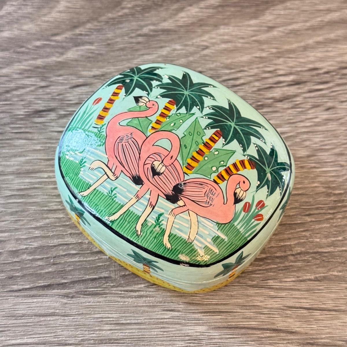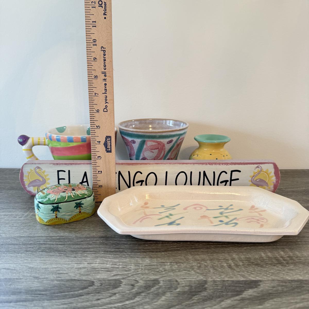 LOT 145K: Flamingo Lounge Dennis East Sign, Wood Flamingo Trinket Box made in India, Signed Pastel Pottery & More