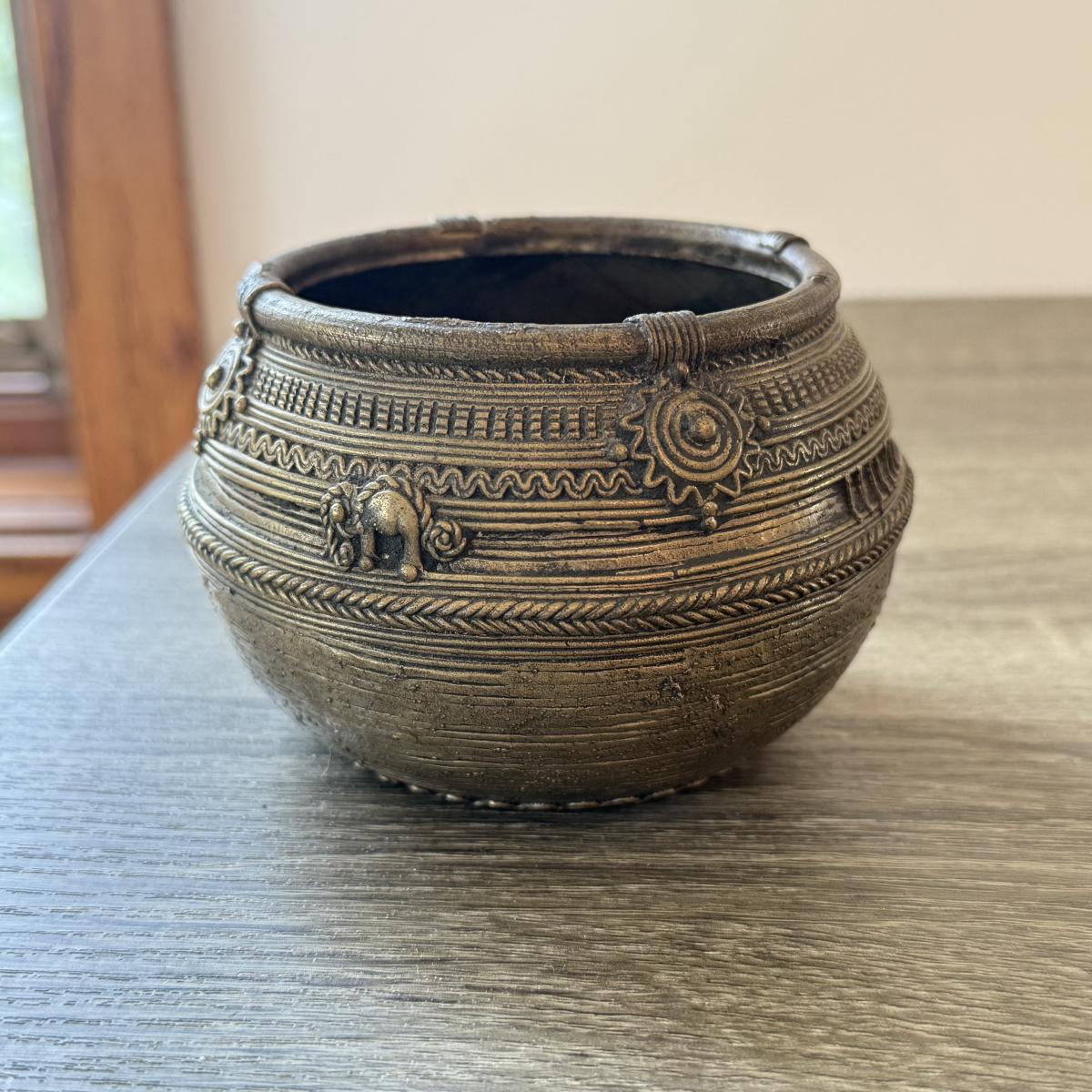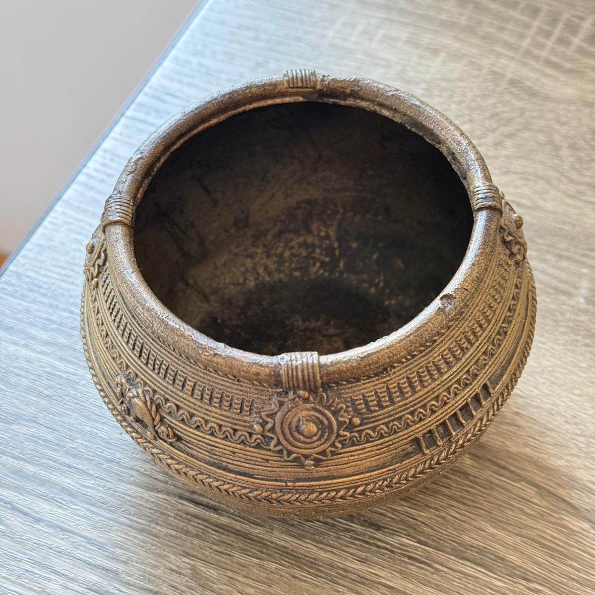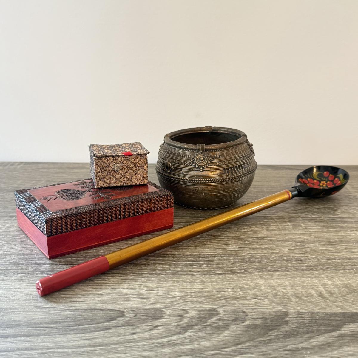 LOT 149K: Antique Brass Pot, Fabric Trinket Box, Wooden Carved Box & More