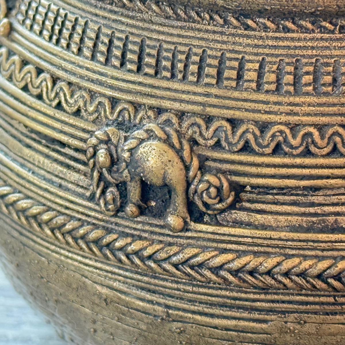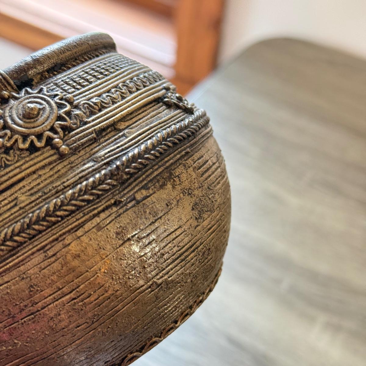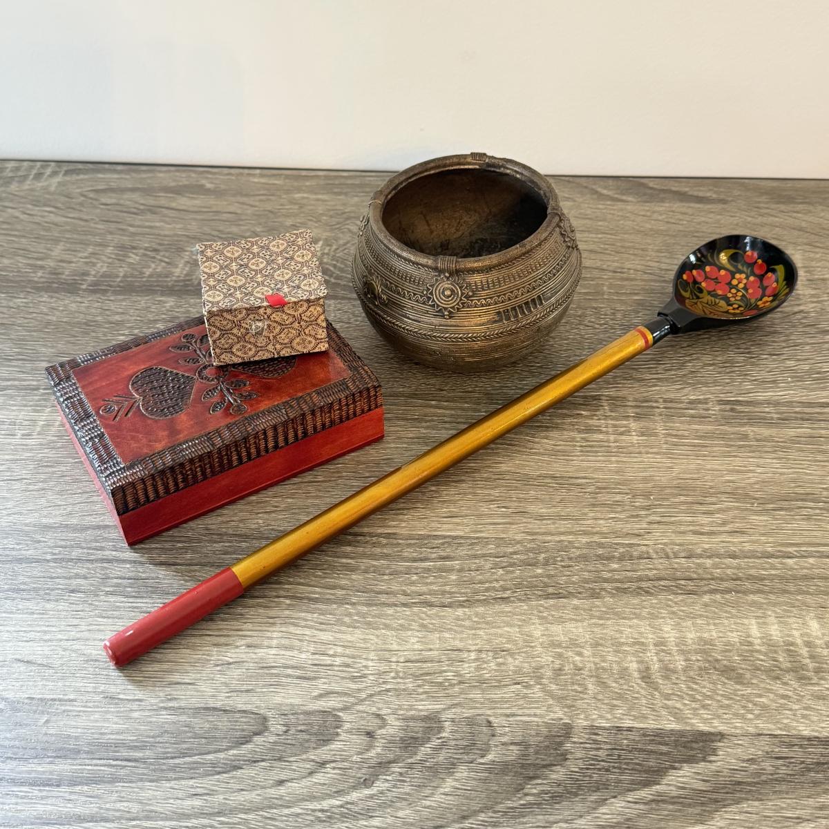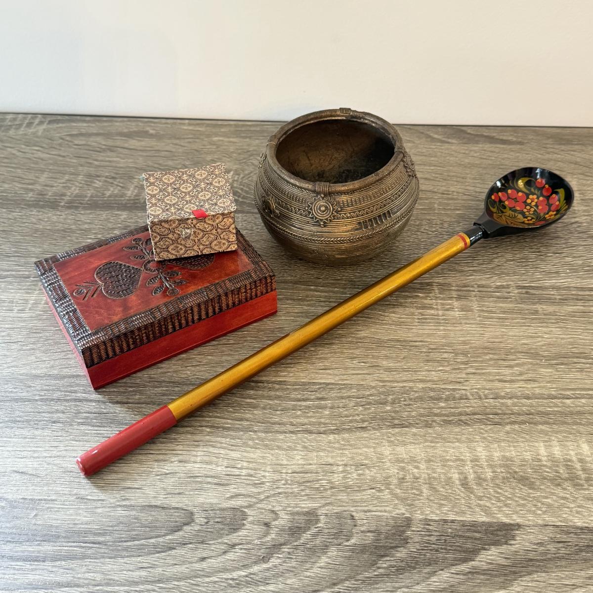 LOT 149K: Antique Brass Pot, Fabric Trinket Box, Wooden Carved Box & More