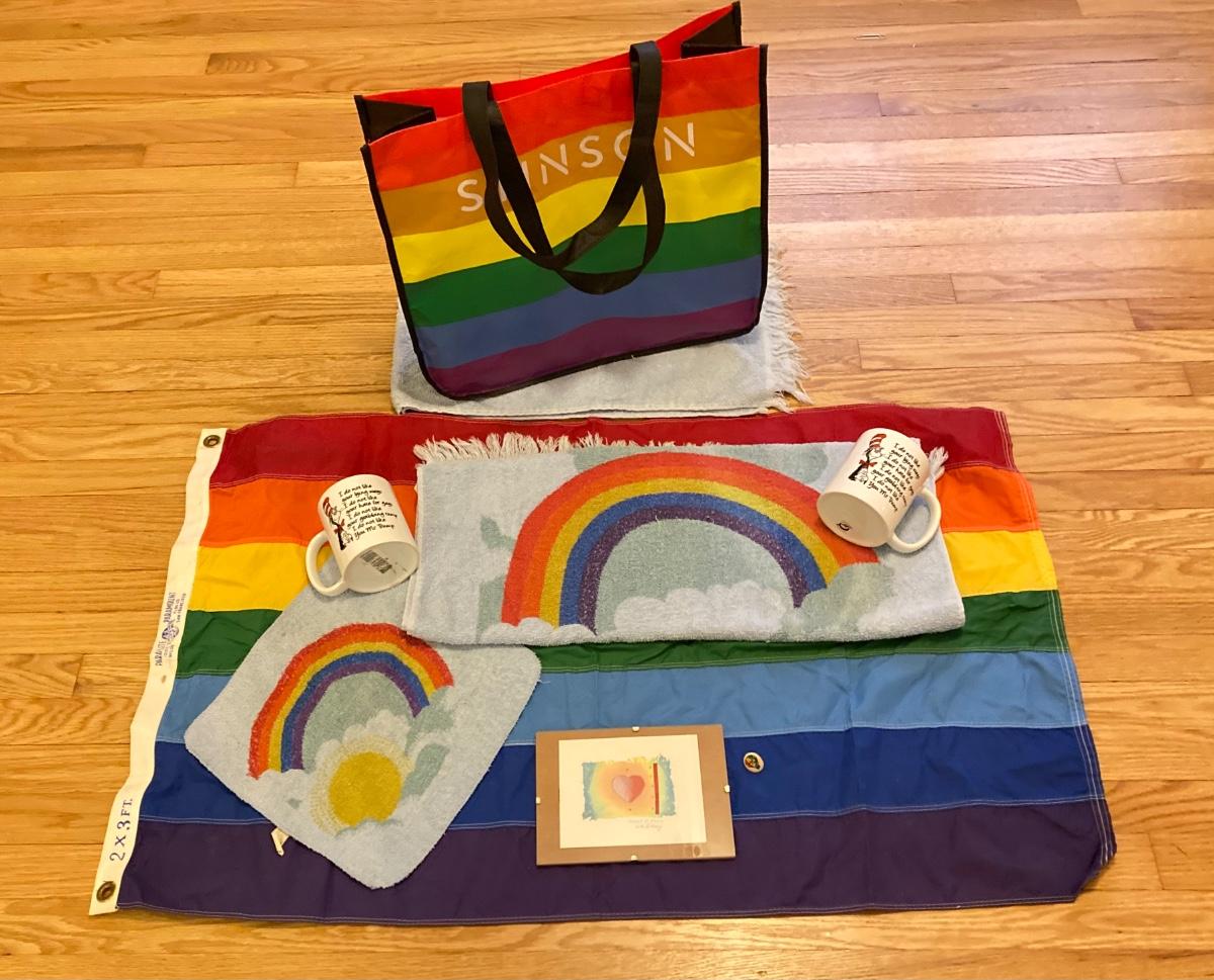 LOT 161X: Pride Collection - "Heart of Mine" Signed Artwork, Para-Lite Paramount Flag Co Outdoor Flag, 3 Towel Set, Stinson Tote, Mugs and Piin