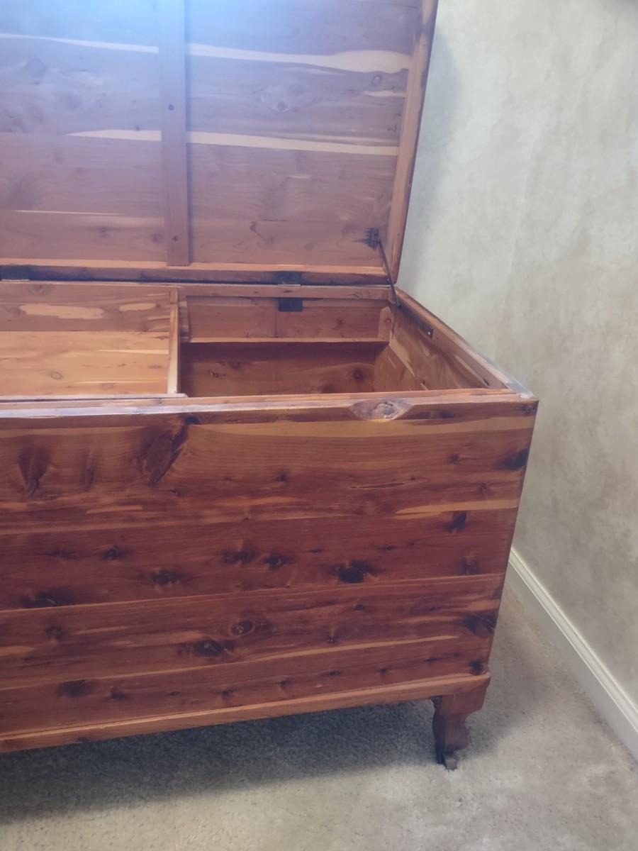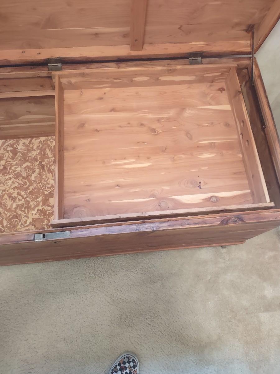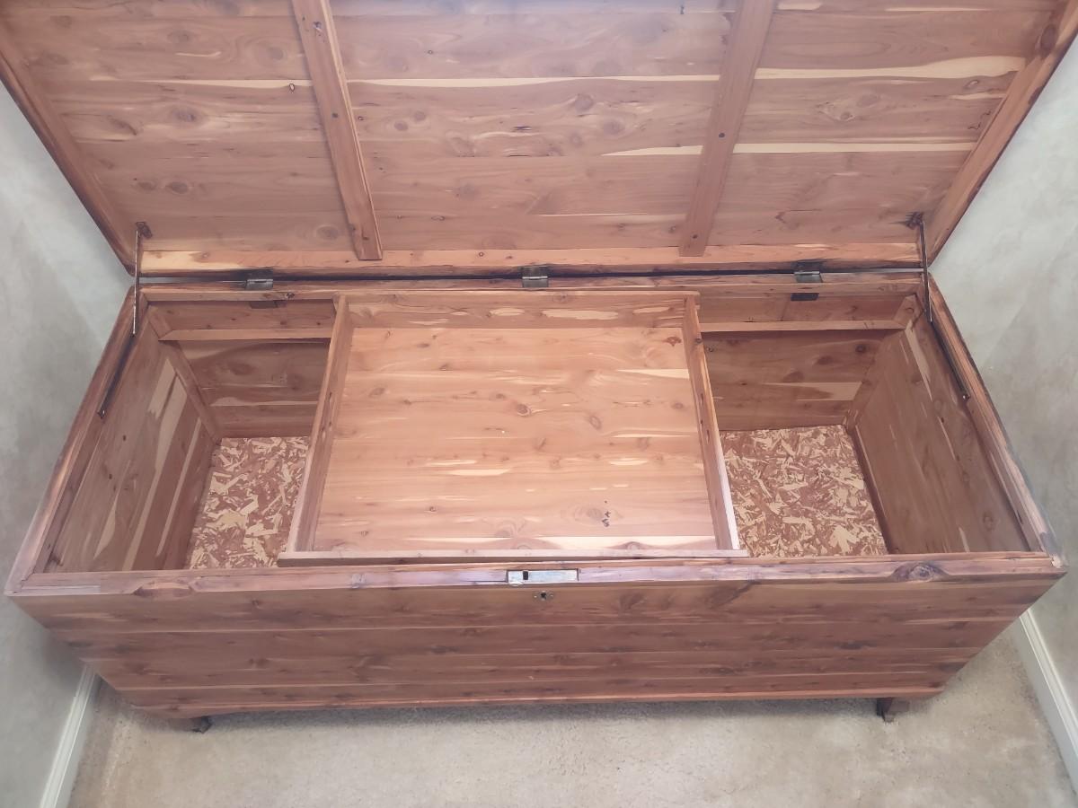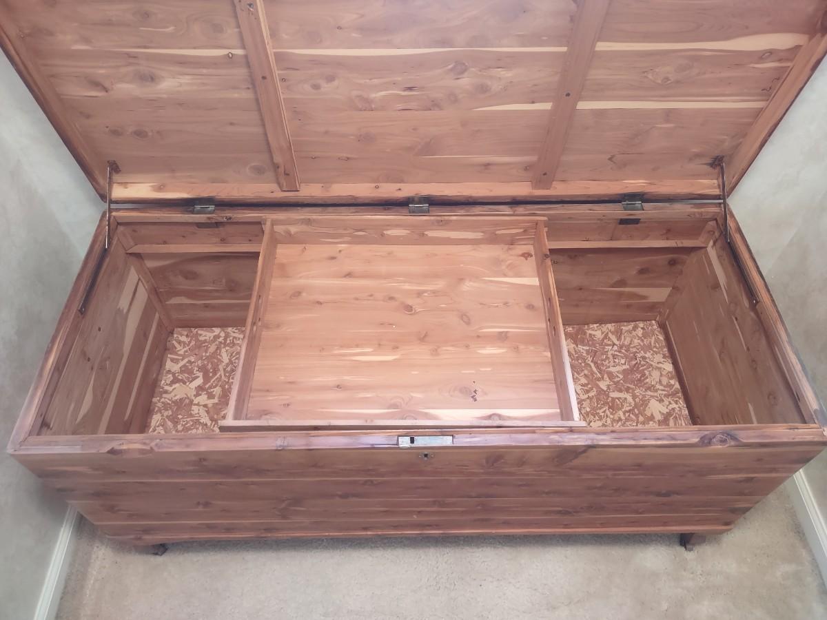 LOT 164: Wooden Chest w/ Rolling Inner Shelf (W-47.5 in, D-20 in, H-24in)