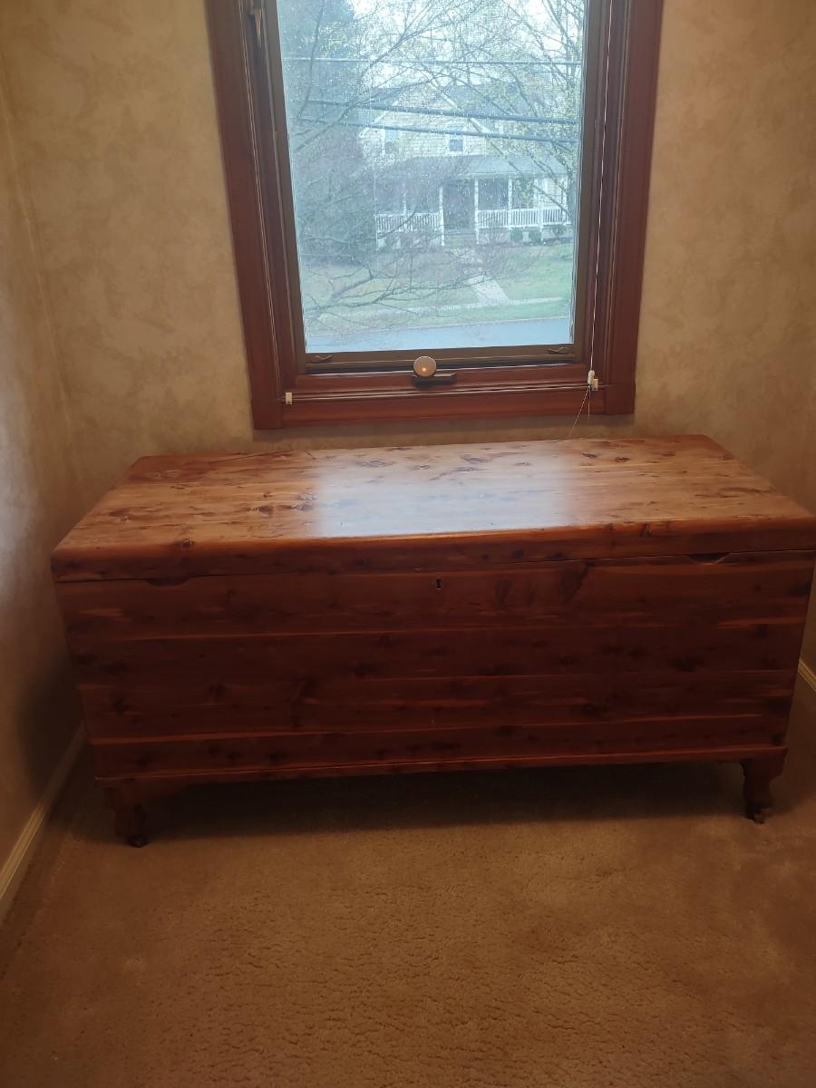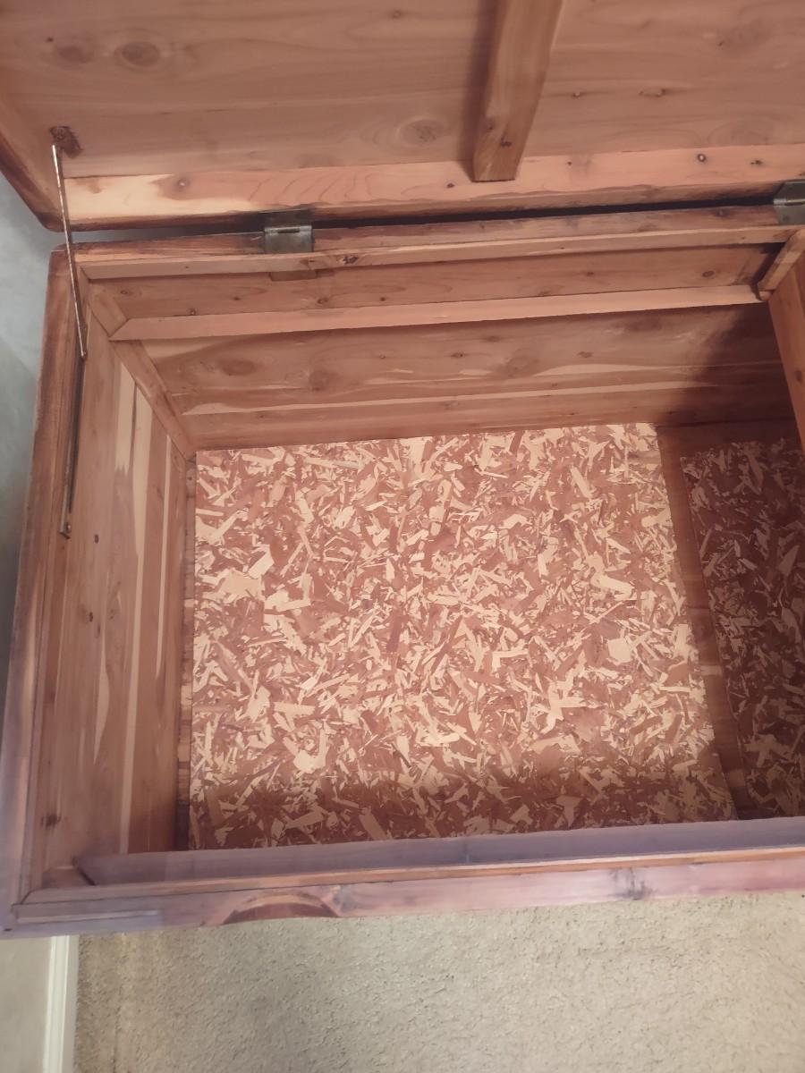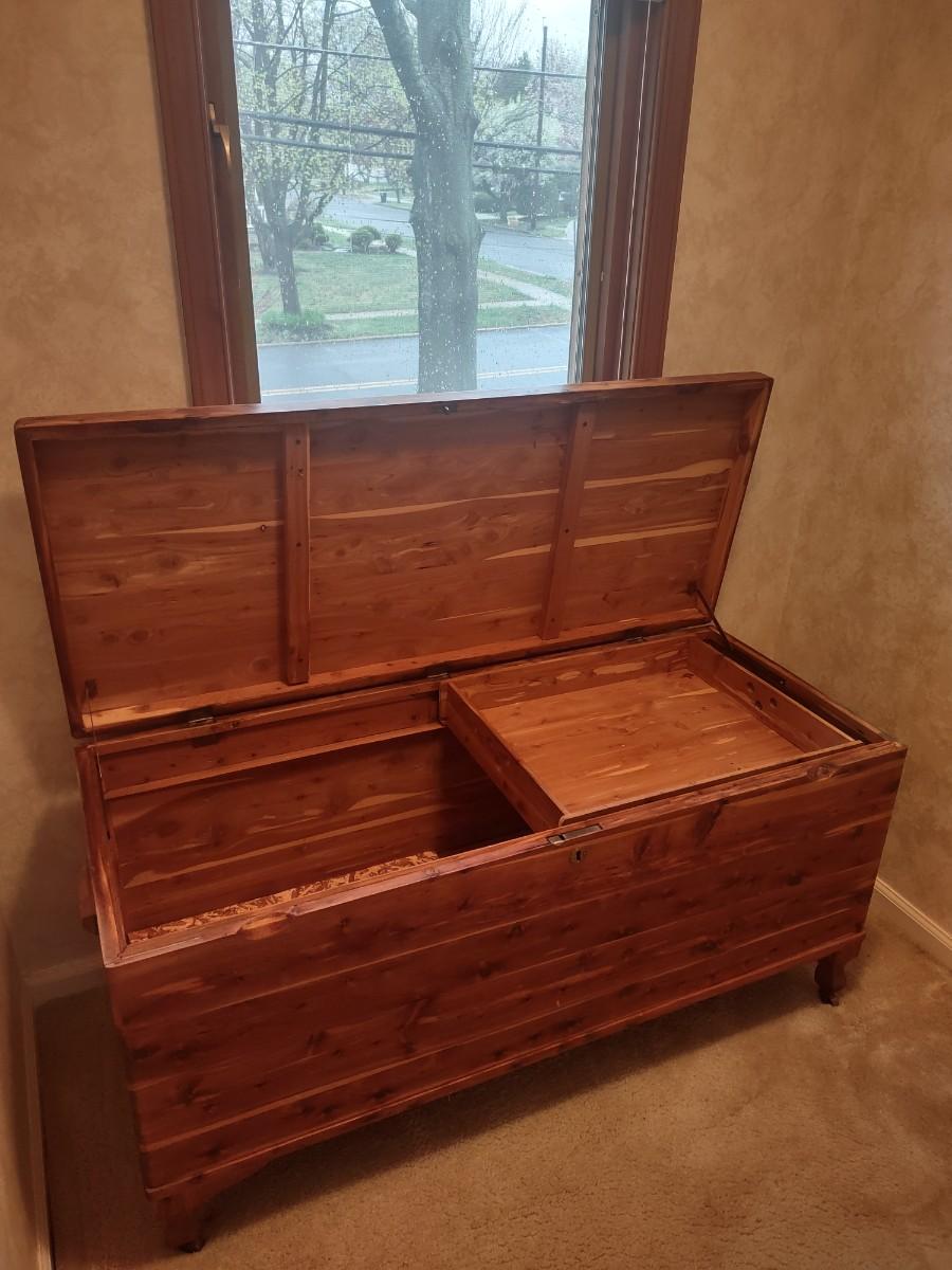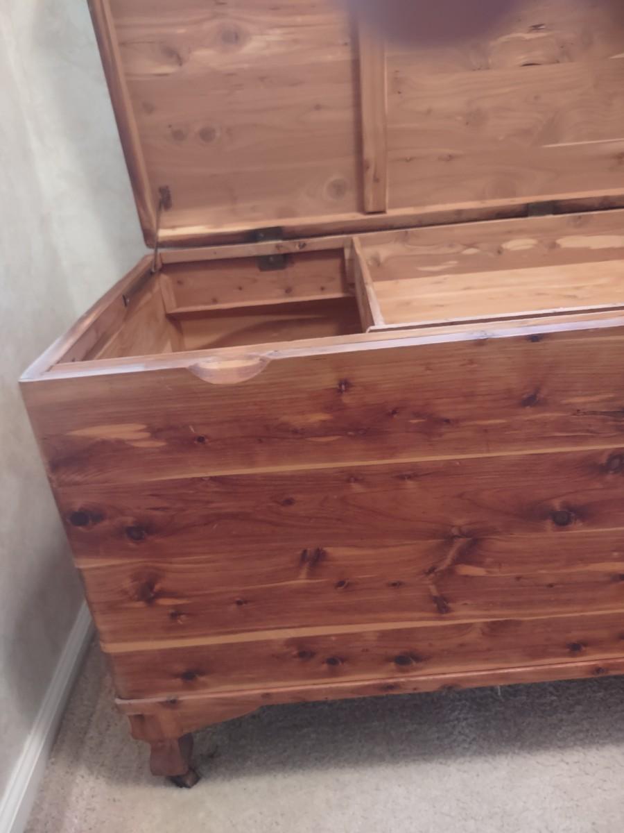 LOT 164: Wooden Chest w/ Rolling Inner Shelf (W-47.5 in, D-20 in, H-24in)
