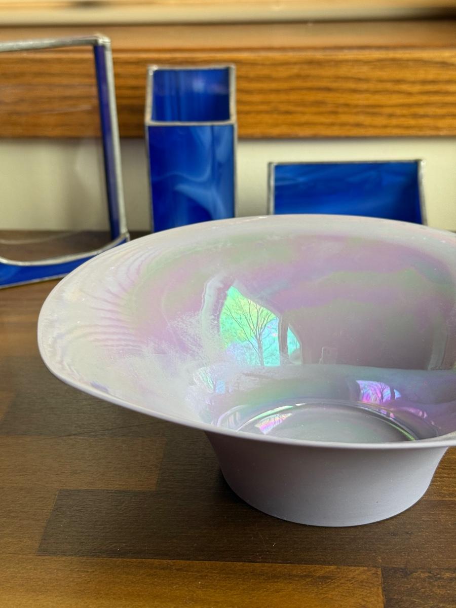 LOT 227: Signed Kathleen Ryan Iridescent Bowl, Mini Green Glass Vase, Blue Stained Glass Pieces & More