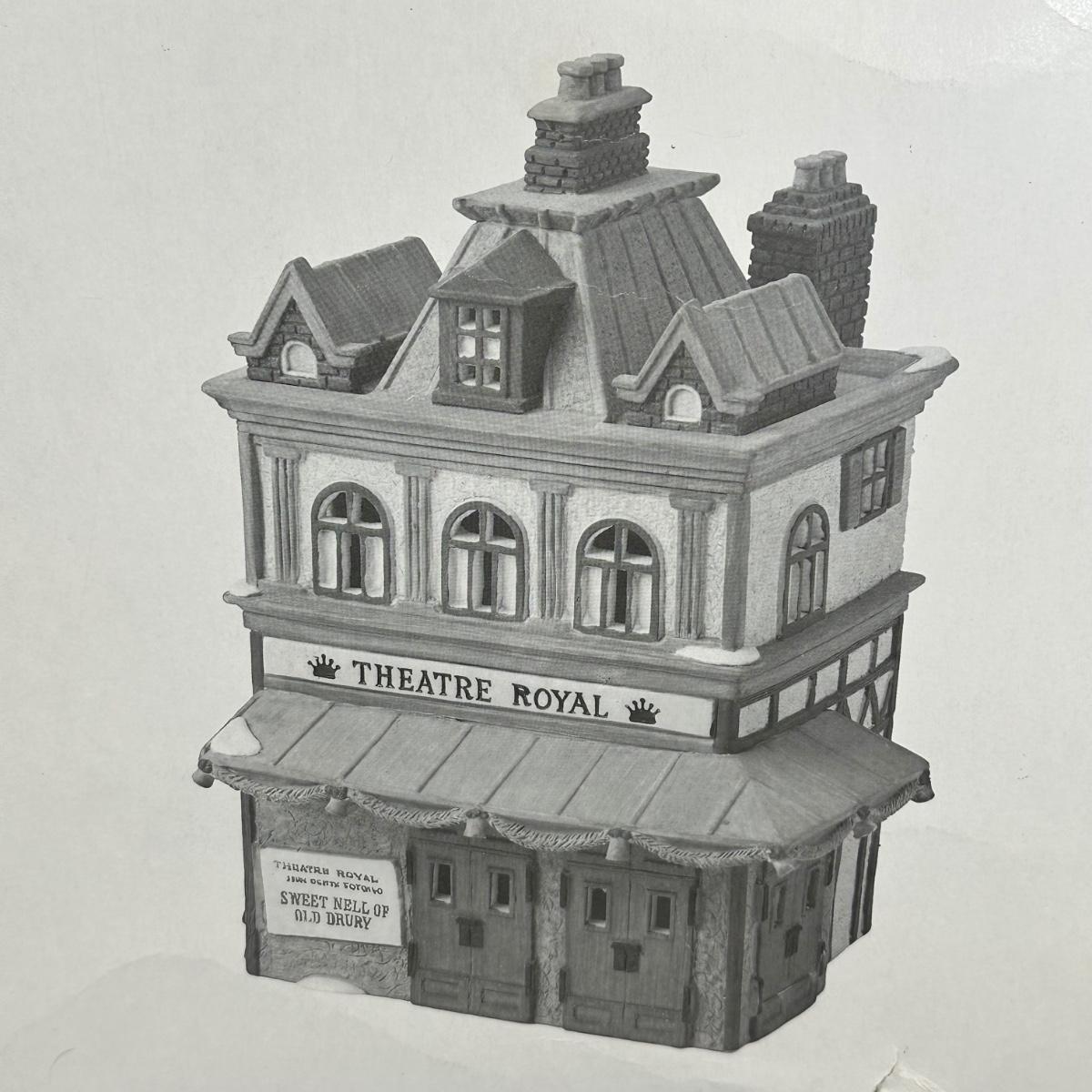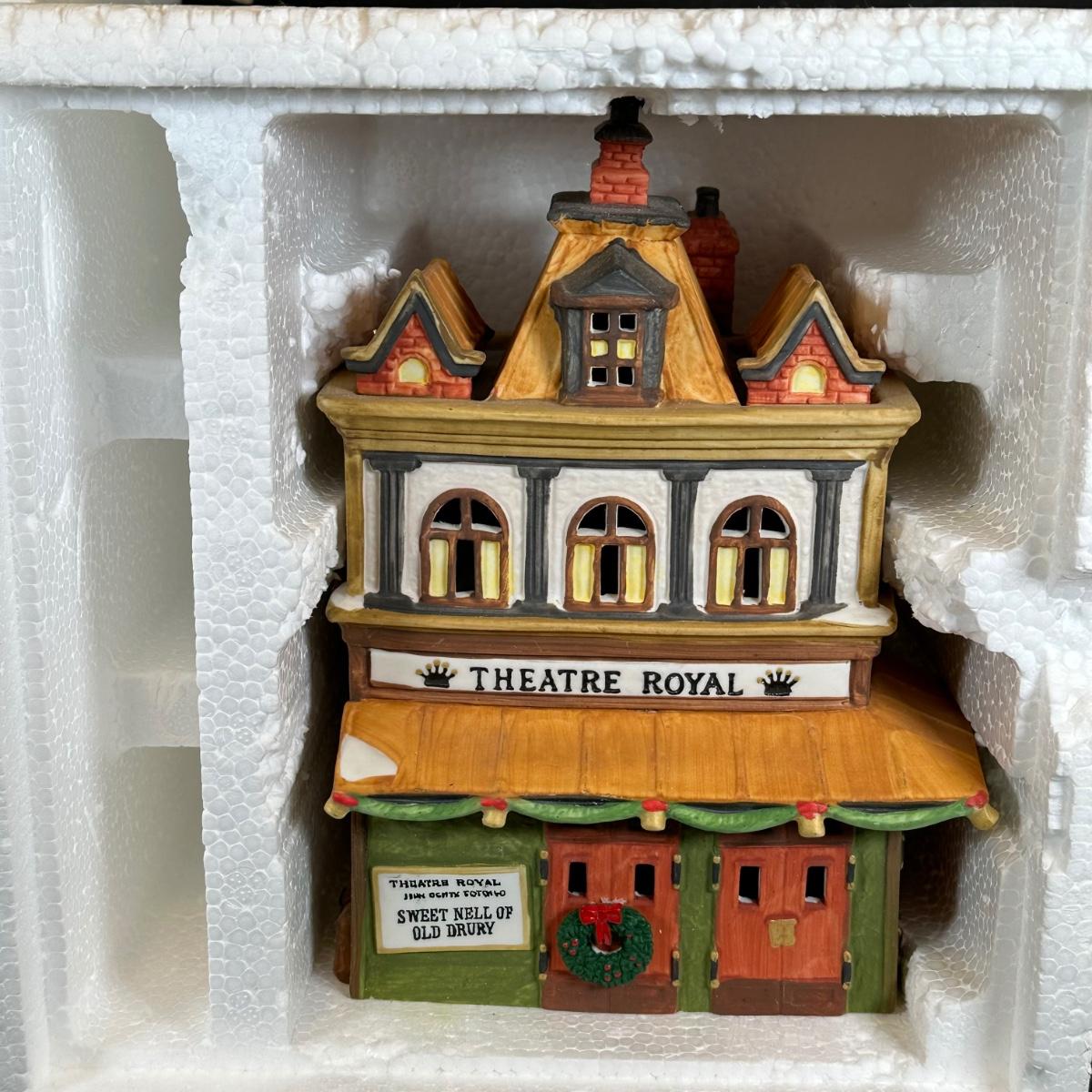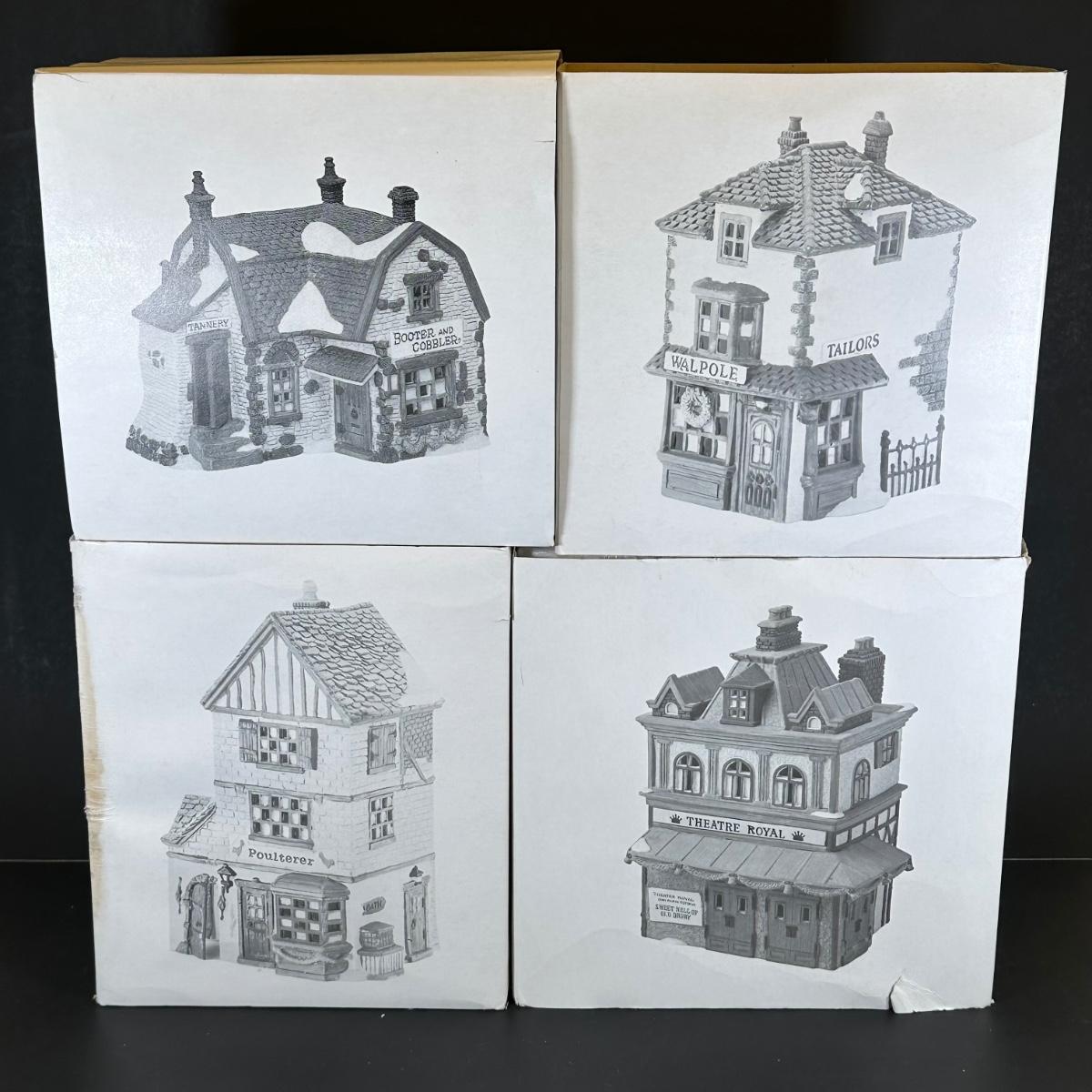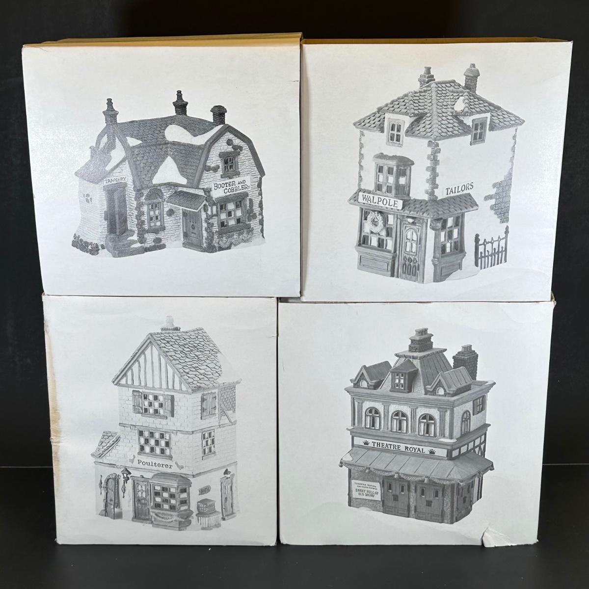 LOT 11K: Department 56 Heritage Village Collection Dickens Village Series - Theater Royal, Poulterer, Walpole Tailors & T Wells Fruit & Spice Shop
