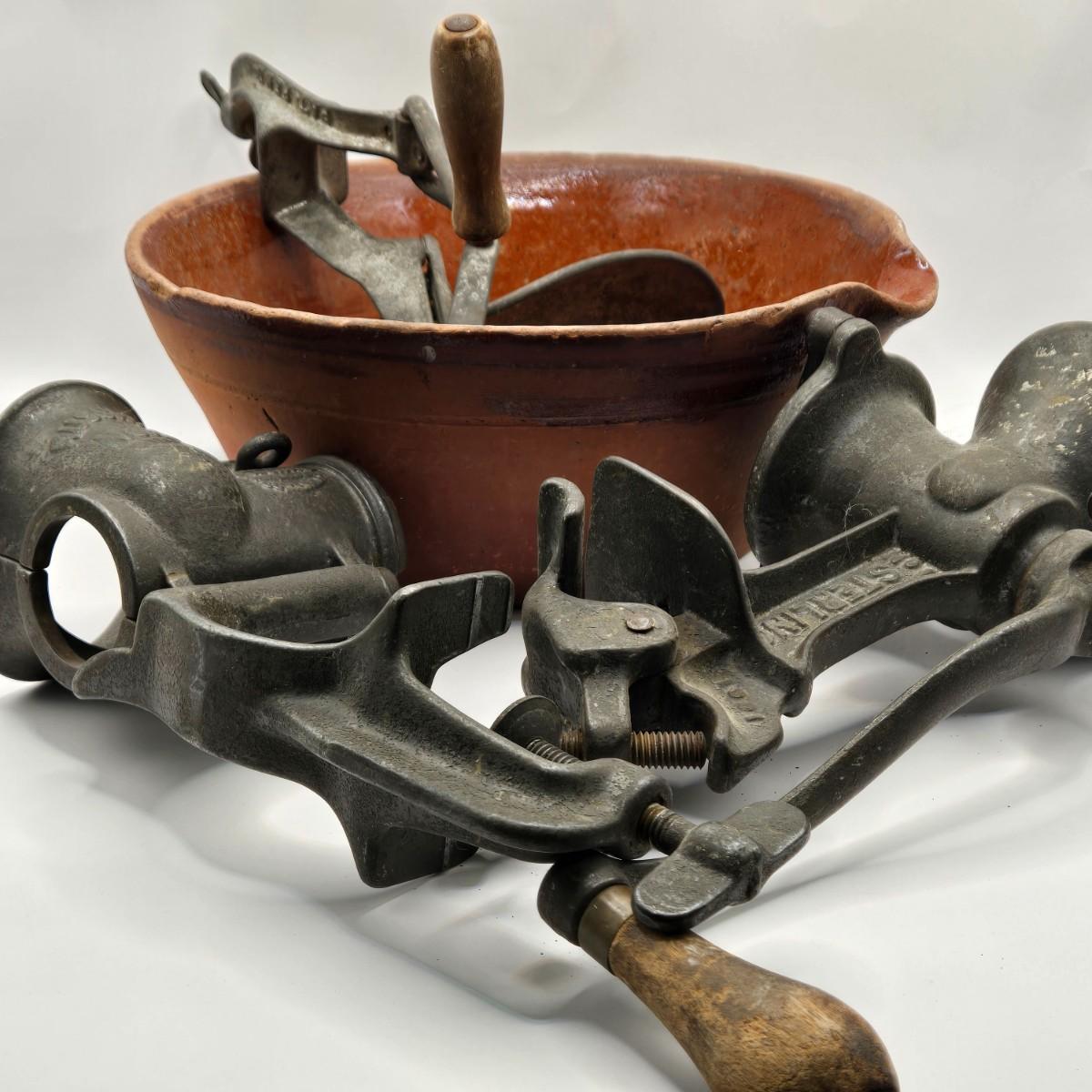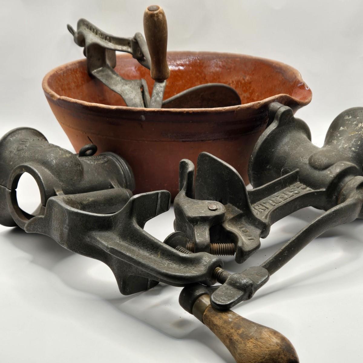 LOT 91B: Vintage Redware Bowl with Spout and Various Food Grinders