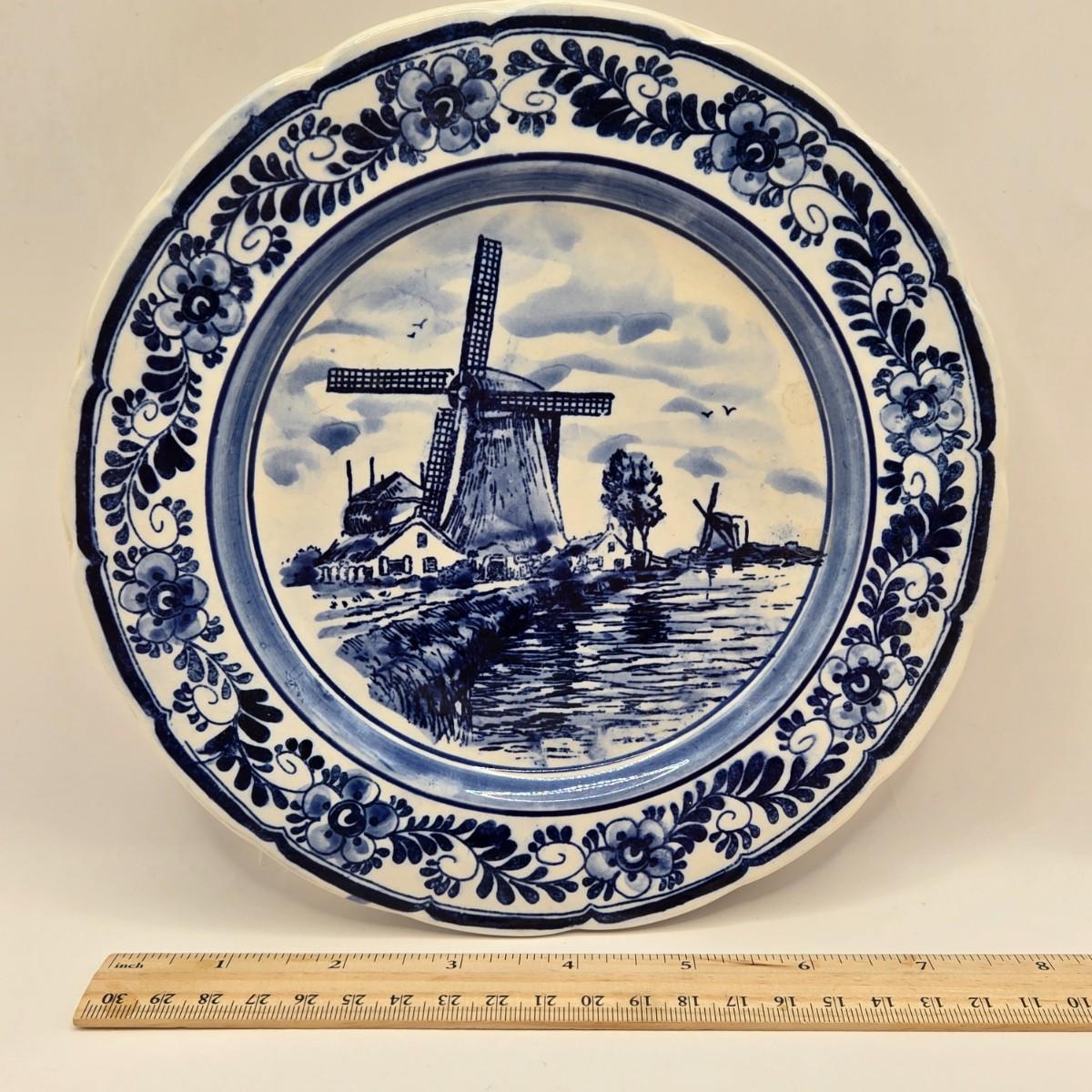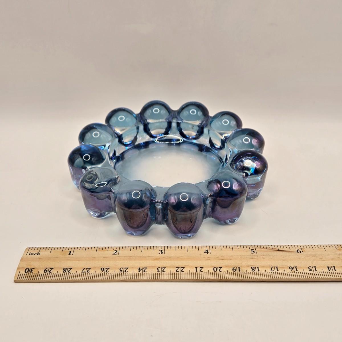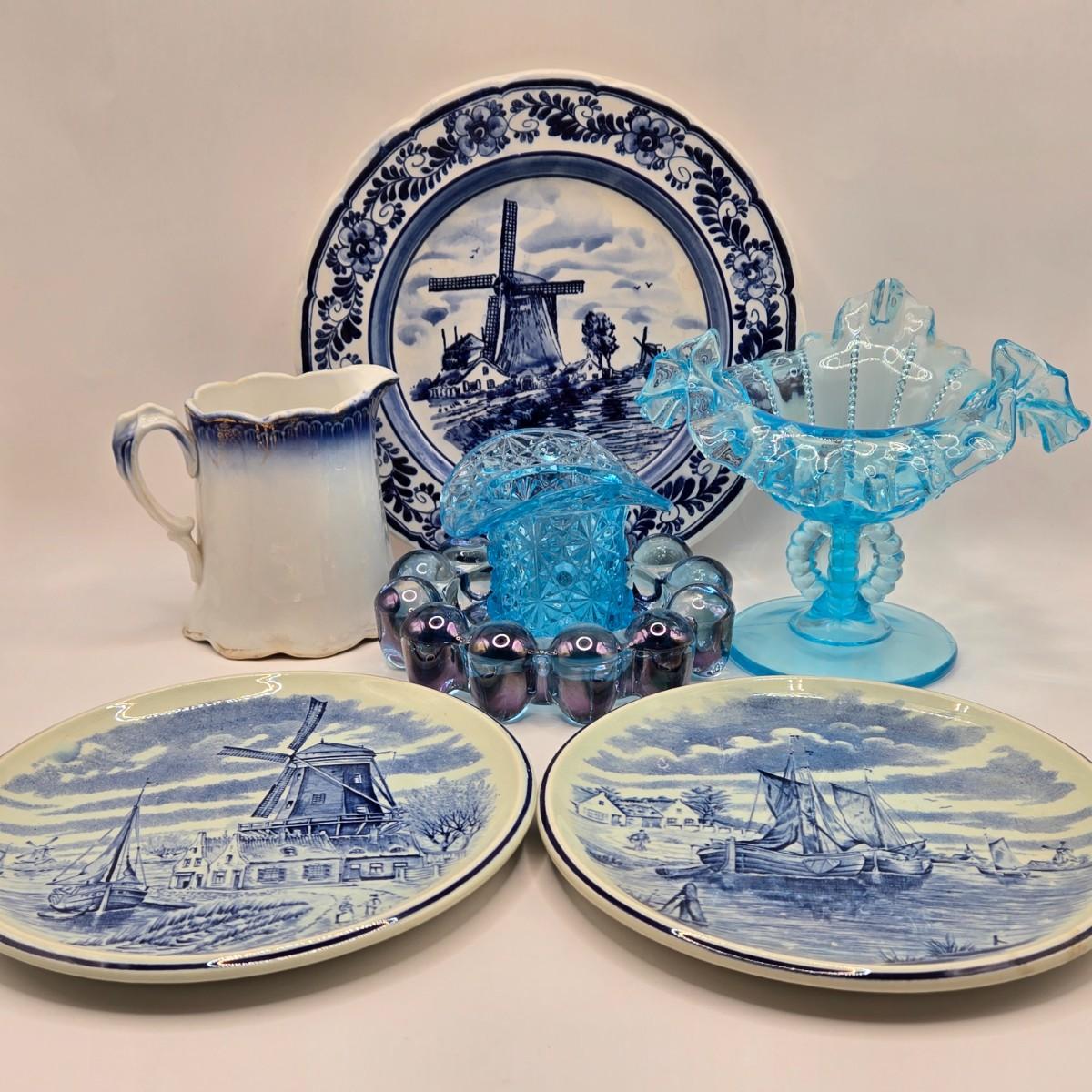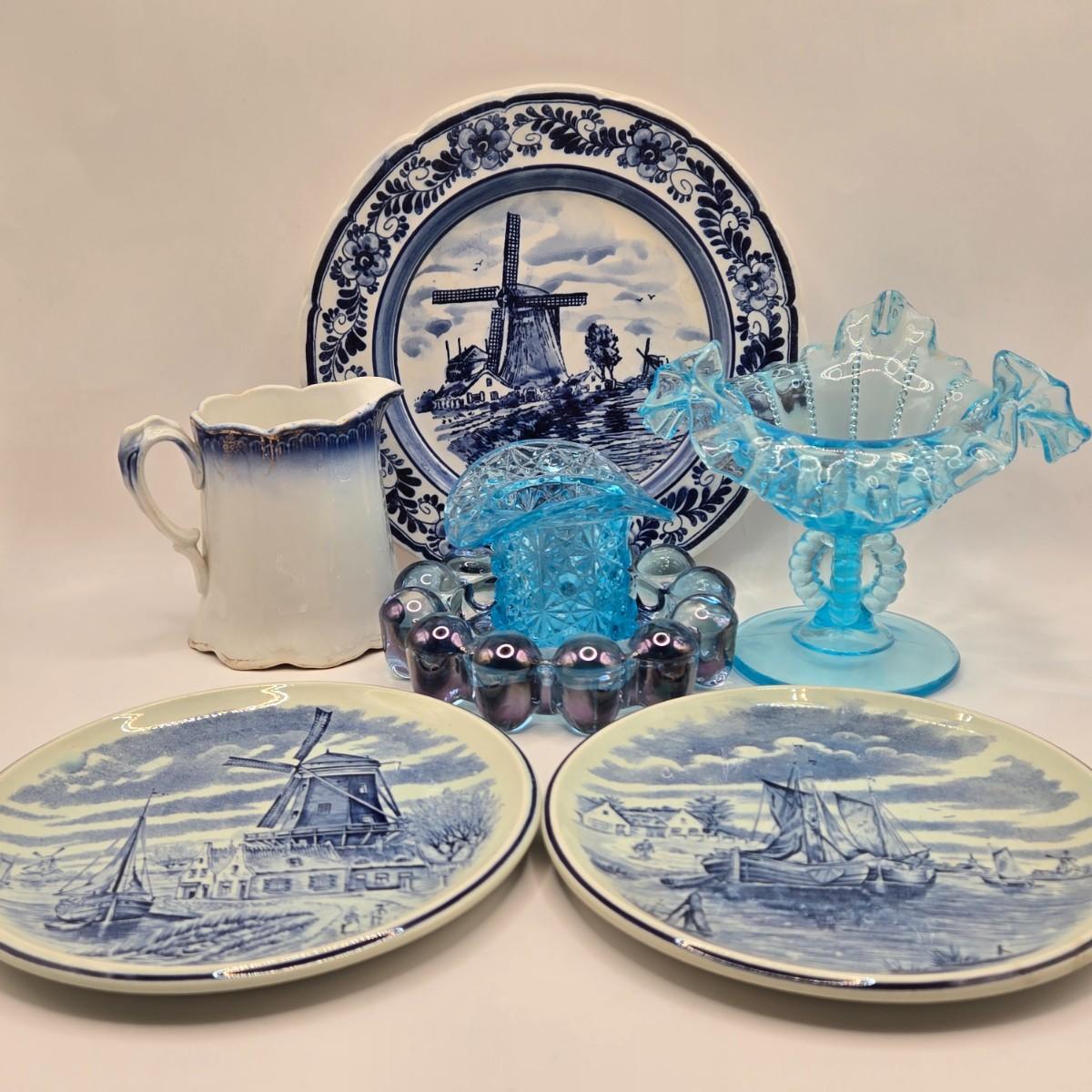LOT 96B: Three Delft Hand-Painted Plates, Boopie Bubble Glass Ashtray, Vintage Beaded Blue Ruffle Compote Dish, Cobalt Blue Rimmed Creamer, and Blue Top Hat Toothpick Holder