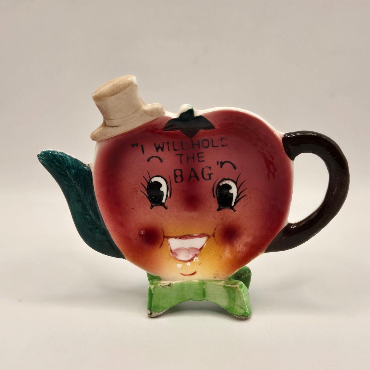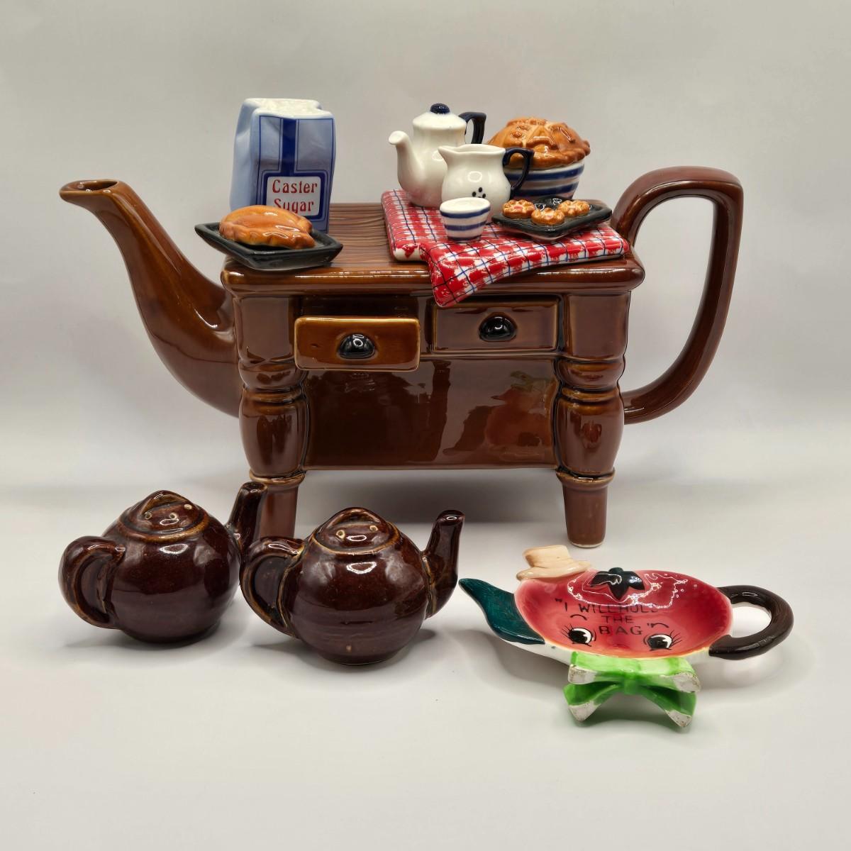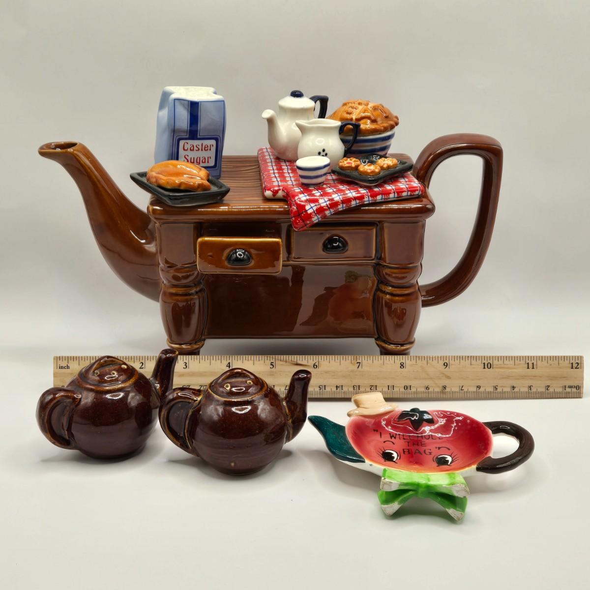 LOT 124K: Baking Day Tea Pot, Tea Pot Salt & Pepper shakers, and Apple Tea Bag Holder