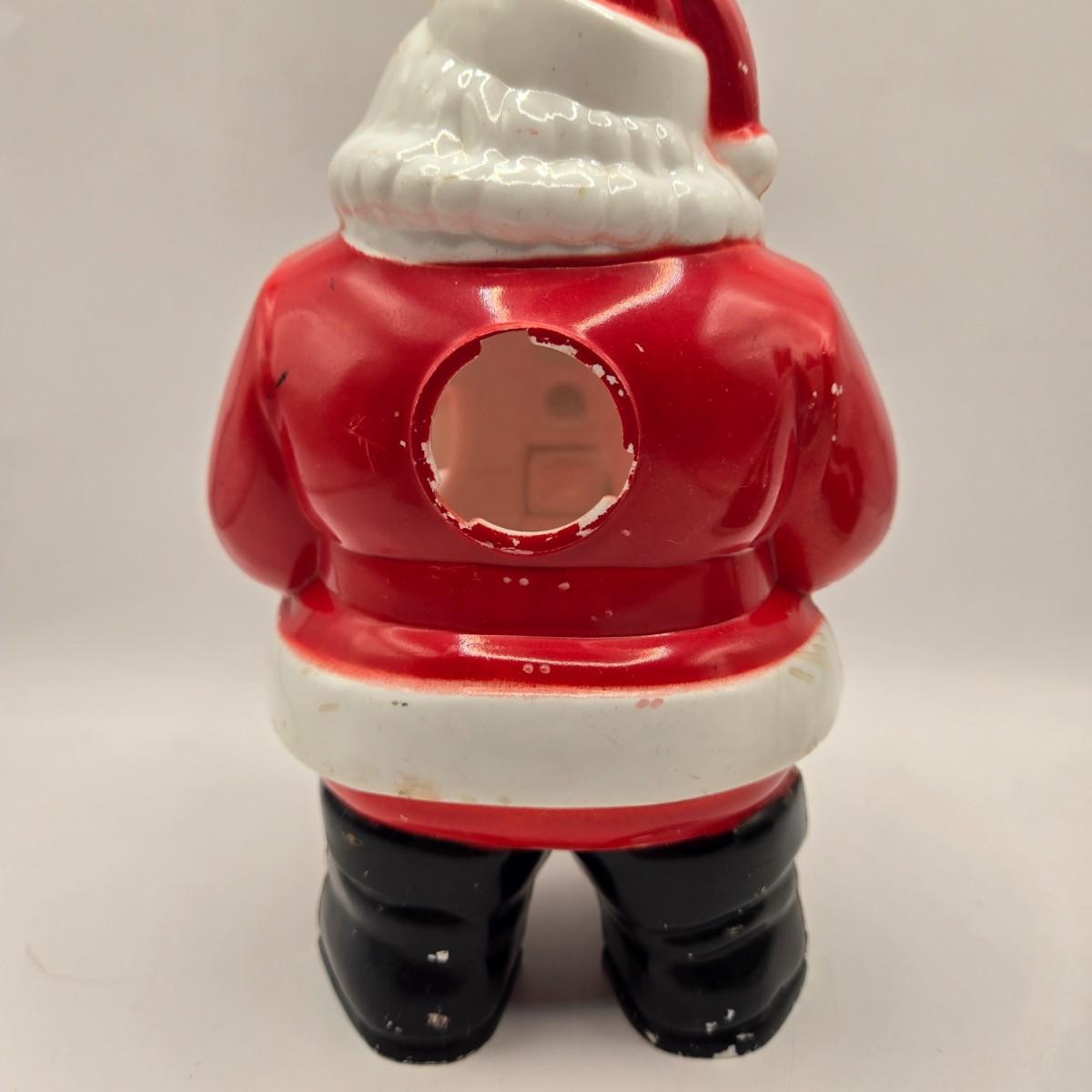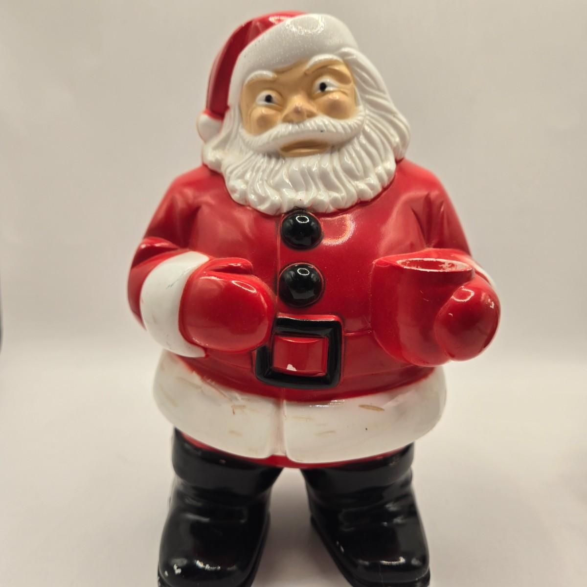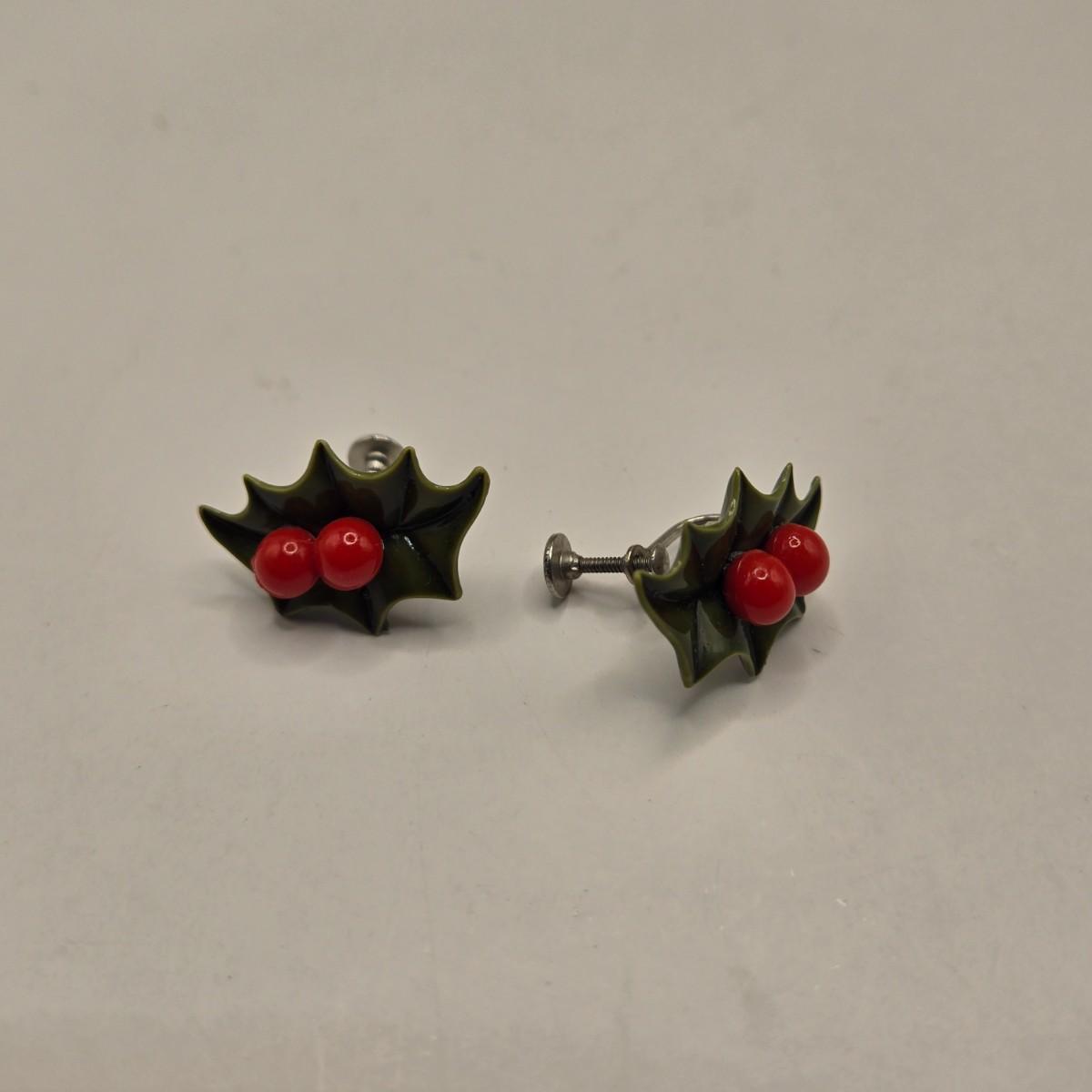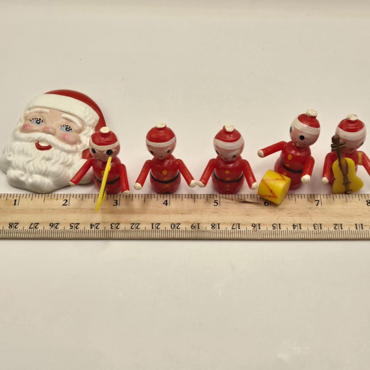 LOT 133K: Plastic Santa, Green Wooden Santa, Set of Coke-a-Cola Bears, Small Plastic Santas Playing Instruments, Clip on Holly Earrings, Santa Pin, and Small Wooden Santa