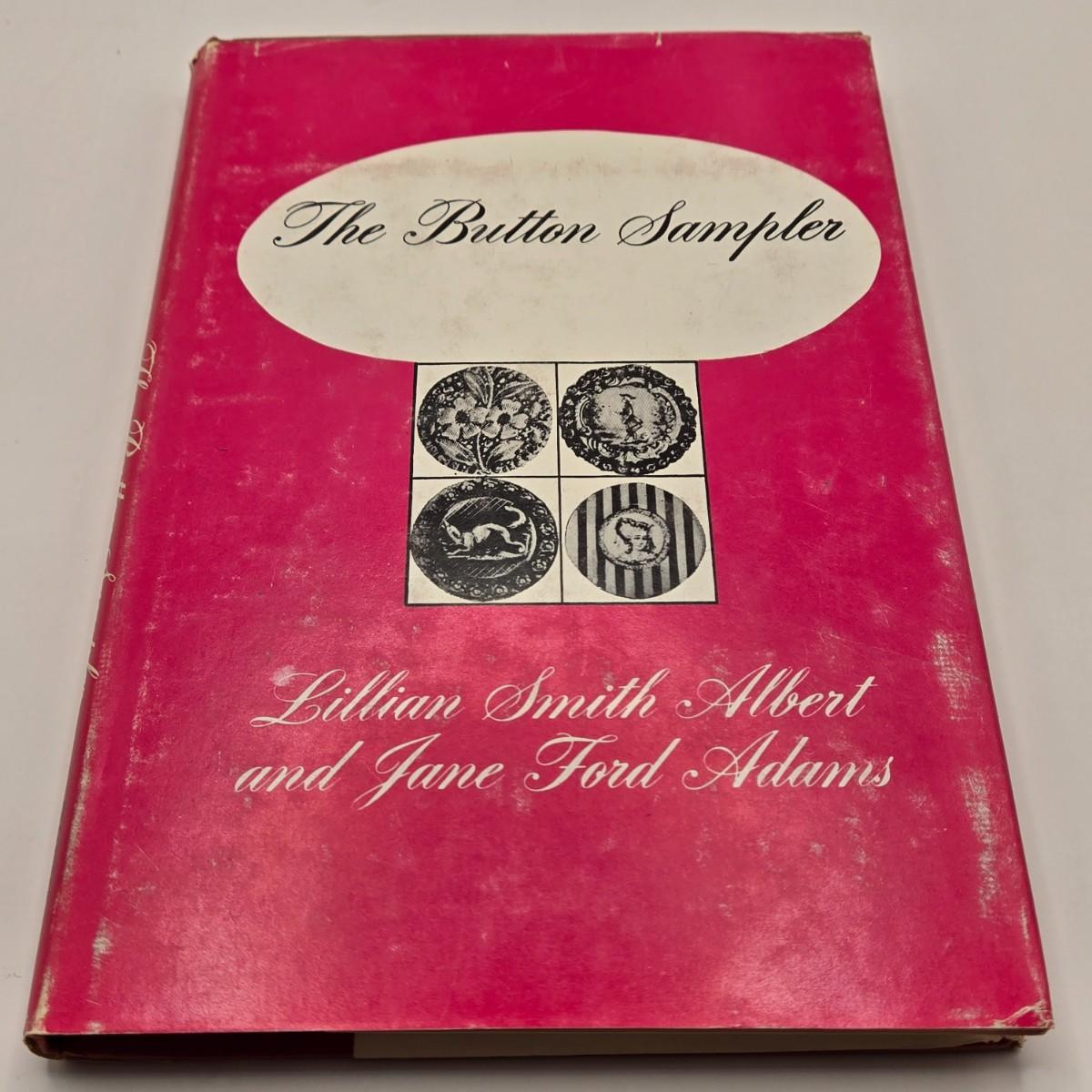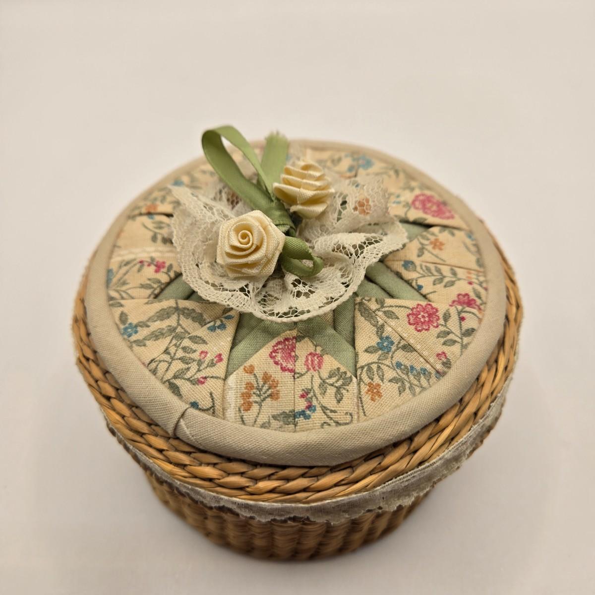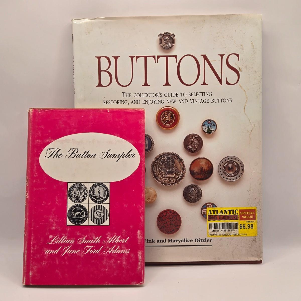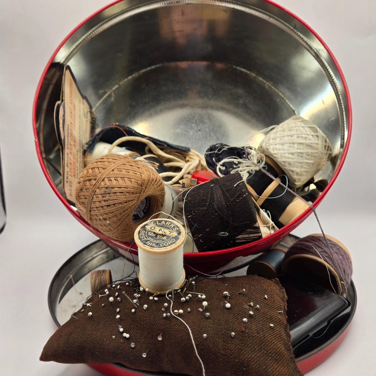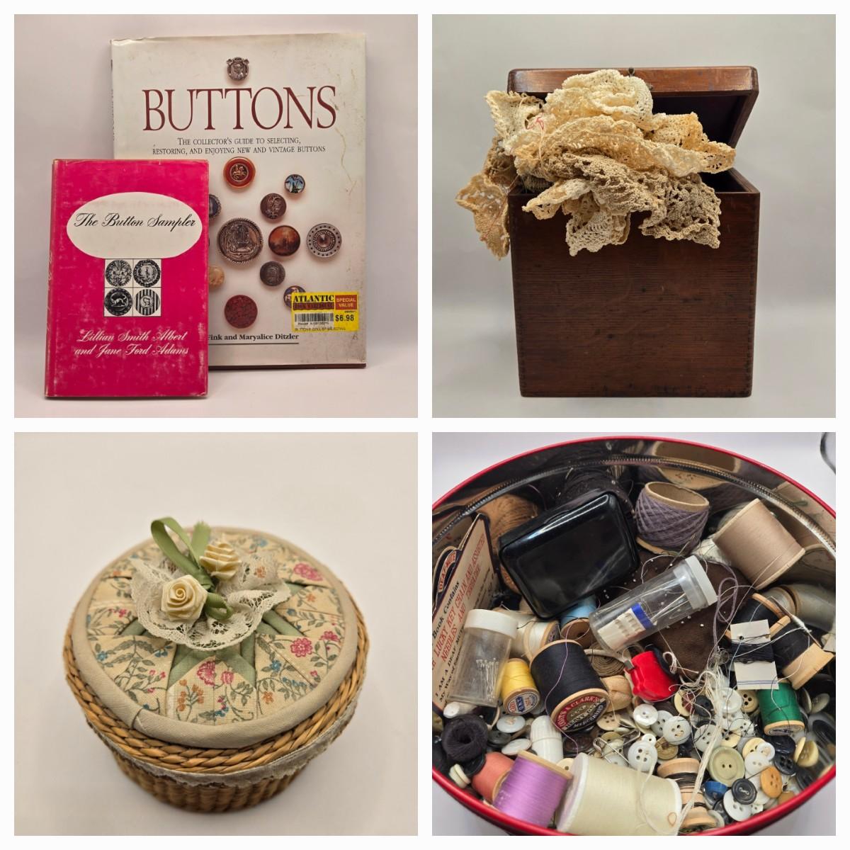 LOT 142K: Button Books For Collectors, Box of Hand Made Doilies with Thread, Small Basket of Pins and More, and Cookie Tin filled with Buttons, Pins, Thread, and More