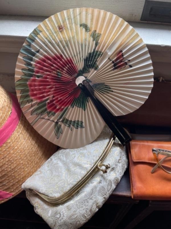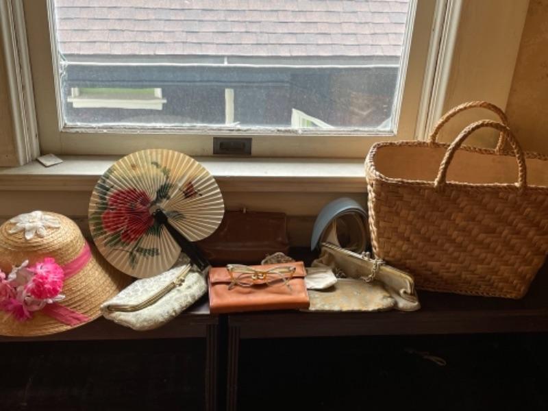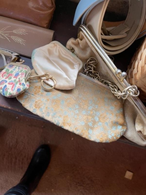 Lot 111B1. Vintage straw hat, coin purses, basket purse, belts, eyeglass frames--$75
