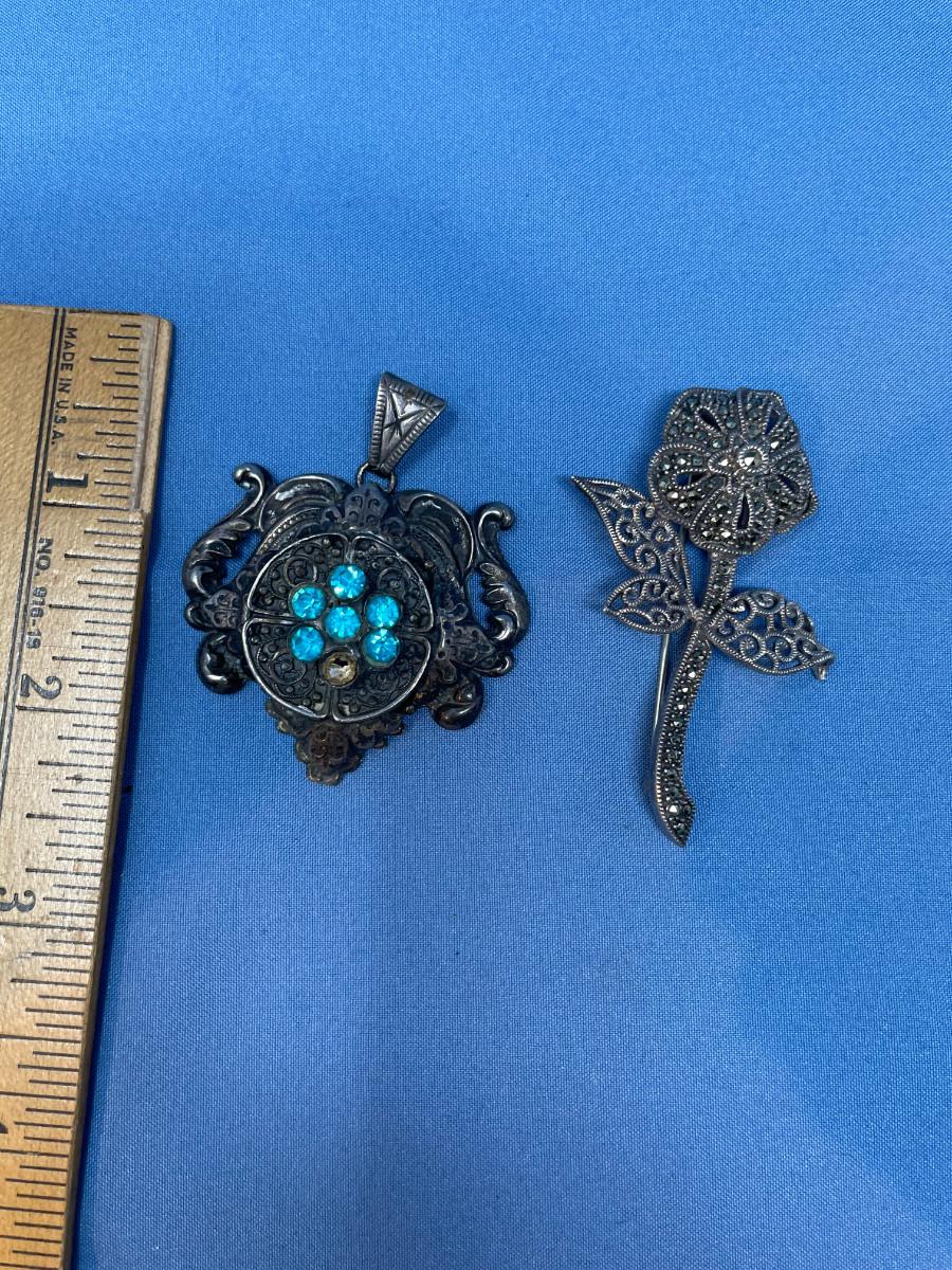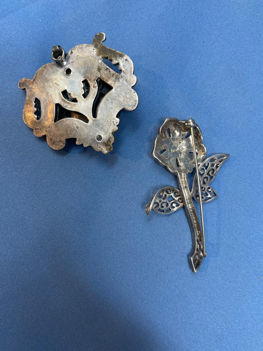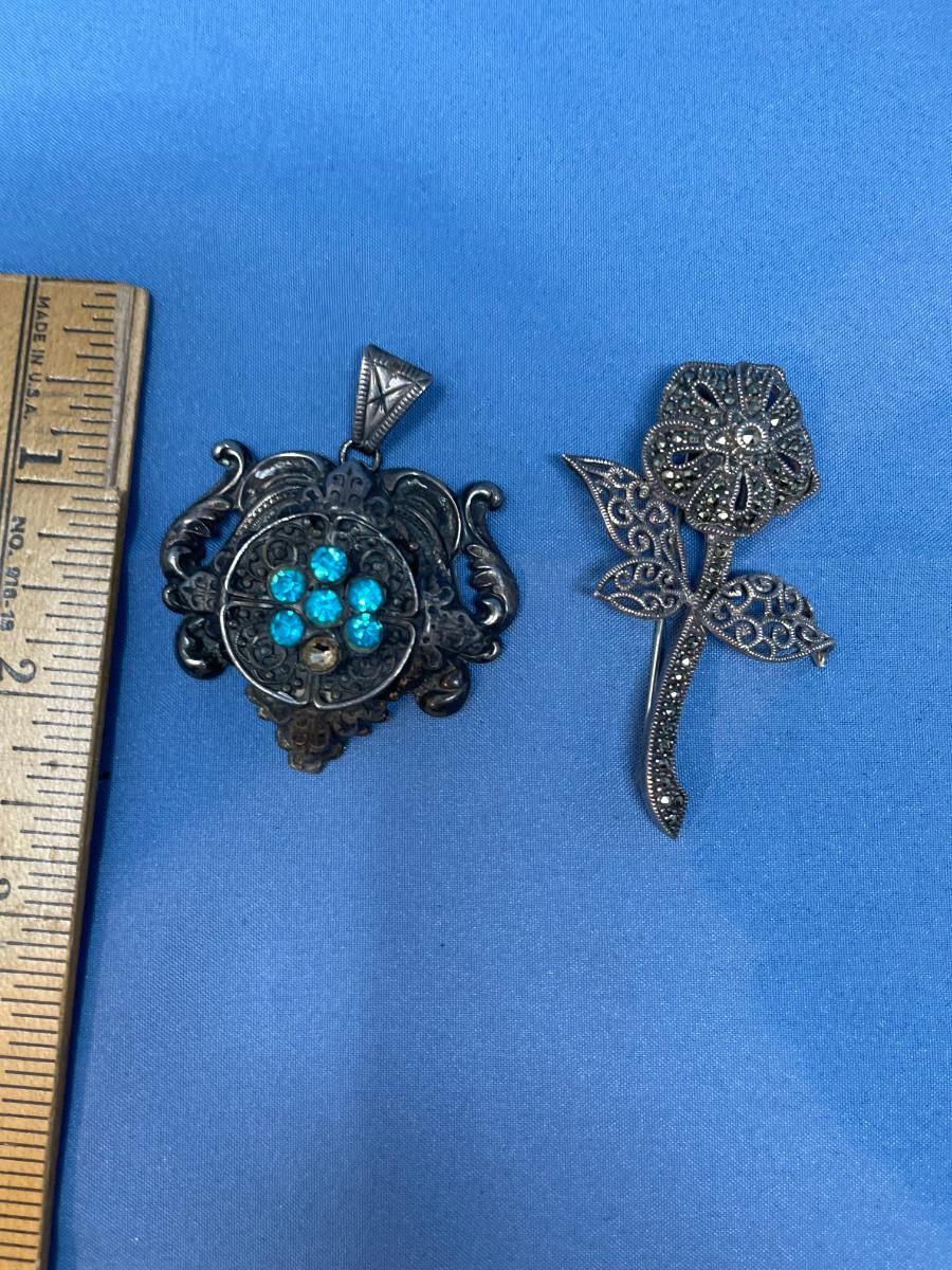 The pendant does have a stone missing. The rose brooch is great & ready to wear! 28.8 grams total weight.
