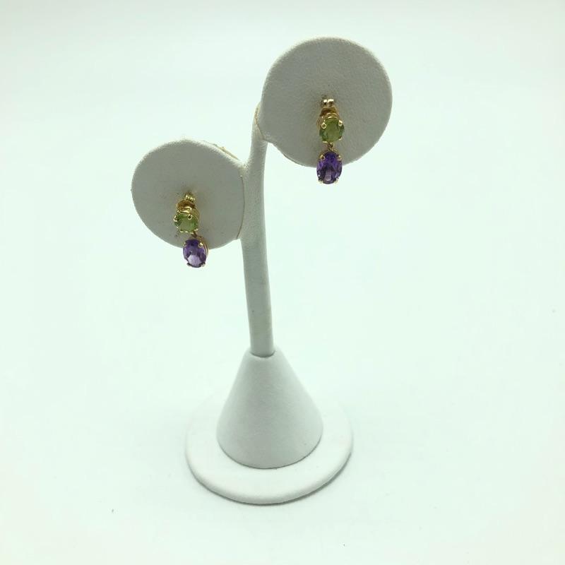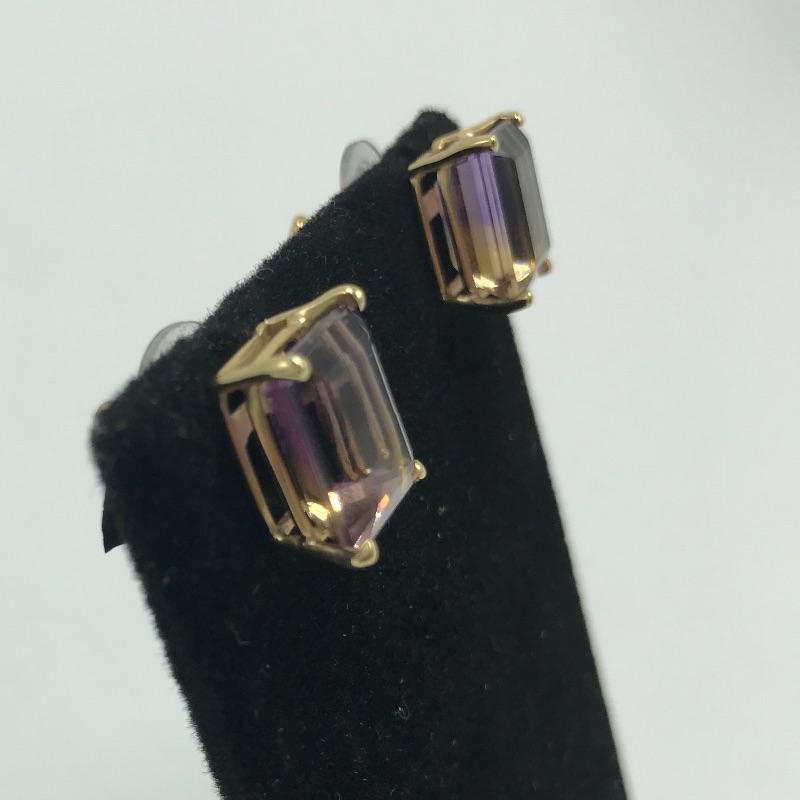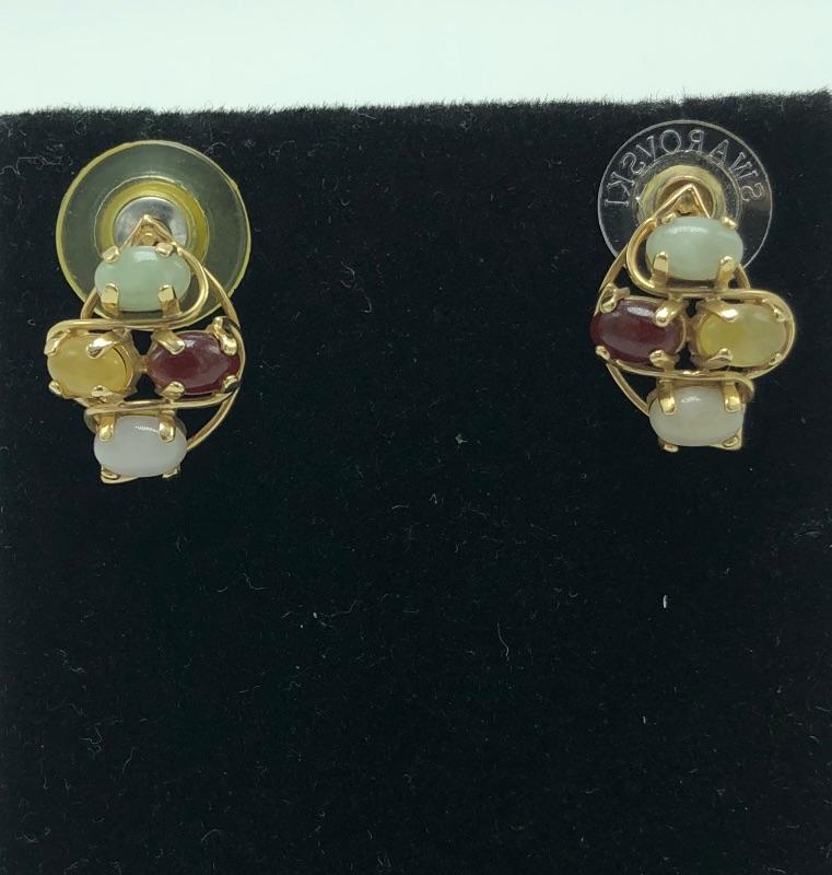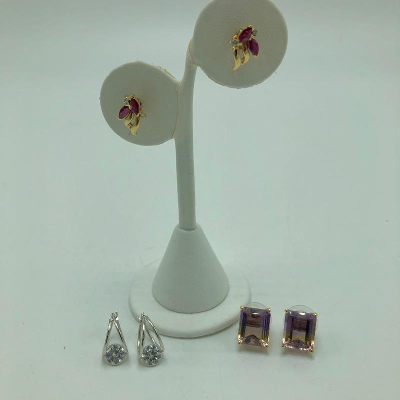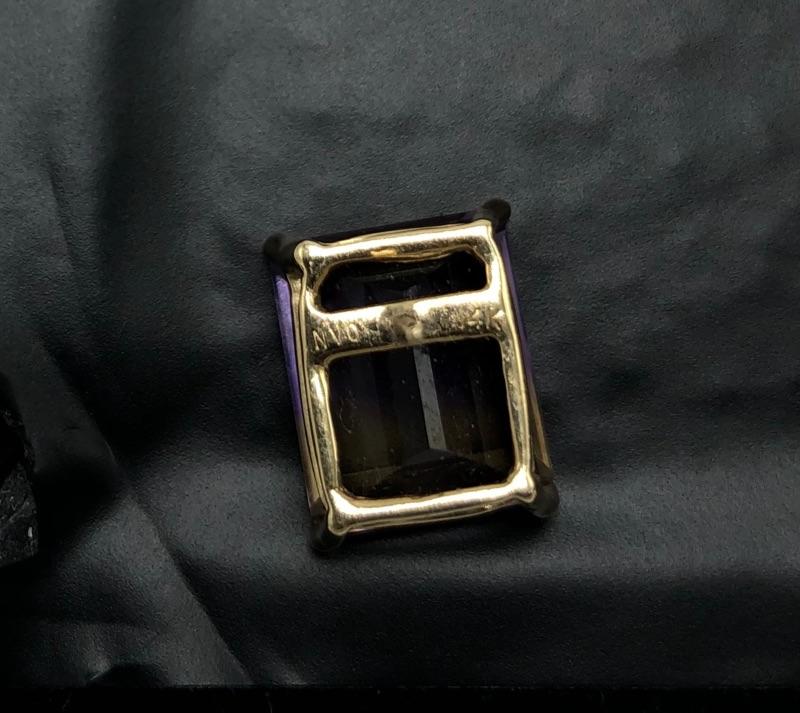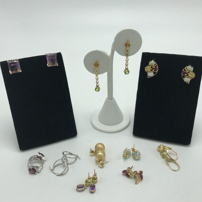 Super collection of 10 gold and precious stone earrings here. All are marked 14K, some also say Mexico. This lot is well worth coming for a closer look at our preview. Some pieces that are worth pointing out are the large Amethyst colored earrings that fade into more of a yellow color. We cannot verify if these are real Amethyst’s or not, but they are marked NVO( see photo of back of earring). The small earrings with red ruby stones were tested as diamonds but we can not guarantee these test results. Starting price based on melt value.