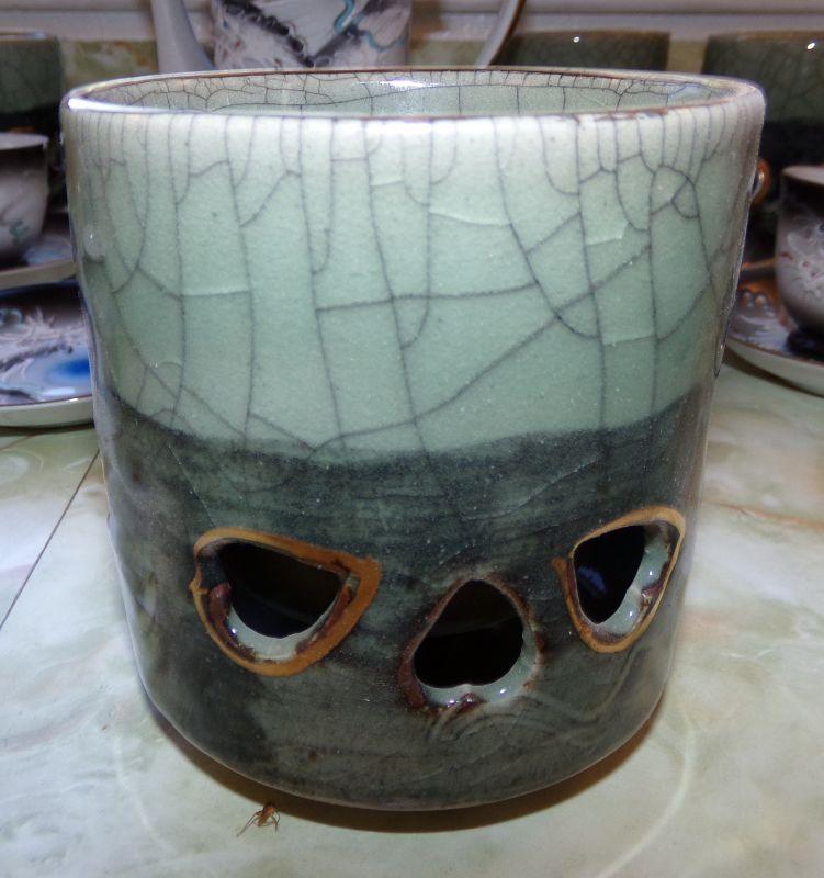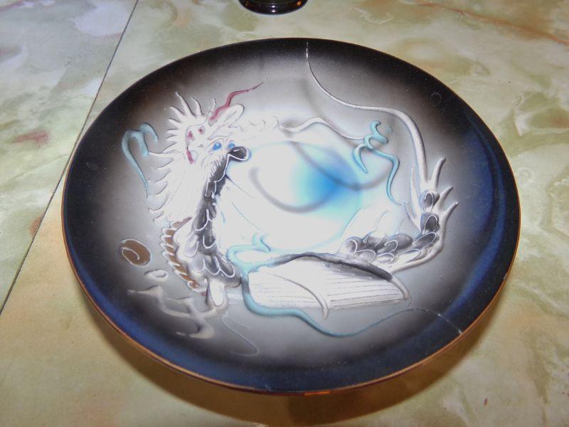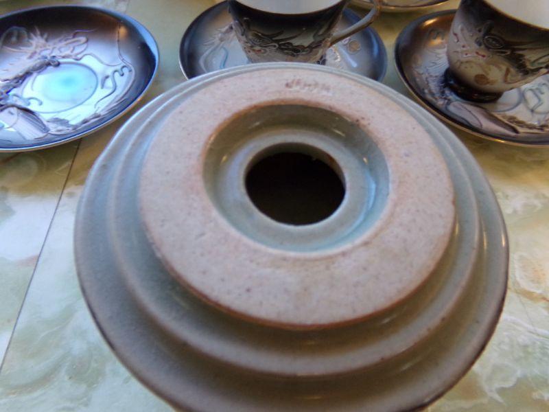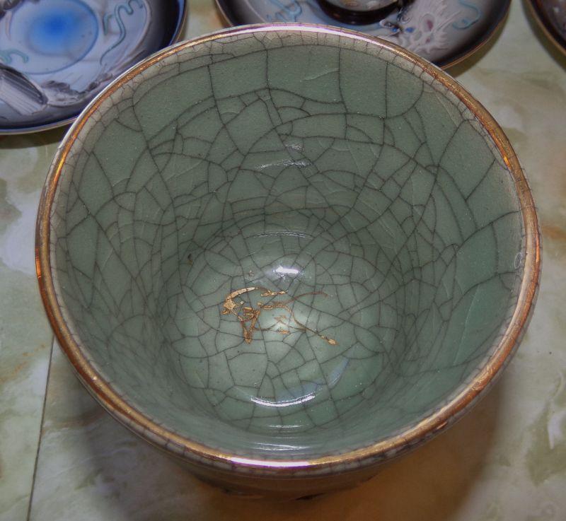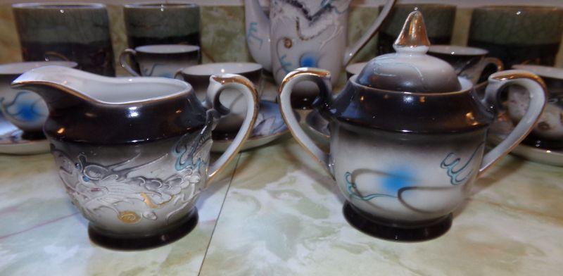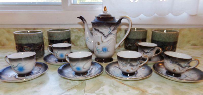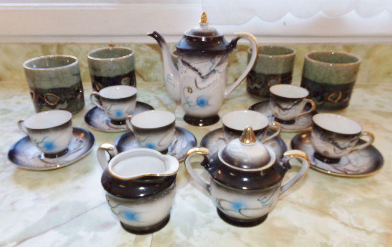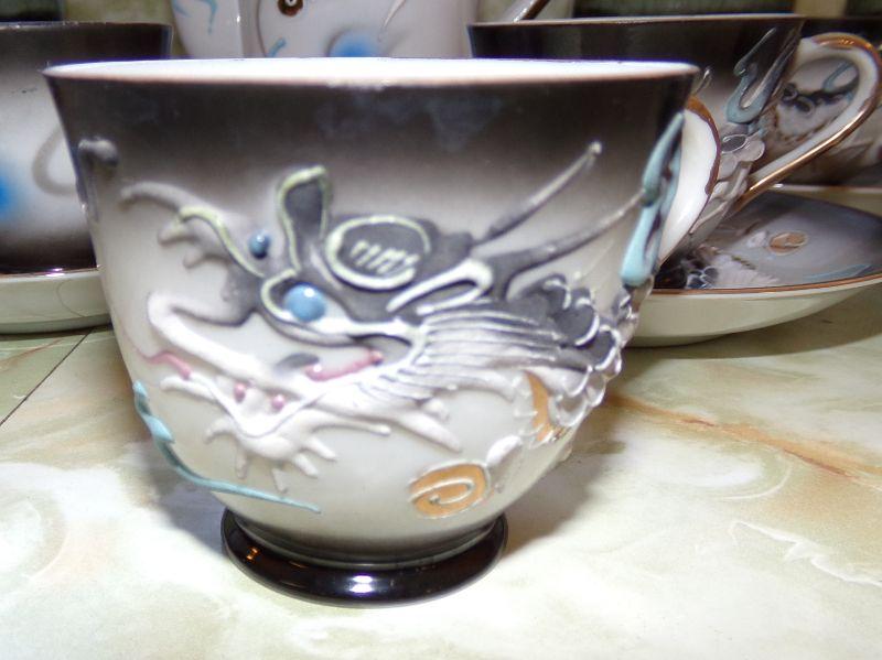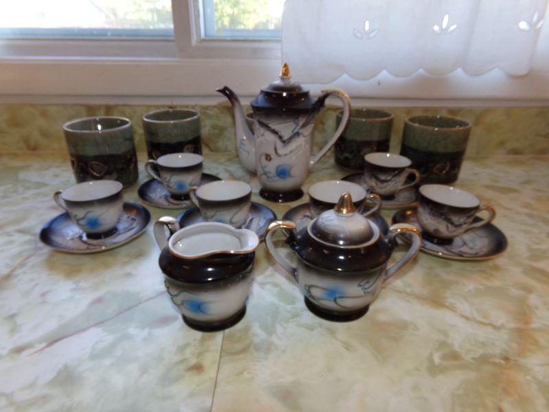 TEA SET MADE IN JAPAN AND 5 ASIAN THEMED CUPS THAT HAVE GOLD LOGO ON THE INSIDE BOTTOM OF CUP