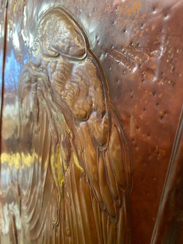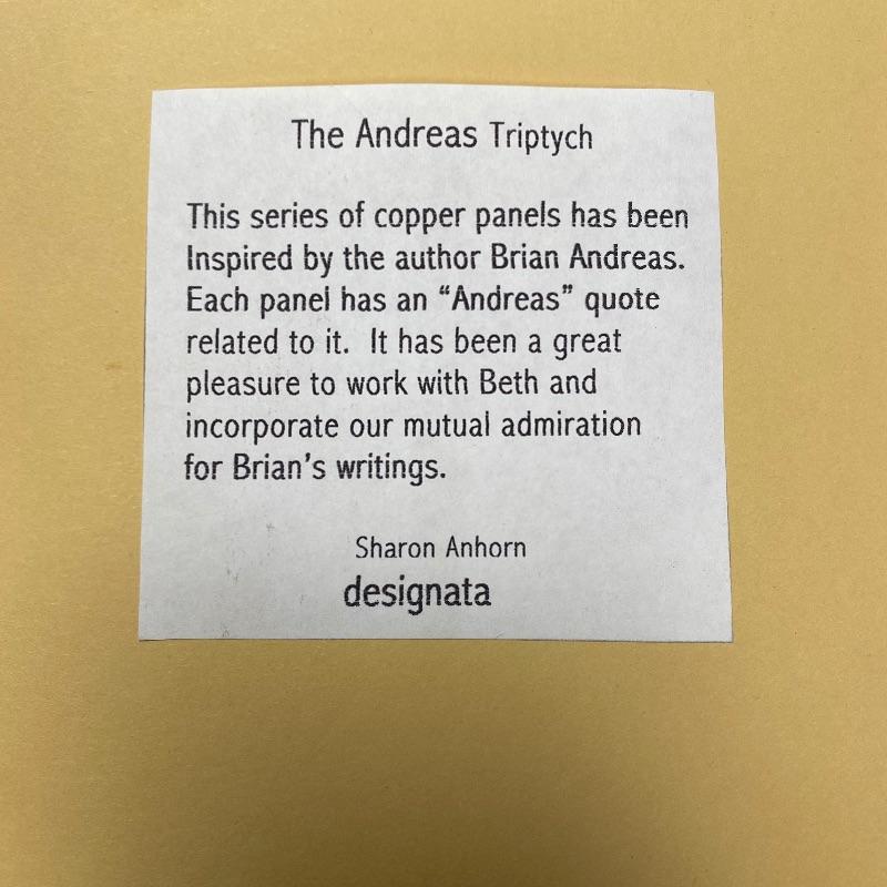 This is the third and final piece in the collection of copper presses commissioned by Sharon Shuster Anhorn. This piece is made from copper pressed onto a metal backing and inspired by works of Brian Andreas . The metal on the back has some staining from age and rust. There is a small booklet that explains the art, but is not available in this lot. This lot has copies of the booklet, the original accompanies lot 103. Photos of the booklet are here for viewing only. Panel measures about 60” x 25.” The other panels are found in lots 103 and 107. Buy one or buy the set! Last photo is to show perspective of size using the first of the three panels