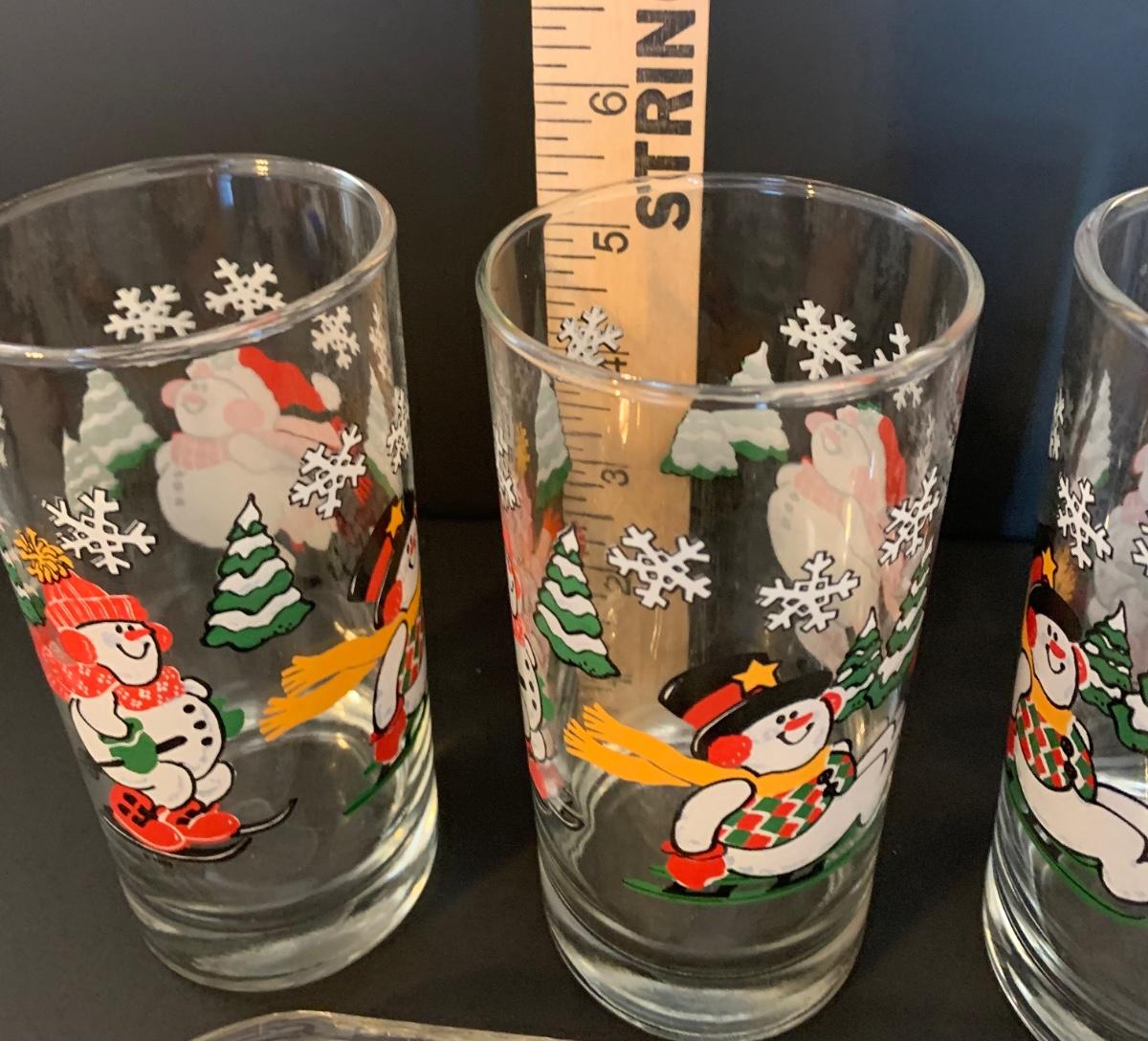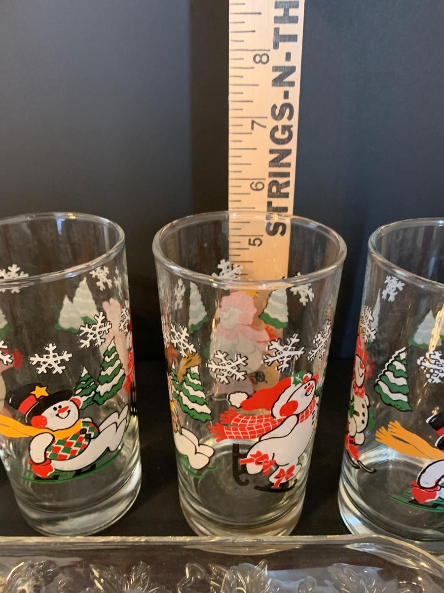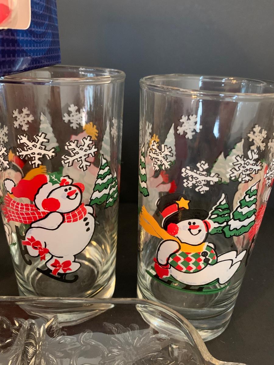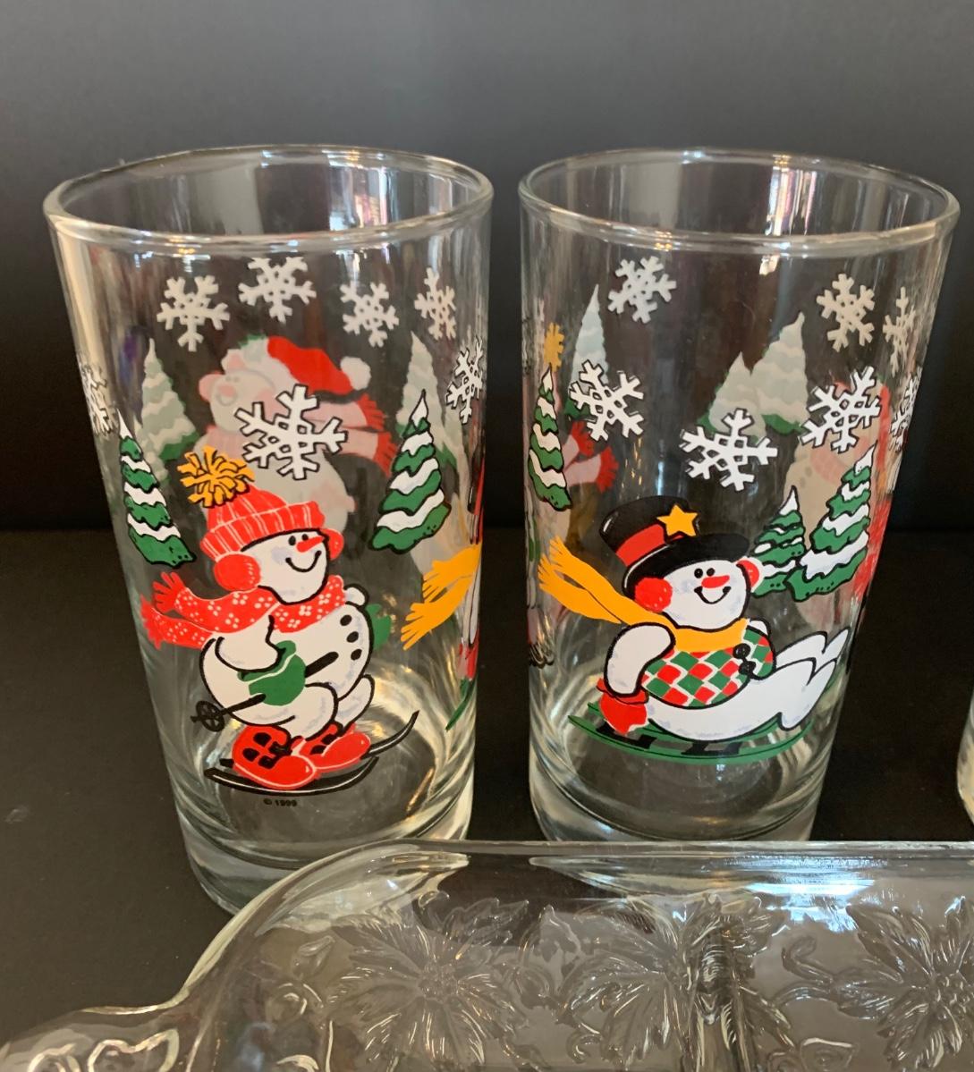 Nice collection of snowmen themed glasses, serving tray and ornaments