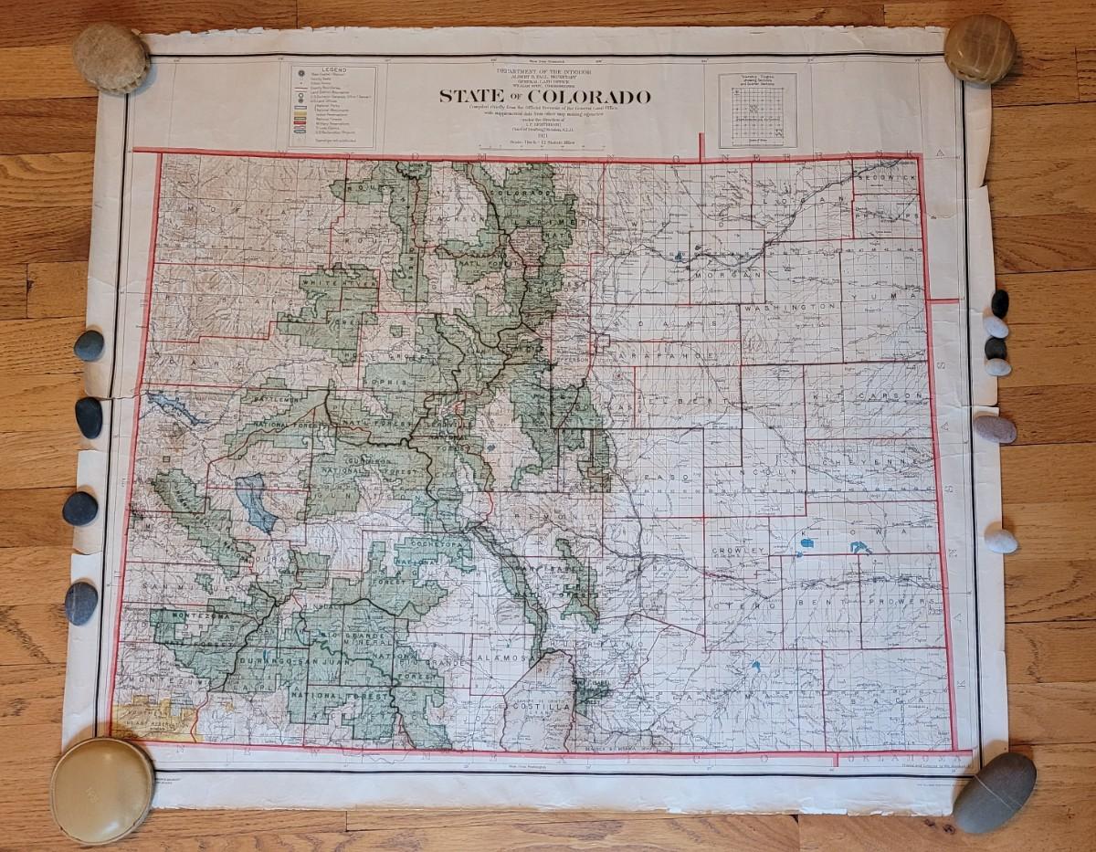 Department of the InteriorAlbert H. Fall SecretaryGeneral Office Land OfficeWilliam Spry, CommissionerState of ColoradoCompiled chiefly from the Official Recordsof the General Land Office...I.P. Berthrong.Issued Washington, D.C. 1921 by Columbia Planograph for the U.S. Department of the Interior.Remarkably detailed oversized early 20th century vintage color lithographed map.Legend at top (to left of title) denotes boundaries, offices, parks, monuments, reservations, reclaimation projects, private claims, etc.